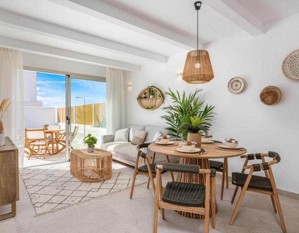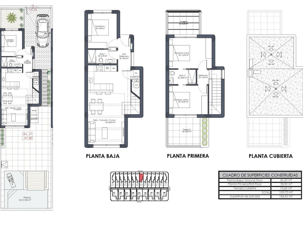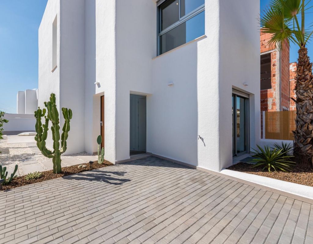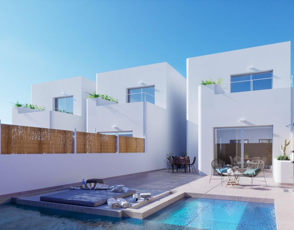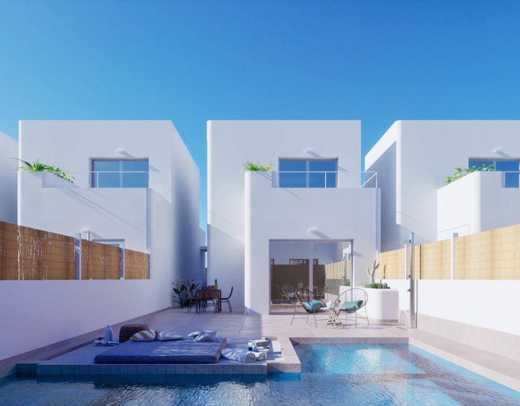 VILLAS DE OBRA NUEVA DE ESTILO IBICENCO EN LOS ALCAZARES Villas de estilo ibicenco construidas en 2 plantas, dispone de 3 dormitorios, 2 baños, salón, cocina, terraza, zona de aparcamiento y piscina privada. Posibilidad de solarium privado con coste adicional. Viviendas cuidadosamente diseñadas con materiales de alta calidad para satisfacer a los clientes más exigentes. Villas situadas a 1 km de la playa y del pueblo de Los Alcázares, donde se pueden practicar diversos deportes náuticos, rodeados de varios campos de golf. Ciudad de Cartagena a menos de 15 minutos en coche y a 30 minutos del aeropuerto de Murcia Corvera.