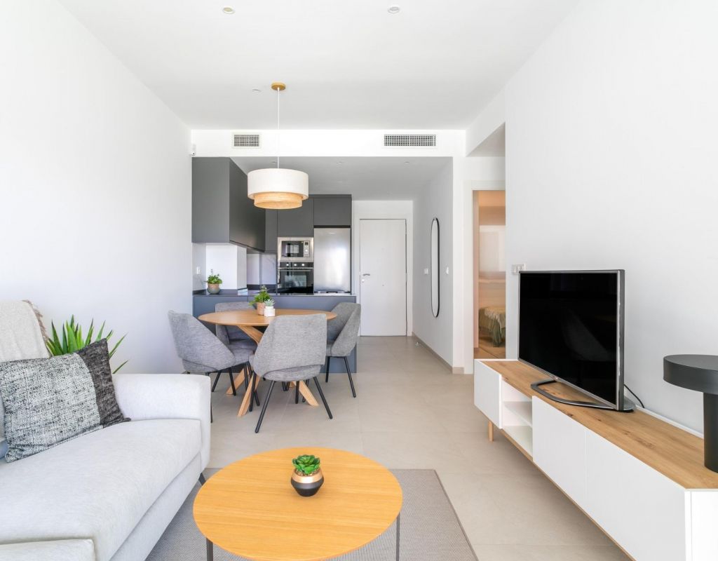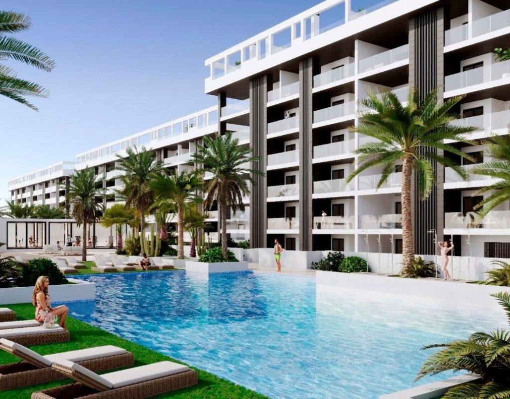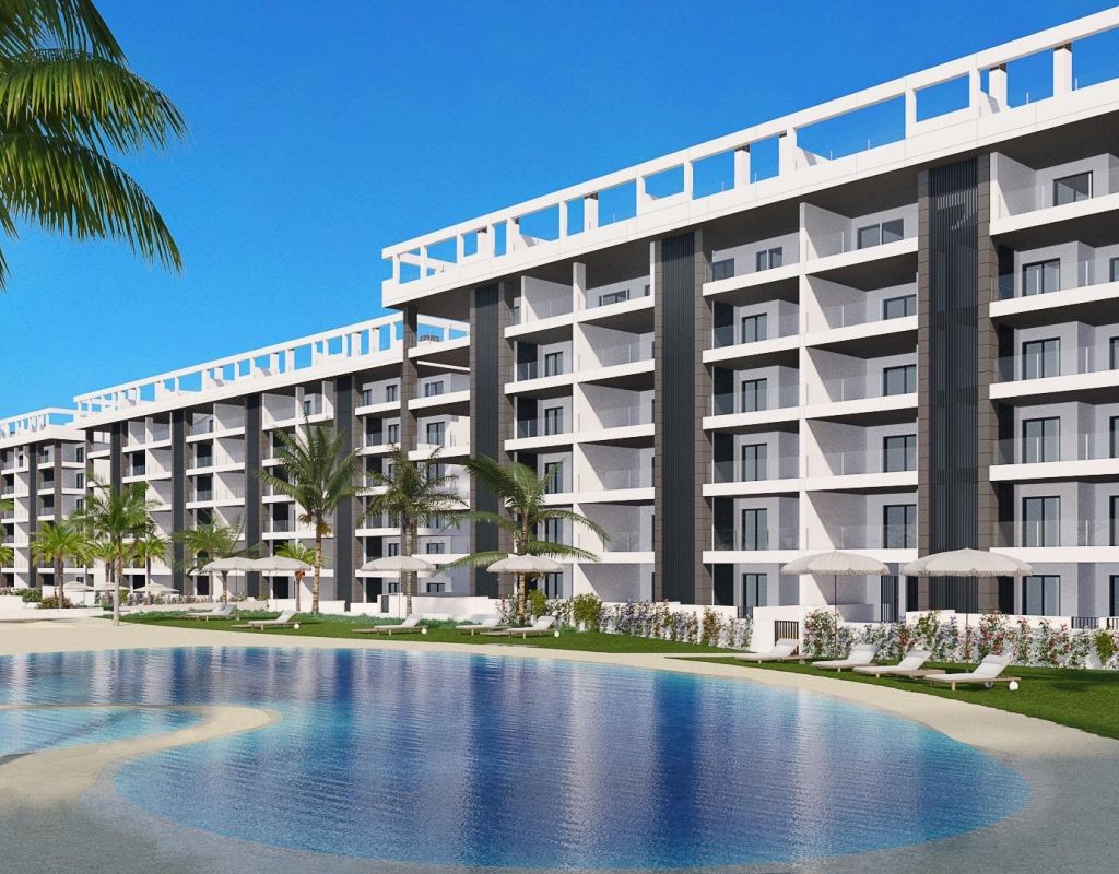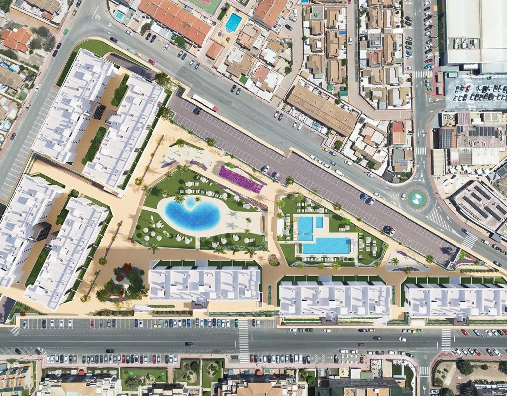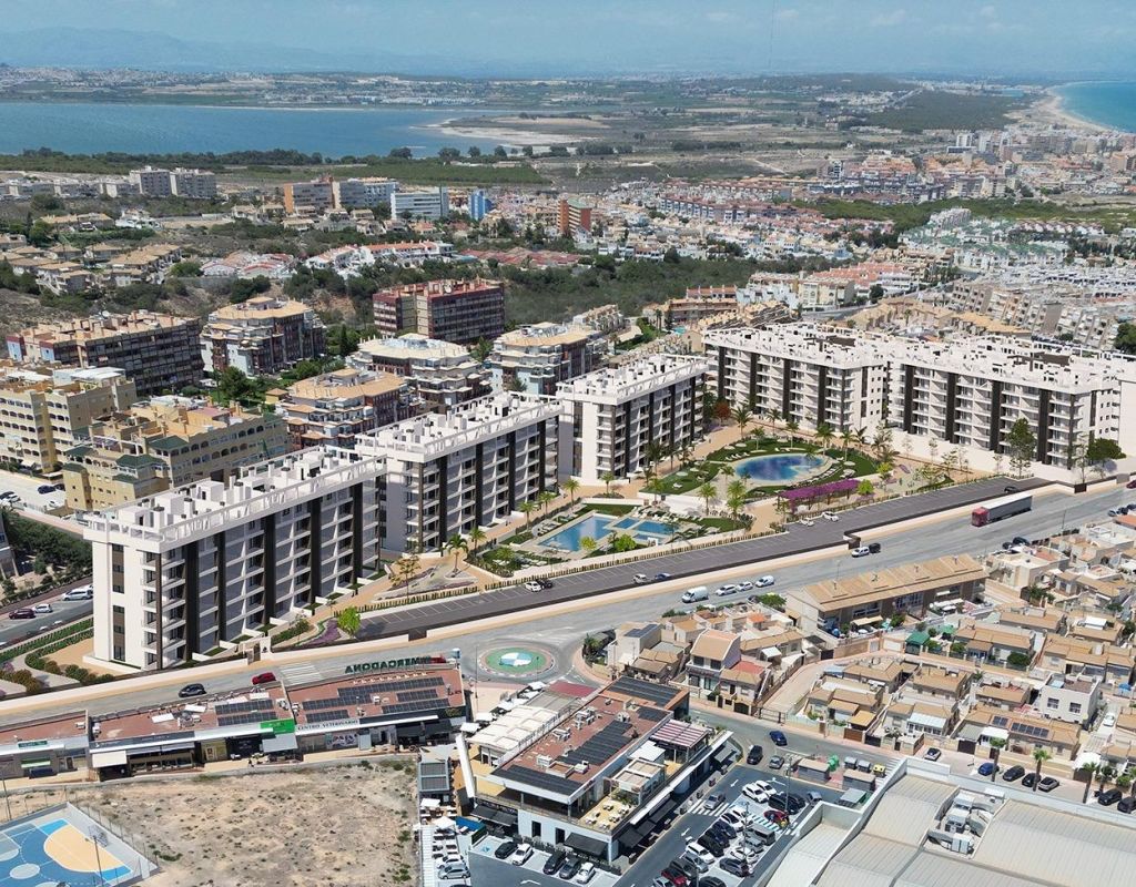 URBANIZACION CERRADA DE OBRA NUEVA EN TORREVIEJA A SOLO 700M DE LA PLAYA Complejo residencial de nueva construcción de 362 apartamentos con amplias zonas comunitarias en Torrevieja. Puede elegir entre lujosos apartamentos de 2 dormitorios y 2 baños, áticos de 3 dormitorios y 2 baños con solarium privado y apartamentos de 2 dormitorios y 2 baños en planta baja con jardín privado. -Diseños modernos y acabados y materiales de calidad -Casi todos los apartamentos tienen vistas al mar -Todos los apartamentos cuentan con amplias terrazas frontales orientadas a las zonas comunitarias -Zonas comunitarias con dos piscinas para adultos, piscina para niños, zona infantil, gimnasio, zona deportiva y spa, aparcamiento de bicicletas y zona de aparcamiento de vehículos -700 metros hasta la playa de La Mata, 10 minutos andando -Enfrente del Centro Comercial Torremarina con Mercadona, restaurantes, cafeterías y otras tiendas Torrevieja es una ciudad española de la provincia de Alicante, en la Costa Blanca. Es conocida por su clima y su costa típicamente mediterráneos. Cuenta con paseos marítimos con complejos turísticos a lo largo de sus playas de arena. El pequeño Museo del Mar y la Sal alberga exposiciones sobre la historia pesquera y salinera de la ciudad. En el interior, el Parque Natural de las Lagunas de La Mata-Torrevieja cuenta con senderos y dos lagunas saladas, una rosa y otra verde. El aeropuerto de Alicante se encuentra a 40 minutos y el de Murcia a una hora.