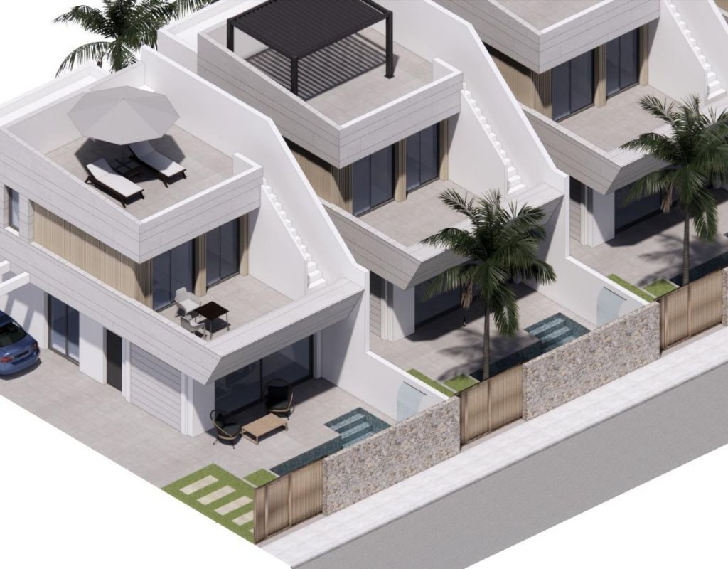 VILLAS DE OBRA NUEVA EN SAN JAVIER Proyecto de obra nueva de villas independientes en San Javier. Las villas de obra nueva se distribuyen en dos plantas más la amplia azotea con bonitas vistas de los alrededores. En la planta baja hay un luminoso salón con cocina americana y acceso a la terraza, un dormitorio doble con armario empotrado y un baño. En la primera planta hay 2 amplios dormitorios, uno con armario empotrado y el otro con vestidor y baño en suite. Jardín privado con la piscina y plaza de aparcamiento. San Javier está cerca de todos los servicios con fácil acceso a la playa, deportes acuáticos, tiendas y la red de transporte. Aquí se puede disfrutar de todas las instalaciones que San Javier tiene para ofrecer, como las tiendas locales, bares y restaurantes, así como estar cerca de centros comerciales, el aeropuerto de Murcia y todos los hermosos lugares que se encuentran a lo largo del Mar Menor. El aeropuerto de Corvera/Murcia está a 30 minutos y el aeropuerto de Alicante a 45 minutos.