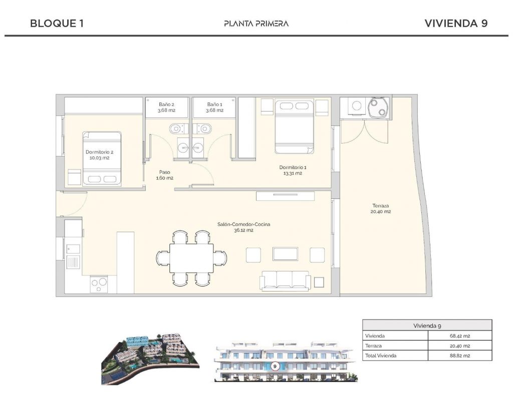 COMPLEJO RESIDENCIAL DE OBRA NUEVA EN FINESTRAT Complejo residencial de obra nueva en Balcon de Finestrat. Este complejo de apartamentos modernos con 2 dormitorios, 2 baños, cocina americana con la sala de estar. Algunos de los apartamentos tienen vistas al mar. Apartamento de planta baja con un jardín, apartamentos de planta media con las terrazas y apartamentos de planta alta tiene una terraza y solarium privado. Cada propiedad tiene plaza de aparcamiento subterráneo privado. Las viviendas tienen acceso a la zona comunitaria con 3 piscinas, parking, paddle, parque infantil, calistenia. Es una gran oportunidad y privilegio poder vivir con este entorno de golf y playa, cerca de todas las comodidades de todos los servicios considerado uno de los mejores lugares para invertir. Finestrat situado en la comarca de la Marina Baixa de la Costa Blanca. Benidorm está a sólo cinco minutos en coche de las propiedades y ofrece todos los servicios que pueda necesitar, incluyendo tiendas, bares, restaurantes, supermercados, bancos, farmacias y varias escuelas privadas internacionales. Cerca de las playas de Levante, Poniente y Cala de Finestrat, con más de 6km de longitud que se encuentran entre las mejores de Europa galardonadas por la Unión Europea con Banderas Azules. Todos los servicios de ocio como los parques temáticos de Aqua Natura, Terra Mítica, Terra Natura, Aqualandia y Mundomar, los campos de Golf Sierra Cortina y Villaitana, senderismo y escalada en el Puig Campana un marco natural incomparable o disfrutar de los deportes náuticos. Distancia al mar 4 km, al aeropuerto 26 km y al golf 1km.