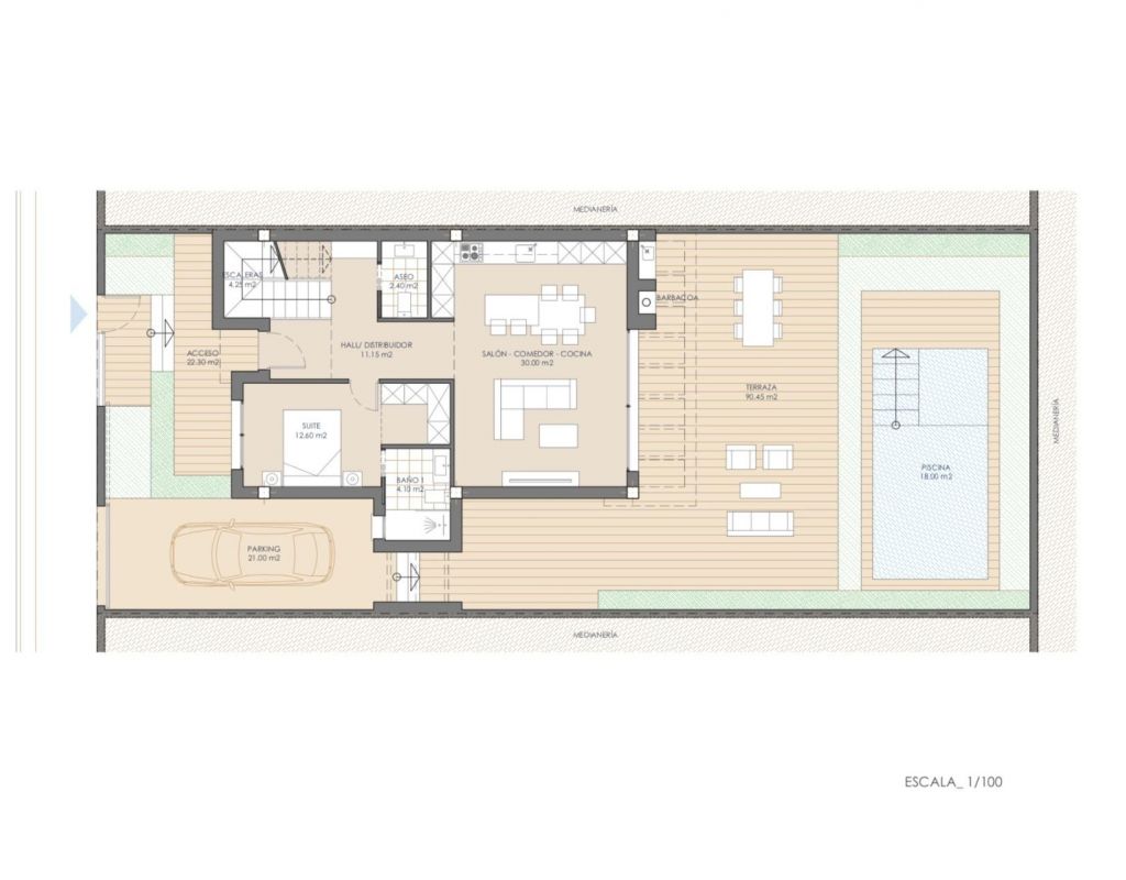 VILLAS DE OBRA NUEVA EN SAN JUAN DE LOS TERREROS La arquitectura contemporánea e innovadora de las villas modernas llega para crear un complejo residencial situado en la localidad de San Juan de los Terreros en Pulpí, Almería, en el sur de España. Estas cuidadas viviendas y complejo residencial combinan un excepcional nivel de diseño y calidad con los más altos estándares de sostenibilidad y bienestar. Viviendas meticulosamente diseñadas por el equipo técnico de arquitectos, para que la luz, la amplitud y la orientación doten a cada vivienda y parcela de un carácter especial. Espacios únicos que abren la puerta a un nuevo estilo de vida para disfrutar. La cimentación y estructura de las viviendas están resueltas con hormigón armado y bajo garantía decenal. Fachadas diseñadas para reducir la demanda energética de la vivienda, combinadas con diversos materiales para conseguir una estética coherente en cuanto a composición y color como se refleja en la infografía. Amplias terrazas dotadas de sólidos antepechos para proporcionar seguridad en las barandillas de las terrazas, otorgando amplitud y luminosidad. Los cerramientos exteriores de la parcela se tratarán con los mismos materiales utilizados en la vivienda, garantizando la integración en el conjunto residencial. Cubiertas planas ventiladas y aisladas sobre forjados, con diferentes acabados según su ubicación y uso. La puerta de entrada a la vivienda será blindada. Las puertas del dormitorio principal, baños secundarios y aseos incluirán cerraduras. La carpintería exterior constará de ventanas y balconeras de Aluminio lacado con persianas enrollables de lamas de aluminio, motorizadas en salones. Sistema de video portero, que garantiza el control de acceso individual para cada una de las viviendas. Los cuartos de baño estarán equipados con lavabo, inodoro y ducha, y los aseos dispondrán de inodoro y lavabo. Los baños cuentan con sanitarios de diseño moderno, de porcelana vitrificada acabada en blanco, de la marca Roca y modelo Gap, con grifería monomando cromada o negro mate a elegir. Las mamparas de ducha irán fijadas con cristal templado de 8mm con una longitud de 80cm. Cada preinstalación está diseñada para un sistema de hasta 10 paneles, que pueden instalarse con un inversor solar conectado a la red eléctrica de la vivienda para minimizar el consumo eléctrico. Estos paneles se integrarán en el tejado, en la zona de instalación, ocultos desde el exterior de la vivienda. La entrada de aire a las viviendas se asegurará mediante la incorporación de un sistema de microventilación en las ventanas de salones y dormitorios. Salida de humos independiente para campana extractora de cocina. Preinstalación de domótica en la vivienda con preparación para una futura instalación de domótica para control de climatización y calefacción de habitaciones, persianas y posibles sistemas de alarma de intrusión. Preinstalación de videovigilancia en la zona de aparcamiento y zonas interiores de la parcela. Cada vivienda dispondrá de una cocina totalmente instalada y acabada en color blanco mate, según diseño, con sistema GOLA. Los armarios interiores serán blancos, con puertas abatibles y cajones con freno bajo placa vitrocerámica, listos para instalar electrodomésticos vistos. Los electrodomésticos no están incluidos. Los dormitorios con armarios empotrados se entregarán con puertas correderas en color blanco mate. Estas viviendas se caracterizarán por su eficiencia y ahorro energéticos, así como por su baja contaminación. Están diseñadas con un enfoque de mayor eficiencia para un menor consumo energético, promoviendo un uso racional de la energía a la vez que se cuida el medio ambiente, la calidad y el confort climático dentro de la vivienda. Los vidrios de baja emisividad evitan la pérdida de calor hacia el exterior, lo que se traduce en un ahorro económico al retener el calor en la vivienda durante el invierno y evitar la entrada de calor durante el verano. Los sistemas de climatización y agua caliente sanitaria están diseñados con sistemas individuales para maximizar el consumo y la eficiencia de cada vivienda. San Juan de los Terreros es una pedanía costera perteneciente al municipio de Pulpí. Es conocida por sus magníficas playas, las últimas de Andalucía. Frente a la costa de San Juan de los Terreros se encuentran dos pequeños islotes de naturaleza volcánica que forman el Monumento Natural de Isla de Terreros-Isla Negra. El monumento más característico de la localidad es el Castillo de San Juan de los Terreros, construido en 1764 sobre un promontorio desde el que, en días despejados, se divisa gran parte de las costas de Almería y Murcia. Integrado en la tranquilidad y belleza de su propia naturaleza, bañado por playas y calas de aguas cristalinas, clasificadas entre las mejores de España. Rodeado de paisajes naturales protegidos que nos llenan de calma y a la vez, nos recargan de energía, gracias a una vibrante oferta gastronómica, social y deportiva. Restaurantes exclusivos, clubes deportivos y, por supuesto, excelentes campos de golf con vistas al mar como Aguilón Golf. Un destino perfecto para disfrutar en familia durante todo el año.