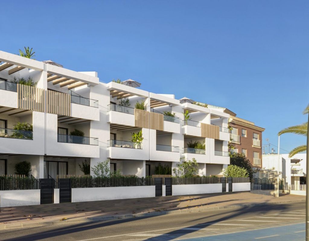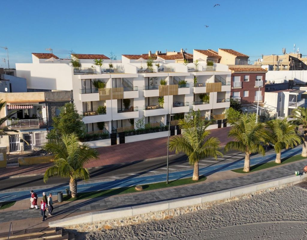 RESIDENCIAL DE OBRA NUEVA EN PRIMERA LÍNEA DE PLAYA EN SAN PEDRO DEL PINATAR Enclavada junto al cautivador Mar Menor, Lo Pagán es una localidad murciana que desvela una mezcla perfecta de belleza natural y riqueza cultural, ofreciendo una escapada perfecta para aquellos que buscan un oasis de tranquilidad. Con un cómodo acceso, a sólo 57 minutos del aeropuerto de Alicante, Lo Pagán le invita a relajarse, explorar y crear recuerdos inolvidables en esta idílica ciudad costera española. Disfrute de un estilo de vida refinado con nuestra residencia de obra nueva meticulosamente diseñada, que ofrece áticos y apartamentos de 1, 2 y 3 dormitorios. Con un diseño impecable, las 21 unidades están distribuidas con elegancia en bloques de 3 niveles. El espacio vital de cada unidad está diseñado para aprovechar la luz natural y crear zonas de estar luminosas, espaciosas y modernas que combinan a la perfección con el entorno costero. Explore una variedad de residencias, disponibles en tres modelos y tamaños diferentes. Residencial le invita a experimentar un estilo de vida de lujo sin igual con una serie de servicios exquisitos: Sumérjase en las refrescantes aguas de la piscina comunitaria. Disfrute de la comodidad y seguridad del aparcamiento subterráneo. Eleve su tiempo de ocio en la terraza compartida de la azotea. Algunas de las viviendas disponen de terrazas privadas. Seis áticos de la 2ª planta tienen una característica única: acceso directo a su solarium privado a través de sus terrazas. También incluye un trastero para mayor comodidad. Además, los residentes tienen la opción de mejorar su experiencia al aire libre añadiendo una cocina de verano a su solarium privado. Cada casa que viene está diseñada para hacerle sentir como si estuviera entrando en unas vacaciones perpetuas, un santuario donde la tranquilidad se une a la sofisticación. Algunas propiedades tienen vistas frontales al mar, otras laterales. La ubicación privilegiada de San Pedro del Pinatar en el Mar Menor y la costa mediterránea atrae a aquellos con un interés en la navegación y los deportes acuáticos, proporcionando amarres en el puerto deportivo y clubes náuticos, mientras que las playas y los baños de barro naturales atraen a aquellos que buscan sol, mar y arena seguros. San Pedro del Pinatar tiene una comunidad establecida y ofrece una excelente gama de actividades, incluyendo piscina cubierta e instalaciones deportivas, así como un programa de actividades sociales durante todo el año por el agradable clima invernal. Los beneficios de los baños de barro, típicos de la región, o las tranquilas aguas del Mar Menor, han favorecido el crecimiento de Lo Pagán, que actualmente cuenta con todo tipo de comodidades. Además, cuenta con una excelente ubicación, a tan sólo 5 minutos del Centro Comercial Dos Mares. El aeropuerto de Murcia/Corvera se encuentra a 30 minutos y el de Alicante a una hora en coche.