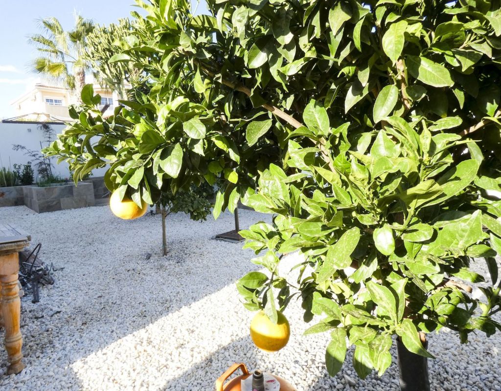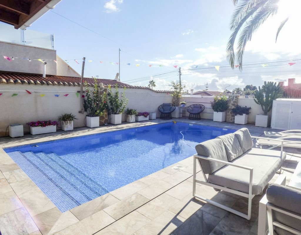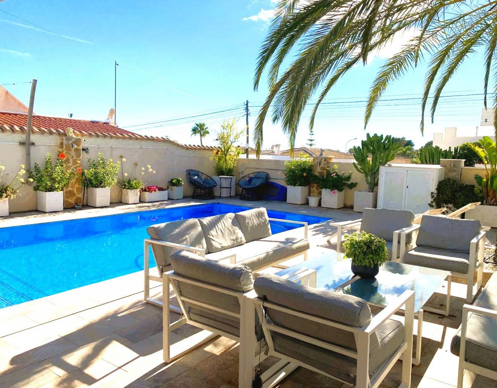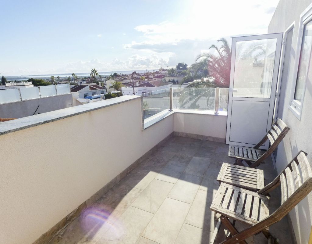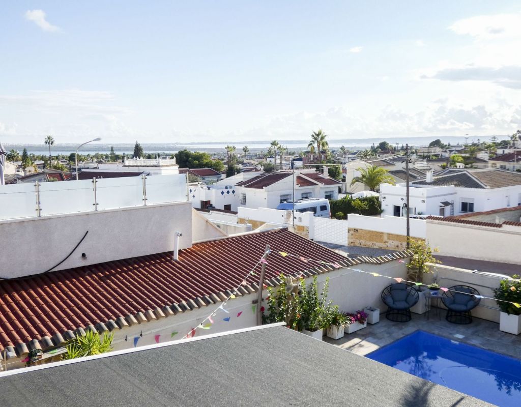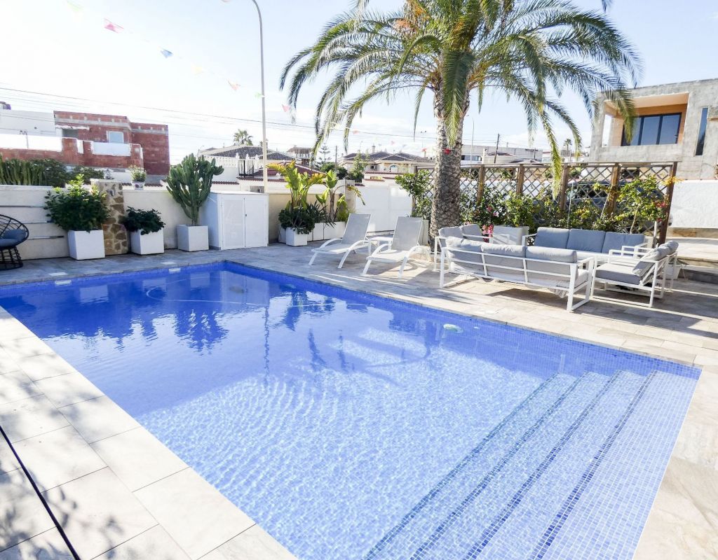 ¿Quieren una villa con todo lo extra? ¡Entonces han encontrado su hogar aquí! Un gran terreno con una distribución bien pensada. Aquí florecen plantas y flores junto a mandarinas, naranjas, kiwis, limones, maracuyás y mangos. Hay cajas de cultivo para verduras y hierbas en la parte trasera junto con dos trasteros. Una gran piscina de agua salada te conduce hacia una cocina exterior (con refrigerador/congelador y lavavajillas) y bar, así como amplios espacios para muebles de comedor, zona de descanso y tumbonas. Aquí la casa también se abre con una cocina espaciosa y moderna, sala de televisión, un gran baño con ducha y 4 dormitorios, de los cuales el dormitorio principal cuenta con vestidor y un baño en suite con ducha. Calefacción por suelo radiante en el baño (en suite) y en la cocina. En la planta superior encontrarás un apartamento adicional con un gran dormitorio, baño con ducha y un balcón con una vista fantástica tanto de los lagos salados como del mar. Aire acondicionado integrado y dos unidades de aire acondicionado separadas en uno de los dormitorios (actualmente oficina) y en el apartamento de la planta superior. Hay estacionamiento para dos coches en el terreno con una puerta de automóvil automática. Riego automático para macetas y árboles. Entre otros, hay restaurantes, bares, tiendas, un gimnasio y una nueva bodega muy buena a poca distancia, así como el campo de golf Marquesa a dos kilómetros de la casa. ¡Bienvenidos a casa!