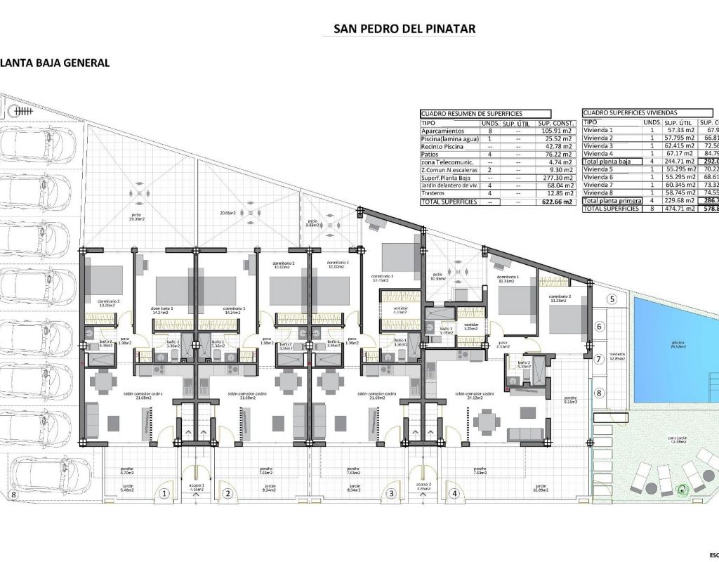 Bungalows de nueva construcción en San Pedro del Pinatar - Ubicación privilegiada a sólo 500 m de la playa Exclusivas viviendas de estilo boutique cerca de la costa Descubra estos elegantes bungalows de nueva construcción en el corazón de San Pedro del Pinatar, a sólo 500 metros de las impresionantes playas del Mar Menor. Esta promoción boutique incluye sólo ocho viviendas exclusivas, que combinan diseño moderno, confort y un tranquilo estilo de vida costero. Modelos disponibles para adaptarse a su estilo de vida Modelo Jardín/Planta Baja: Cuenta con una terraza delantera y un amplio patio trasero, perfecto para vivir al aire libre. Modelo Ático Loft: Incluye un solarium privado en la azotea y una terraza delantera, que ofrecen vistas abiertas y abundante luz solar. Detalles del modelo Garden/Planta Baja Entre en un luminoso salón que conecta a la perfección con el comedor y una cocina totalmente equipada. Las grandes puertas correderas de cristal dejan entrar la luz natural, creando un ambiente abierto y acogedor. La distribución incluye dos amplios dormitorios, el principal con baño en-suite y un moderno baño familiar. Aspectos destacados del modelo Ático Se accede al ático a través de una escalera privada que conduce a una gran terraza. En el interior, un salón y un comedor de planta abierta se combinan con una cocina totalmente equipada. Incluye dos dormitorios, el principal con baño en-suite. Un solarium privado en la azotea, accesible desde la cocina, ofrece un lugar ideal para relajarse o entretenerse. En la planta baja hay un trastero para mayor comodidad. Características principales Iluminación LED interior y exterior. Cocina totalmente equipada con placa de inducción, horno, lavavajillas y frigorífico/congelador. Aire acondicionado instalado. Plaza de aparcamiento. Jardín comunitario con piscina para residentes. San Pedro del Pinatar: Encanto costero y comodidad Situado en las hermosas costas del Mar Menor y el Mediterráneo, San Pedro del Pinatar es un paraíso para los deportes acuáticos, los entusiastas de la vela y los amantes de la playa. La cercana zona de Lo Pagán ofrece baños de barro natural, aguas tranquilas y servicios durante todo el año, como tiendas, restaurantes y locales de ocio. Distancias a los principales puntos de interés: Centro Comercial Dos Mares: 5 km Aeropuerto Murcia/Corvera: 30 km Aeropuerto de Alicante: 75 km Campos de golf locales: 10-20 km Puerto deportivo y clubes náuticos: 2 km Reserve hoy la casa de sus sueños Con la finalización prevista para finales de 2025, ahora es el momento perfecto para asegurar su nuevo hogar en San Pedro del Pinatar. No pierda esta oportunidad de disfrutar de una mezcla de elegancia moderna y tranquilidad costera. Póngase en contacto con nosotros hoy mismo para obtener más información o concertar una visita.