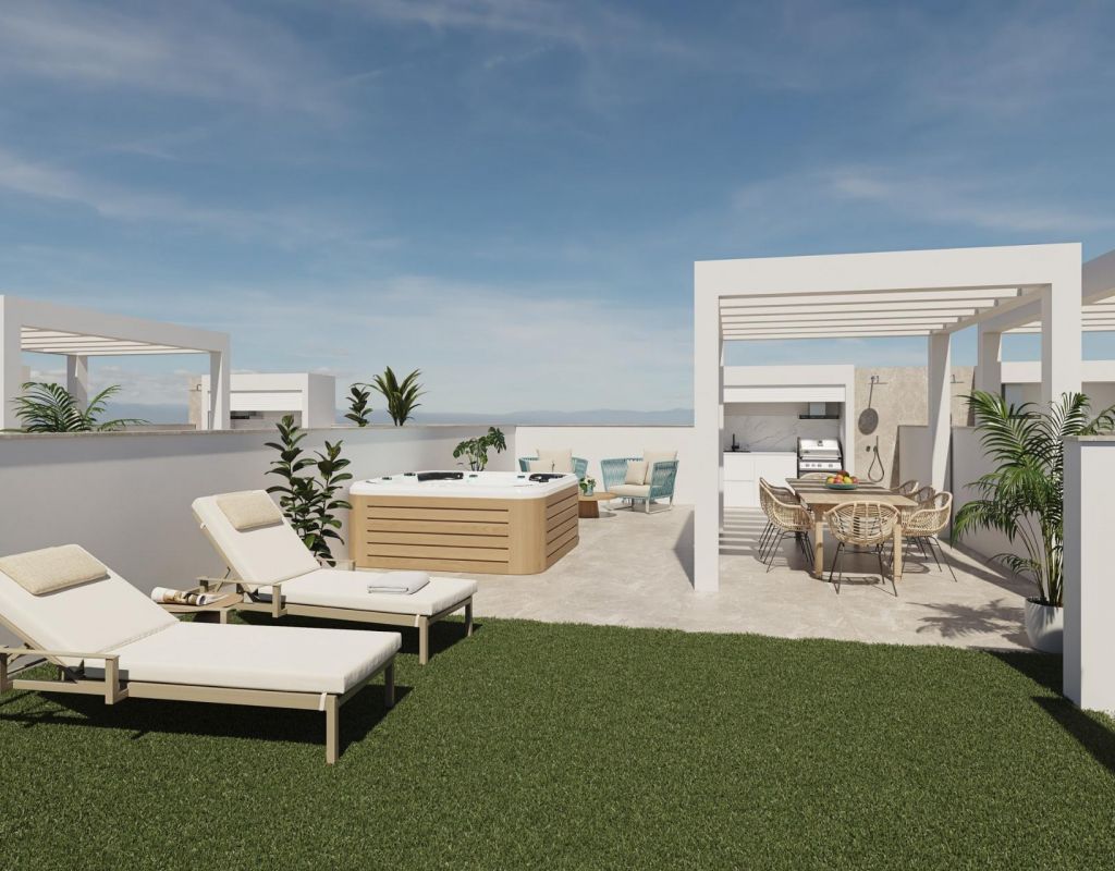 Exclusivos Bungalows de Obra Nueva en Pilar de la Horadada € Estilo único y Ubicación Privilegiada Un Estilo Único que Define tu Nuevo Hogar Esta nueva promoción de bungalows de 2 y 3 dormitorios en Pilar de la Horadada destaca por su diseño moderno y su estructura ondulada, que aporta una personalidad única a cada vivienda. Podrás elegir entre: Plantas bajas con jardín delantero y patio trasero. Plantas altas con solárium privado. El residencial cuenta con una piscina comunitaria y amplias zonas comunes diseñadas para el descanso y el disfrute de toda la familia. Además, la urbanización ofrece gimnasio exterior, jacuzzi comunitario y zona de parking para bicicletas, además de una plaza de parking asignada por cada vivienda con opción de carga de vehículos eléctricos, pensados para ofrecerte el máximo confort y calidad de vida. Interiores Luminosos y de Alta Calidad Cada vivienda ha sido diseñada para ofrecer una experiencia de confort y funcionalidad. Los espacios abiertos maximizan la sensación de amplitud y luminosidad, mientras que los acabados en tonos neutros y madera crean un ambiente elegante y acogedor. Dormitorios amplios y luminosos, con el principal ofreciendo acceso a una terraza privada. Cocina de concepto abierto, integrada en el salón para mayor comodidad. Baños modernos con materiales de primera calidad. Pilar de la Horadada € Calidad de Vida en la Costa Blanca Situado en la provincia de Alicante, Pilar de la Horadada es un municipio costero que combina tradición con un ambiente relajado. Es conocido por sus hermosas playas, como la Playa de las Higuericas, con arena dorada y aguas cristalinas del Mediterráneo. Además de su costa, la ciudad cuenta con una vibrante calle principal llena de tiendas, supermercados, restaurantes y plazas pintorescas. Su excelente infraestructura incluye carriles bici, rutas de senderismo y una gran variedad de actividades deportivas. Cercanía a los Principales Puntos de Interés Este residencial ofrece un acceso cómodo a los destinos más importantes de la zona: Playa de Torre de la Horadada € 3 km (5 min en coche). Campo de golf Lo Romero € 5 km (10 min en coche). Centro Comercial La Zenia Boulevard € 15 km (15 min en coche). Aeropuerto de Corvera (Murcia) € 40 km (40 min en coche). Aeropuerto de Alicante € 55 km (55 min en coche). Asegure Hoy su Vivienda en la Costa Blanca No pierda la oportunidad de adquirir una vivienda de obra nueva en una ubicación excepcional. Contáctenos hoy mismo para más información y para programar una visita.