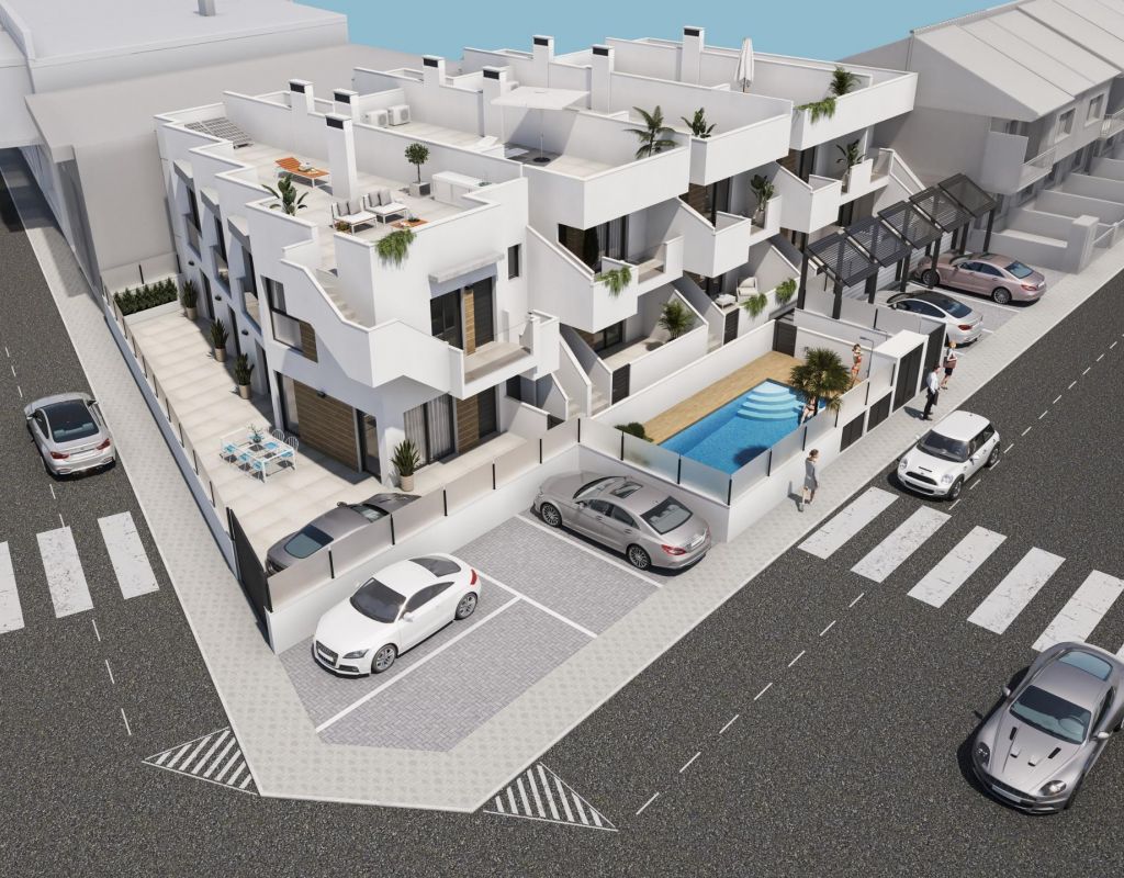 Nuevos Bungalows en San Pedro del Pinatar € Modernidad y Confort a Pocos Minutos del Mar Vida Mediterránea en una Ubicación Privilegiada Esta nueva promoción de bungalows se encuentra en San Pedro del Pinatar, uno de los destinos más atractivos de la Costa Cálida, Murcia. Rodeado de todos los servicios, zonas deportivas y varios campos de golf, este complejo está situado a solo 5 minutos de las playas del Mar Mediterráneo y del Mar Menor, dos de los enclaves costeros más populares del sureste español. Residencial Exclusivo con Estilo y Funcionalidad El complejo está compuesto por 10 bungalows de obra nueva, con viviendas de 1 dormitorio y 1 baño, ideales para quienes buscan una opción económica, y también opciones de 3 dormitorios y 2 baños, pensadas para familias o quienes deseen más espacio. Cada vivienda incluye: Plaza de aparcamiento privada Cocina totalmente equipada, con electrodomésticos incluidos Baños modernos con mueble de lavabo, iluminación y mampara de cristal Preinstalación de aire acondicionado por conductos Solárium privado en las viviendas de planta alta, con cocina de verano Piscina comunitaria con zona de relax y solárium Acabados Modernos y de Alta Calidad Diseñados con un enfoque en el confort y la eficiencia, los bungalows incorporan materiales y acabados de primera categoría: Carpintería exterior de aluminio lacado en gris oscuro Persianas motorizadas y doble acristalamiento con cámara de aire Iluminación LED interior y exterior Puerta de seguridad en entrada Punto de agua en terraza y solárium Distancias clave: Centro Comercial Dos Mares: 3 km Playas del Mar Menor: 3.5 km Campo de Golf Lo Romero: 11 km Aeropuerto de Murcia-Corvera: 39 km Aeropuerto de Alicante: 78 km Puerto deportivo de San Pedro: 4 km San Pedro del Pinatar € Calidad de Vida Todo el Año Esta localidad es famosa por sus baños naturales de barro, su ambiente tranquilo y sus modernas infraestructuras deportivas y náuticas. El clima suave durante todo el año y su excelente conectividad la convierten en un lugar ideal tanto para vivir como para vacacionar. La zona de Lo Pagán ofrece una vibrante vida social con restaurantes, comercios y entretenimiento para todas las edades. Descubra su Nuevo Hogar en la Costa Cálida Estos bungalows representan una excelente oportunidad de inversión o una escapada perfecta al Mediterráneo. Contáctenos hoy mismo y agende su visita para descubrir su futuro hogar en San Pedro del Pinatar.