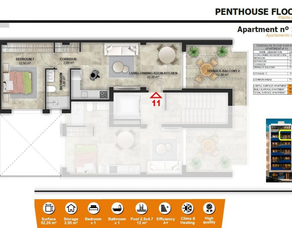 Apartamentos de Obra Nueva a 200 Metros del Mar en Torrevieja Viviendas Modernas en Ubicación Privilegiada Descubre esta nueva promoción en el corazón de Torrevieja, a solo 200 metros de la playa del Acequión, una de las más populares de la ciudad. Este edificio residencial cuenta con 11 viviendas distribuidas en un entorno tranquilo, ideal para quienes buscan vivir cerca del mar sin renunciar a los servicios urbanos. La ubicación ofrece acceso a pie al centro de Torrevieja, parques, restaurantes, supermercados y todos los servicios necesarios para el día a día. Distancias a puntos clave: Playa del Acequión: 0.2 km Centro de Torrevieja: 0.7 km Puerto deportivo Marina Salinas: 1.5 km Hospital Universitario de Torrevieja: 5.5 km Campo de golf Villamartín: 10 km Centro Comercial Habaneras: 3 km Aeropuerto de Alicante: 45 km Diferentes Tipologías para Todas las Necesidades El edificio ofrece una selección de estudios, apartamentos de 1 y 2 dormitorios, y áticos con amplias terrazas privadas. Todas las viviendas cuentan con trastero incluido en la planta baja, y acceso a modernas instalaciones comunitarias que elevan el nivel de confort y estilo de vida. Espacios Comunes para el Bienestar y el Disfrute La azotea del edificio ha sido diseñada como un espacio comunitario premium con: Piscina Solárium Sauna Zona de barbacoa Perfecto para disfrutar del clima mediterráneo de Torrevieja durante todo el año. Calidades de Alta Gama en Cada Vivienda Las viviendas han sido construidas con materiales de primera calidad y diseño contemporáneo: Carpintería exterior de PVC con doble acristalamiento tipo Guardian Sun Persianas motorizadas con aislamiento térmico Puerta de entrada acorazada con cerradura de seguridad Cocina equipada con muebles altos y bajos y electrodomésticos integrados: vitrocerámica, horno, microondas, extractor y lavavajillas Producción de agua caliente por sistema de aerotermia Aire acondicionado completamente instalado Iluminación LED Ascensor en el edificio Vive a un Paso del Mar y del Centro Urbano Torrevieja es una de las ciudades costeras más dinámicas y en crecimiento de la Costa Blanca, famosa por su clima, playas, salinas y vida cultural. Esta promoción es ideal tanto para residencia habitual, inversión o como segunda vivienda para vacaciones. Contáctenos hoy mismo para más información o para concertar una visita y asegure su vivienda junto al mar en Torrevieja.