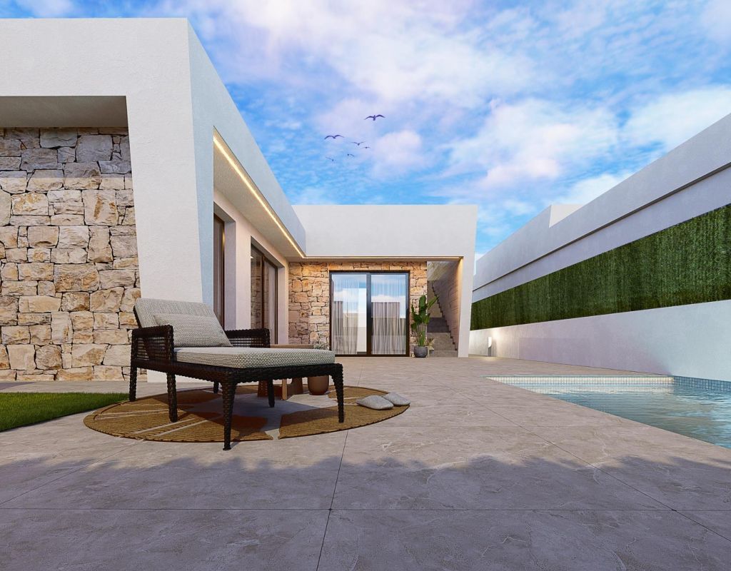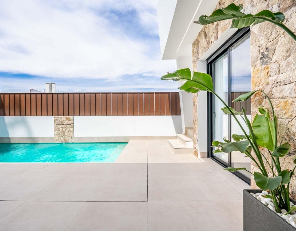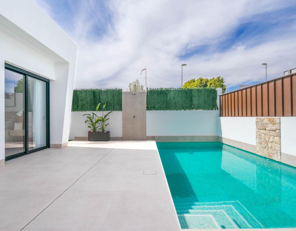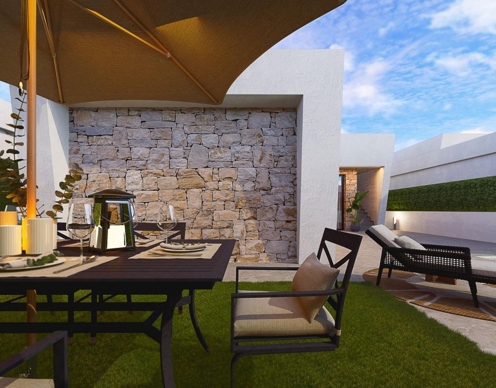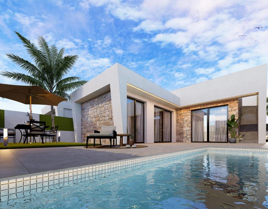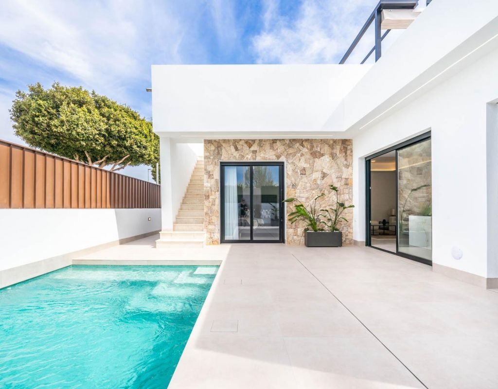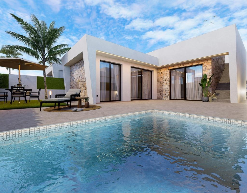 Villas independientes de nueva construcción con piscina privada y solárium en Roldán, Torre-Pacheco Villas modernas de una sola planta con diseño exclusivo Estas villas de 3 dormitorios y 2 baños, de nueva construcción, situadas en Roldán, Torre-Pacheco, ofrecen un diseño contemporáneo y ecológico, pensado para el confort y el estilo de vida. Construidas en una sola planta, cada vivienda cuenta con un amplio salón-comedor diáfano con una cocina moderna totalmente equipada, que se comunica a la perfección con amplias terrazas y un solárium en la azotea. Las villas están cuidadosamente diseñadas para combinar funcionalidad y estética, con fachadas revestidas de piedra en ángulo, acabados elegantes y mucho espacio exterior para disfrutar del sol mediterráneo durante todo el año. Espacio exterior privado y características de primera calidad Cada villa cuenta con: Piscina privada y ducha exterior Solárium en la azotea con amplio espacio para tomar el sol o crear una zona chill-out Terraza y zonas ajardinadas en la planta baja Entrada privada para aparcamiento fuera de la vía pública Paquete de iluminación LED para interior y exterior Sistema de aire acondicionado preinstalado El dormitorio principal incluye un baño en suite, mientras que los dos dormitorios adicionales comparten un baño familiar, todos ellos diseñados con un toque contemporáneo y acabados de alta calidad. Ubicación ideal cerca de playas y golf Roldán es un encantador pueblo español en el municipio de Torre-Pacheco, conocido por su ambiente tradicional y su completa oferta de servicios diarios, que incluye supermercados, restaurantes, centros de salud y colegios. La ubicación ofrece proximidad a varios lugares de interés: Aeropuerto de Corvera (RMU) - 15 km Playas del Mar Menor y del mar Mediterráneo - 20 km Campos de golf (La Torre Golf y Las Terrazas de La Torre): a menos de 4 km Centro de Cartagena: a 32 km Centro comercial Zenia Boulevard: a 35 km Puerto deportivo de Los Alcázares: a 22 km Tanto si busca una casa de vacaciones, una residencia permanente o una sólida inversión para alquilar, esta ubicación ofrece fácil acceso a las atracciones de la costa, a instalaciones deportivas y a las comodidades de la ciudad. Su nueva vida al sol le espera No pierda la oportunidad de adquirir una de estas elegantes villas nuevas en Roldán. Póngase en contacto con nosotros hoy mismo para obtener más información, concertar una visita o asegurarse su nueva vivienda en la Costa Cálida antes de que se agoten.