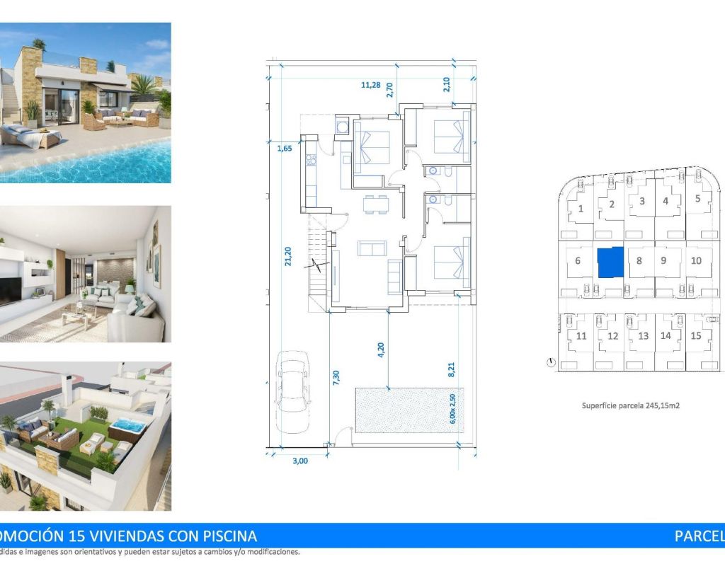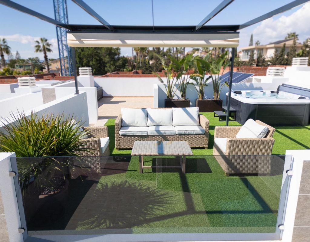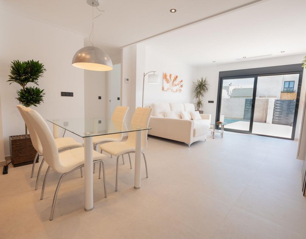 Villas de Obra Nueva con Piscina Privada en Oasis de la Marina, Costa Blanca Viviendas modernas en una ubicación tranquila cerca de la playa Descubra esta exclusiva promoción de 15 villas independientes y pareadas de obra nueva, situadas en la urbanización Oasis de La Marina, en el municipio de San Fulgencio. Estas elegantes viviendas de diseño contemporáneo están construidas en una sola planta y se encuentran a solo 4.5 km de las espectaculares playas de la Costa Blanca. Un entorno ideal tanto para residencia habitual como para escapadas vacacionales, en una zona tranquila pero muy bien conectada. Distribución y diseño funcional para el máximo confort Cada villa cuenta con una distribución práctica y luminosa, pensada para el disfrute del estilo de vida mediterráneo: 3 dormitorios con armarios empotrados 2 baños completos con muebles y mamparas de cristal Cocina americana totalmente equipada con campana extractora y sistema de ósmosis Amplio salón comedor con acceso directo al jardín Solárium privado Jardín privado con piscina y zona de solárium Plaza de aparcamiento en parcela Equipamiento completo y eficiencia energética Estas villas están diseñadas con materiales de alta calidad y soluciones energéticamente eficientes: Sistema de aire acondicionado frío-calor Instalación de placas solares fotovoltaicas Iluminación LED interior y exterior Persianas eléctricas de aluminio Piscina privada en cada vivienda Parking privado dentro de la parcela Entorno natural y servicios cercanos Oasis de La Marina es una zona residencial tranquila rodeada de naturaleza, entre las localidades de San Fulgencio, La Marina y Guardamar del Segura. La ubicación ofrece cercanía a todos los servicios necesarios para el día a día, así como opciones de ocio y deporte. Puntos de interés cercanos: Playa más cercana: 4.5 km Campo de golf La Marquesa: 6 km Centro comercial Habaneras (Torrevieja): 15 km Aeropuerto de Alicante: 29 km Aeropuerto de Murcia: 66 km Acceso rápido a la carretera nacional N-332 Viva el estilo de vida mediterráneo en un entorno privilegiado Estas villas representan una excelente oportunidad para quienes buscan tranquilidad, privacidad y proximidad al mar. Contacte con nosotros hoy mismo para más información o para concertar una visita a estas exclusivas viviendas de obra nueva en San Fulgencio.