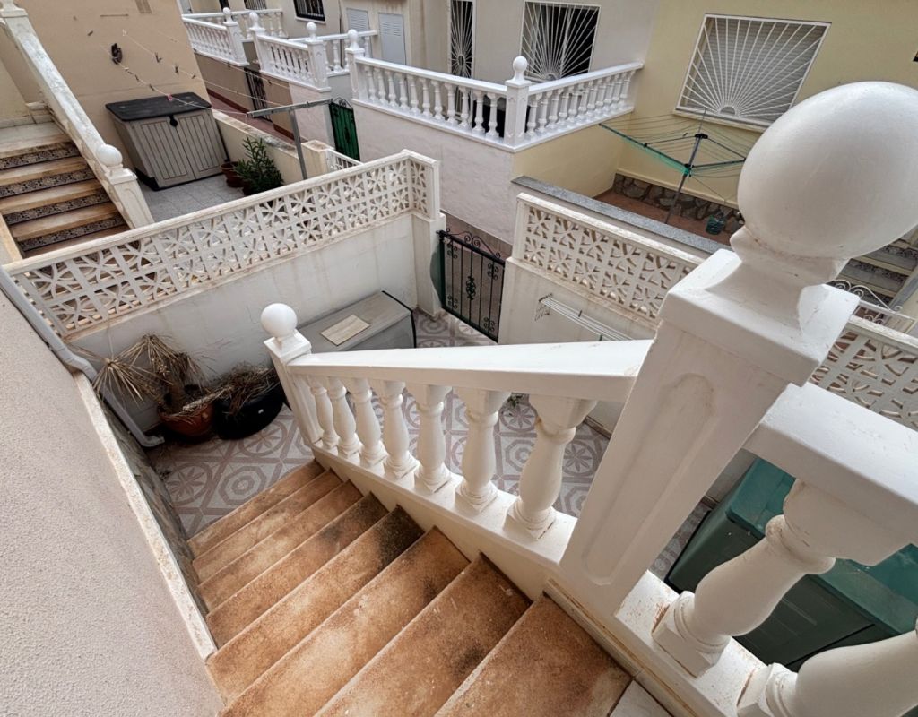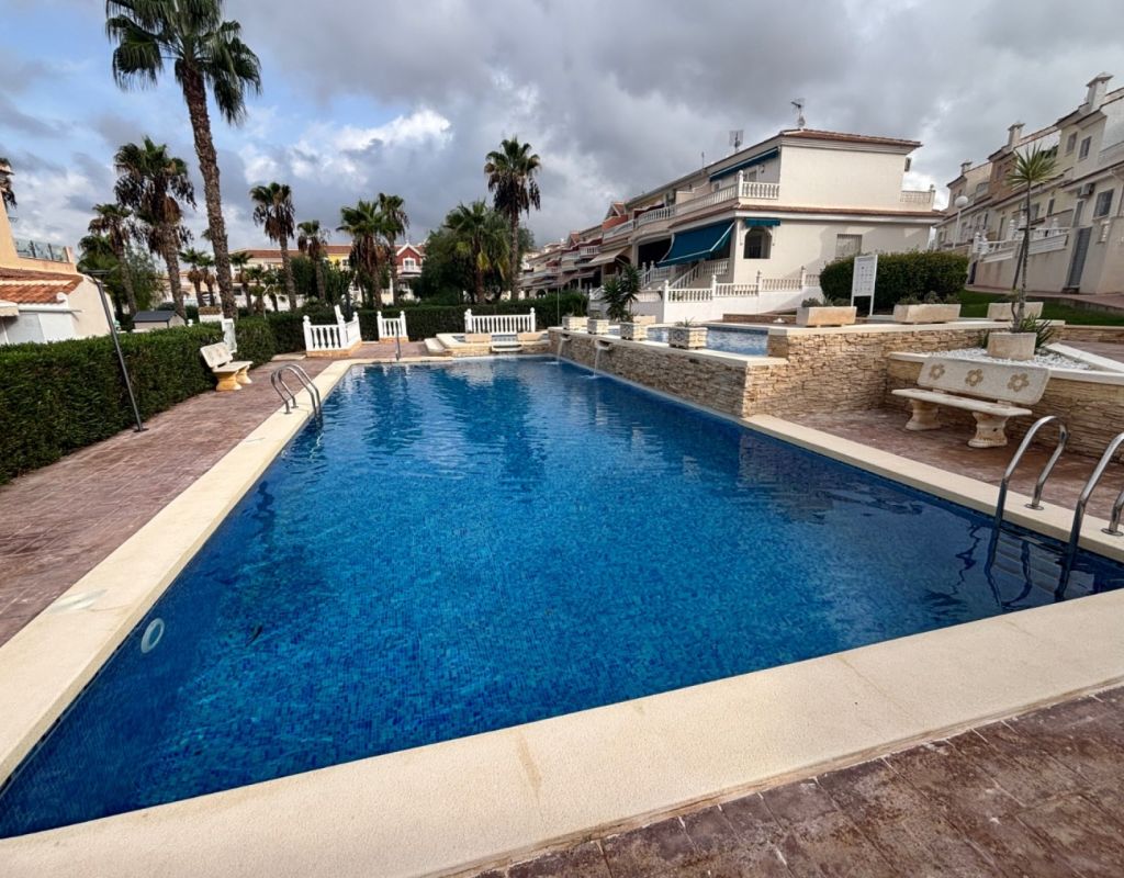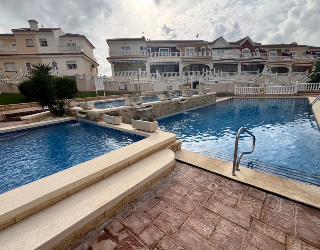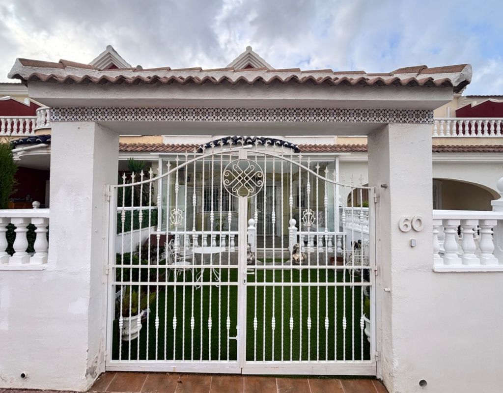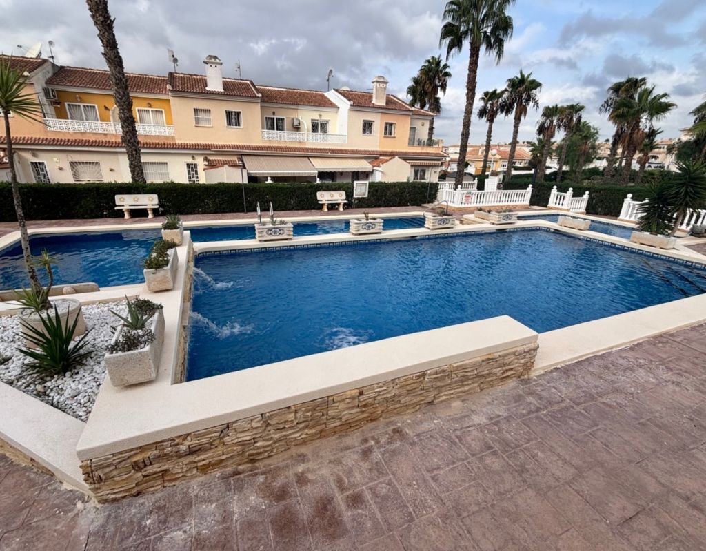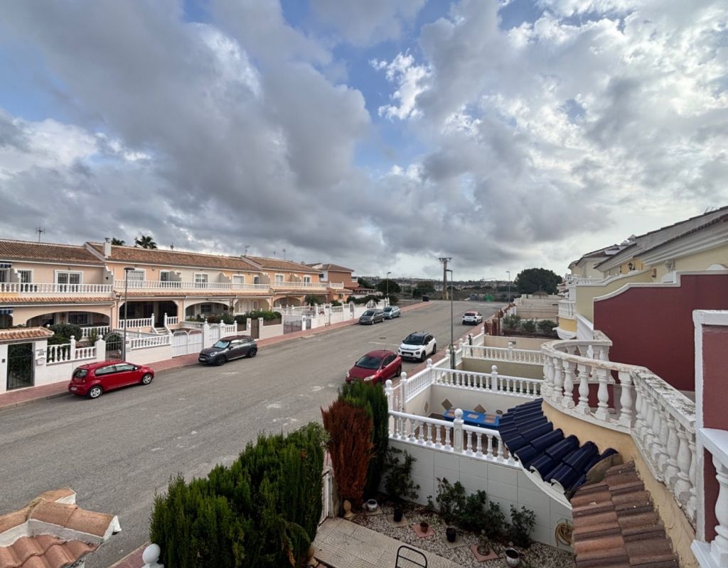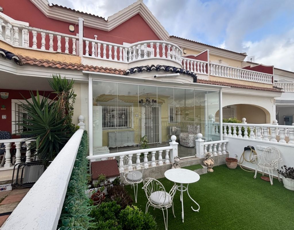 Aquí tenemos esta casa adosada de 2 dormitorios en Monte Azul, ubicada en una urbanización consolidada con bar y restaurante, a solo 5 minutos en coche de los populares pueblos de Quesada y Benijófar. Los campos de golf La Finca y La Marquesa se encuentran a 5-10 minutos en coche, mientras que las hermosas playas de la Costa Blanca Sur se encuentran a unos 15 minutos. Bien cuidada, esta casa de 101 m² cuenta con una terraza delantera cubierta con cortinas de cristal. La planta baja consta de un luminoso salón-comedor independiente que da a una cocina independiente equipada con puerta a la parte trasera, un dormitorio doble y un baño con ducha. En la primera planta hay dos dormitorios dobles, ambos con ventiladores de techo, incluyendo el principal con acceso a una terraza cubierta. La terraza de los dos dormitorios está cubierta. Un baño familiar con ducha. En el exterior, el jardín delantero requiere poco mantenimiento. Esta propiedad también cuenta con aire acondicionado y, por supuesto, con acceso a la preciosa piscina y jardines comunitarios, a pocos pasos.