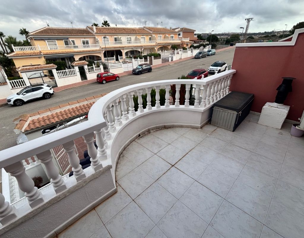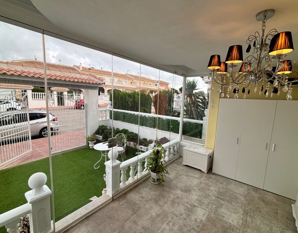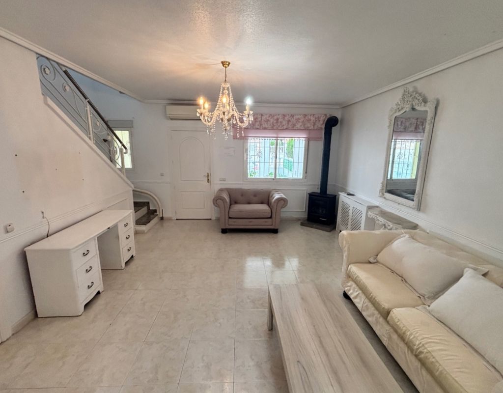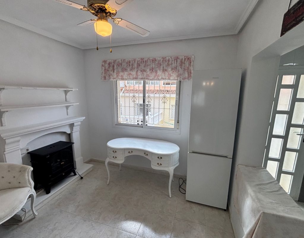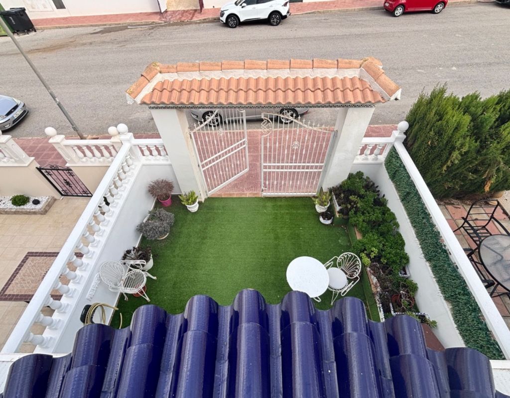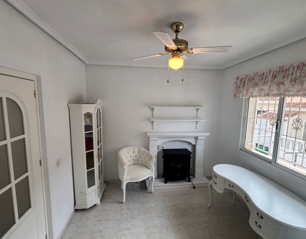 Aquí tenemos esta casa adosada de 2 dormitorios en Monte Azul, ubicada en una urbanización consolidada con bar y restaurante, a solo 5 minutos en coche de los populares pueblos de Quesada y Benijófar. Los campos de golf La Finca y La Marquesa se encuentran a 5-10 minutos en coche, mientras que las hermosas playas de la Costa Blanca Sur se encuentran a unos 15 minutos. Bien cuidada, esta casa de 101 m² cuenta con una terraza delantera cubierta con cortinas de cristal. La planta baja consta de un luminoso salón-comedor independiente que da a una cocina independiente equipada con puerta a la parte trasera, un dormitorio doble y un baño con ducha. En la primera planta hay dos dormitorios dobles, ambos con ventiladores de techo, incluyendo el principal con acceso a una terraza cubierta. La terraza de los dos dormitorios está cubierta. Un baño familiar con ducha. En el exterior, el jardín delantero requiere poco mantenimiento. Esta propiedad también cuenta con aire acondicionado y, por supuesto, con acceso a la preciosa piscina y jardines comunitarios, a pocos pasos.