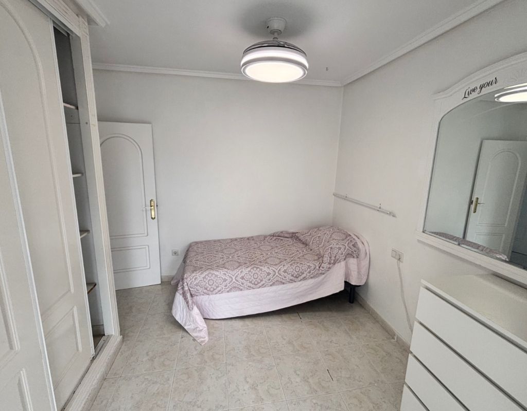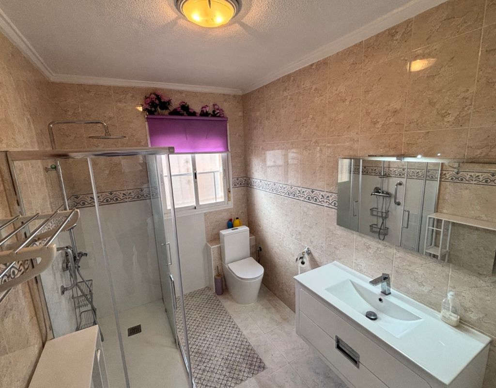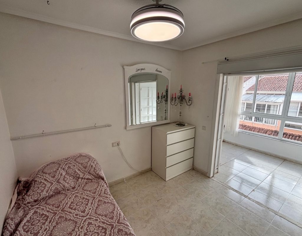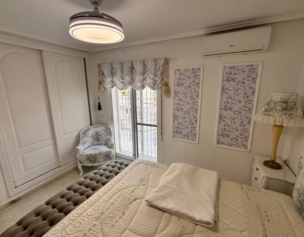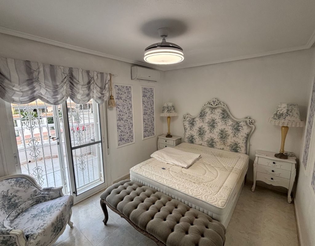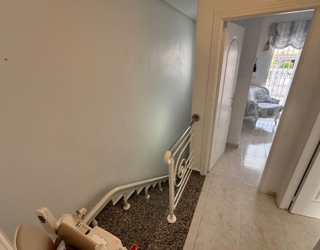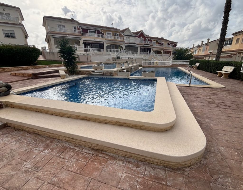 Aquí tenemos esta casa adosada de 2 dormitorios en Monte Azul, ubicada en una urbanización consolidada con bar y restaurante, a solo 5 minutos en coche de los populares pueblos de Quesada y Benijófar. Los campos de golf La Finca y La Marquesa se encuentran a 5-10 minutos en coche, mientras que las hermosas playas de la Costa Blanca Sur se encuentran a unos 15 minutos. Bien cuidada, esta casa de 101 m² cuenta con una terraza delantera cubierta con cortinas de cristal. La planta baja consta de un luminoso salón-comedor independiente que da a una cocina independiente equipada con puerta a la parte trasera, un dormitorio doble y un baño con ducha. En la primera planta hay dos dormitorios dobles, ambos con ventiladores de techo, incluyendo el principal con acceso a una terraza cubierta. La terraza de los dos dormitorios está cubierta. Un baño familiar con ducha. En el exterior, el jardín delantero requiere poco mantenimiento. Esta propiedad también cuenta con aire acondicionado y, por supuesto, con acceso a la preciosa piscina y jardines comunitarios, a pocos pasos.