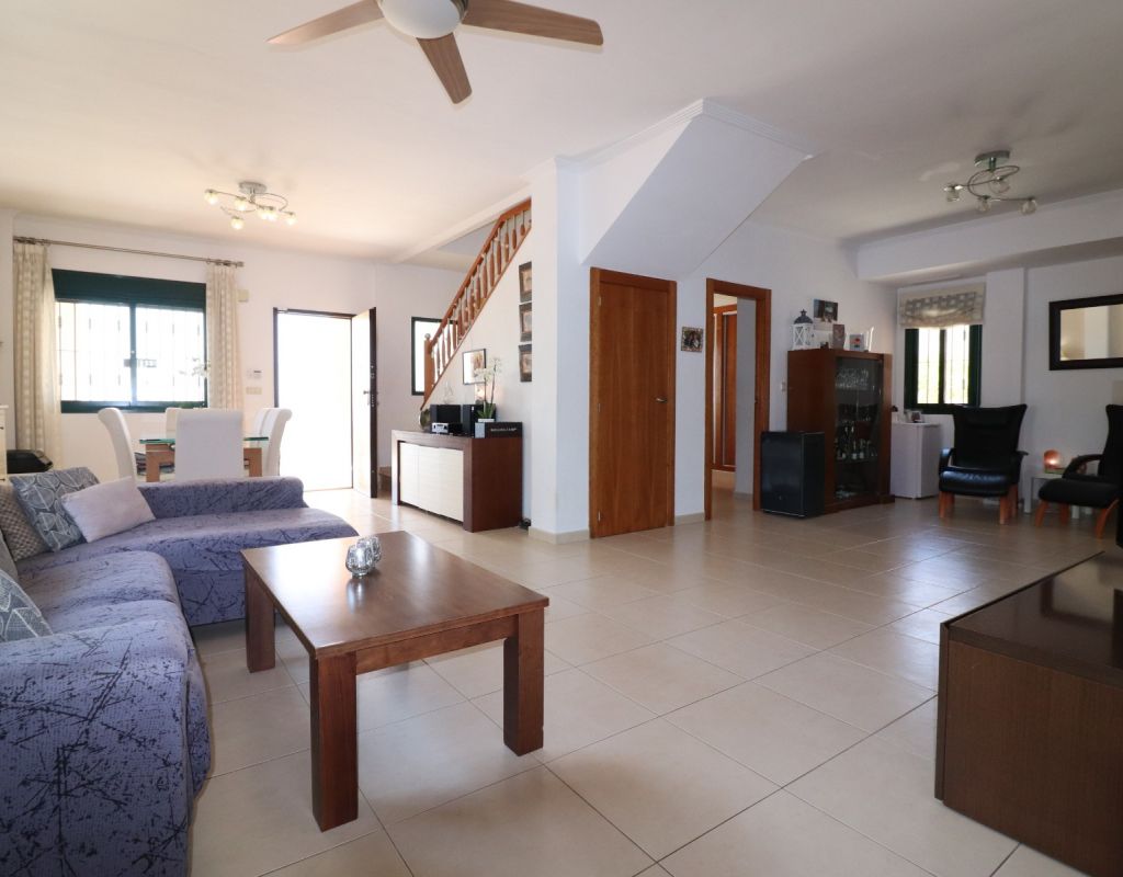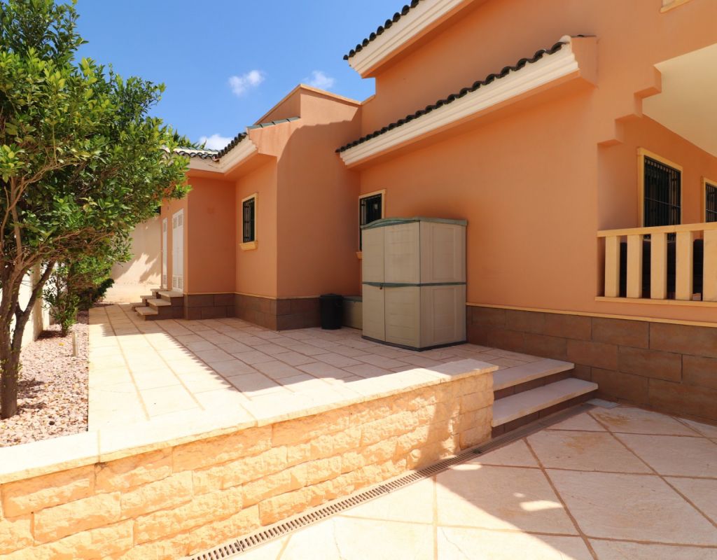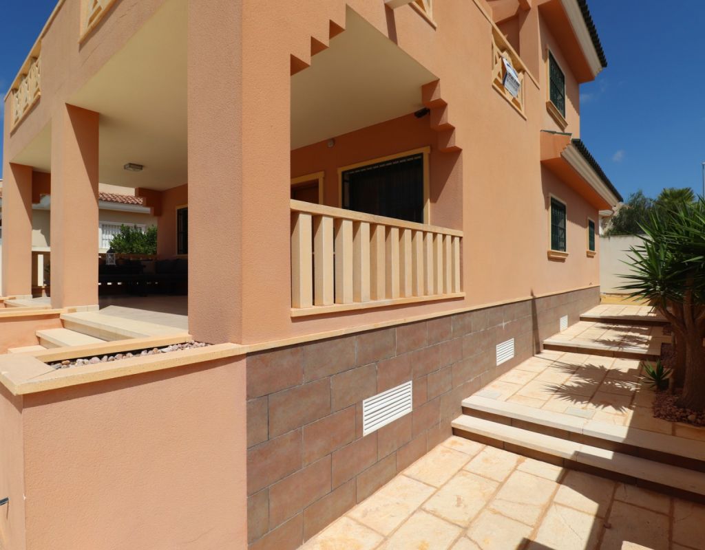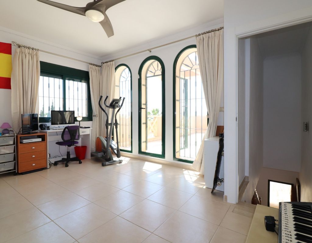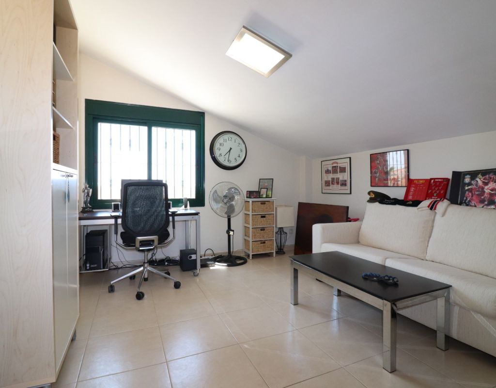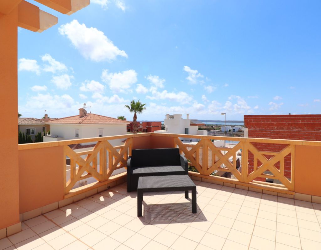 Esta villa independiente de cuatro dormitorios con orientación sur en Ciudad Quesada se encuentra en una prestigiosa zona, rodeada de exclusivas propiedades en la codiciada urbanización de La Fiesta, en la Costa Blanca Sur. Convenientemente situada a solo 10 minutos a pie de una variedad de bares, restaurantes y un supermercado, esta villa también está a solo 5 minutos en coche del campo de golf La Marquesa y a solo 10 minutos de las hermosas playas de Guardamar. Esta imponente construcción de 175 m² se encuentra en una generosa parcela de 500 m² y ofrece un espacio de vida amplio y confortable en dos plantas. La planta baja cuenta con un impresionante salón-comedor en forma de "L" con escaleras que conducen a la primera planta, una cocina independiente totalmente equipada con acceso a un lavadero, tres dormitorios dobles con armarios empotrados (uno de ellos con baño en suite) y un baño familiar con ducha. En la planta superior, la primera planta cuenta con un espacio diáfano que se convierte en un cuarto dormitorio/despacho y acceso a una amplia terraza en forma de L con impresionantes vistas a las salinas y al mar: el lugar perfecto para relajarse y disfrutar del entorno mediterráneo. En el exterior, la propiedad ofrece una piscina privada de 8x5, aparcamiento privado, una terraza cubierta para comer al aire libre, algunos árboles plantados y un trastero. El confort está garantizado durante todo el año con aire acondicionado por conductos, calefacción por suelo radiante y calefactores de pared en el salón y el dormitorio principal. Esta villa, impecablemente equipada, combina a la perfección lujo, ubicación y estilo de vida, ideal para vivir todo el año o como una casa de vacaciones de alta gama en una de las zonas más codiciadas de Ciudad Quesada.