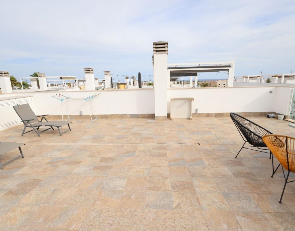 Pilar de la Horadada Bungalow en planta alta en Residencial Lamar Resort. . Luminoso bungalow de 70 m2 con orientación sur, ubicado en un moderno residencial totalmente cerrado. La vivienda cuenta con 2 dormitorios, 2 baños completos, cocina americana, salón-comedor, terraza y un amplio solárium privado ideal para disfrutar del sol durante todo el año. . . El residencial ofrece 2 grandes piscinas comunitarias, zona infantil y plaza de aparcamiento incluida. . Se vende completamente amueblado y equipado con aire acondicionado. . Perfecto tanto como vivienda vacacional como para vivir todo el año.