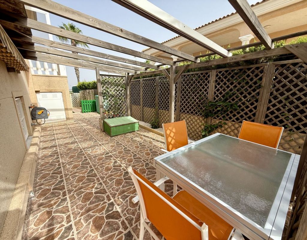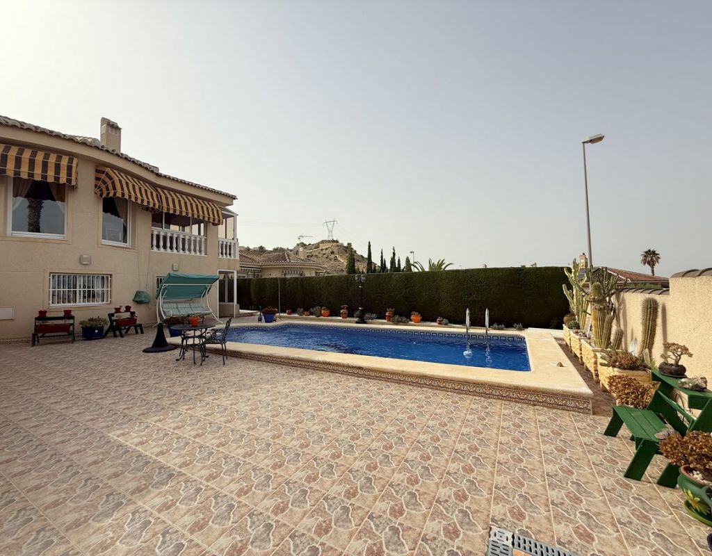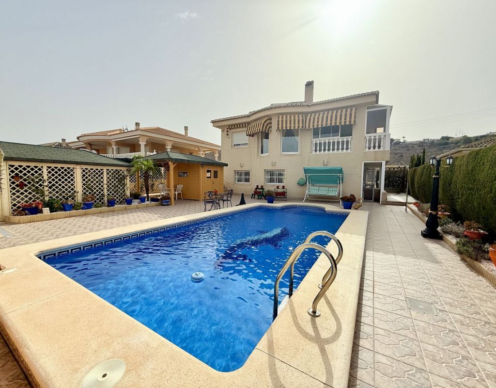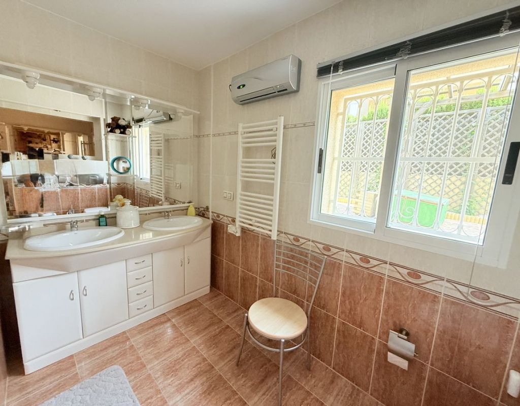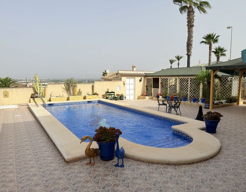 Impecable chalet independiente en venta en Rojales, Costa Blanca Sur – Piscina privada y apartamento de invitados Descubra este chalet independiente en perfectas condiciones en Rojales, Costa Blanca Sur, que ofrece la combinación perfecta de lujo, espacio y versatilidad. Con una ubicación ideal en una amplia parcela de 500 m² y una superficie construida de 224 m², esta propiedad incluye una piscina privada de 8 x 4 m, impresionantes vistas a la montaña y un sótano totalmente independiente para alojamiento de invitados. Construida en 2003 y orientada al suroeste para disfrutar al máximo del sol, esta casa es un hallazgo excepcional en una de las zonas más codiciadas de la Costa Blanca. La casa principal presume de un espacioso diseño de planta abierta, con un luminoso salón-comedor con impresionantes vistas, chimenea de leña, aire acondicionado y radiadores de gasóleo para mayor comodidad durante todo el año. La moderna cocina totalmente equipada con barra americana se integra con un amplio invernadero con vistas a la piscina y al solárium, creando el espacio perfecto para disfrutar de la vida interior y exterior. La suite principal ofrece armarios empotrados y un lujoso baño en suite con lavabos dobles, ducha a ras de suelo, bidé, inodoro y urinario de pared. Además, incluye un aseo independiente y un trastero. La propiedad se vende parcialmente amueblada, lo que facilita su entrada y disfrute. El apartamento en planta baja ofrece un espacio habitable independiente, ideal para invitados, familias numerosas o para generar ingresos por alquiler. Incluye entrada propia, salón-comedor de planta abierta, cocina totalmente equipada, baño familiar con ducha y lavabos dobles y tres dormitorios (dos de ellos actualmente utilizados como despacho y cuarto de costura, ambos con armarios empotrados). También hay un taller adicional que puede convertirse en otro dormitorio si es necesario. En el exterior, encontrará una amplia terraza embaldosada que rodea la piscina privada, perfecta para tomar el sol y disfrutar del tiempo libre, además de una cochera, un trastero y una caseta de almacenamiento adicional cerca de la zona de la piscina. La propiedad se encuentra a poca distancia en coche de las playas de arena de Guardamar del Segura, el campo de golf La Marquesa, los servicios locales y a solo 35 minutos del aeropuerto de Alicante. Si busca una villa en venta en Rojales con piscina privada y alojamiento independiente para invitados, esta propiedad es imprescindible. Con impresionantes vistas, un estado de conservación excelente, SIN COSTES DE COMMUNIDAD y una ubicación privilegiada en la Costa Blanca Sur, ofrece todo lo necesario para una vivienda permanente, una escapada vacacional o una oportunidad de inversión.