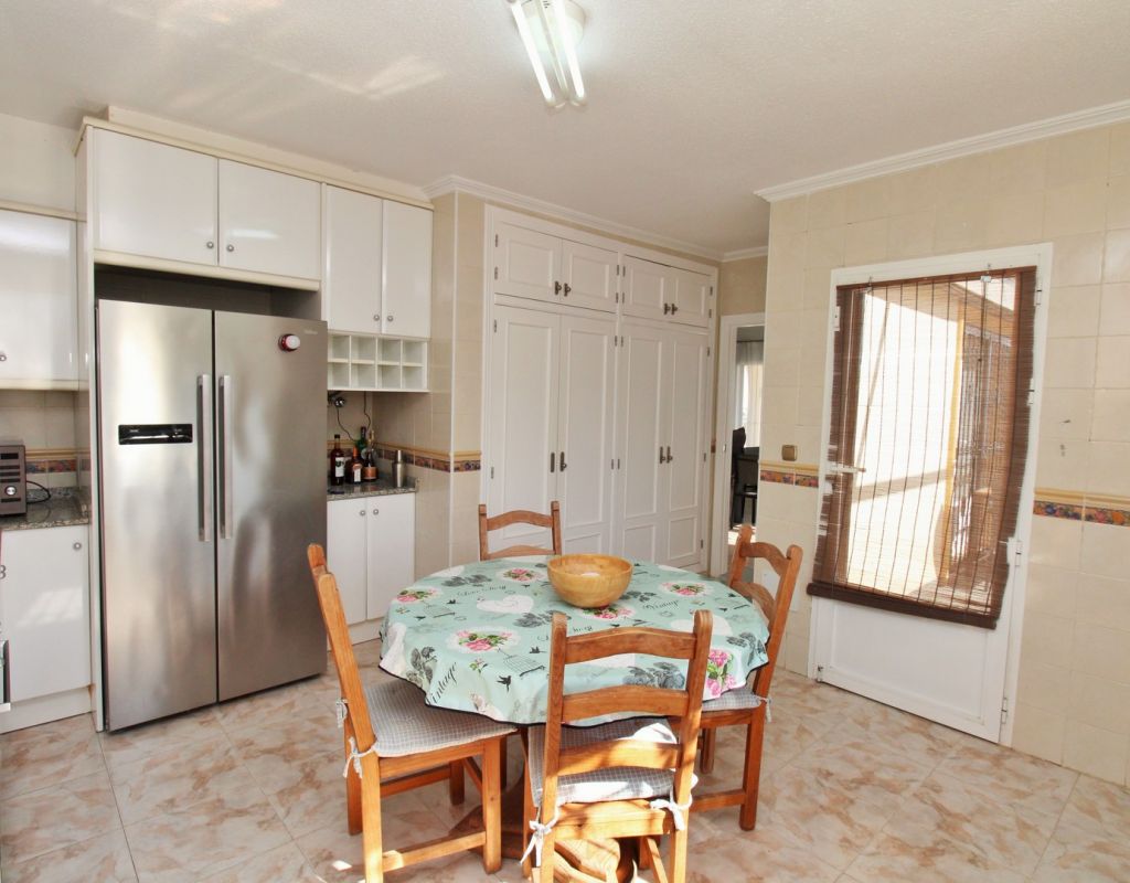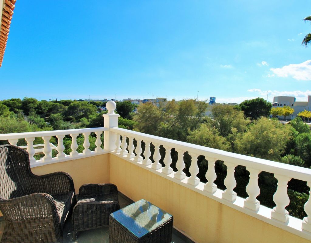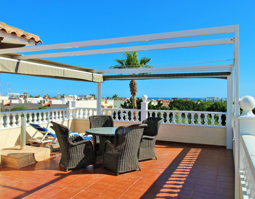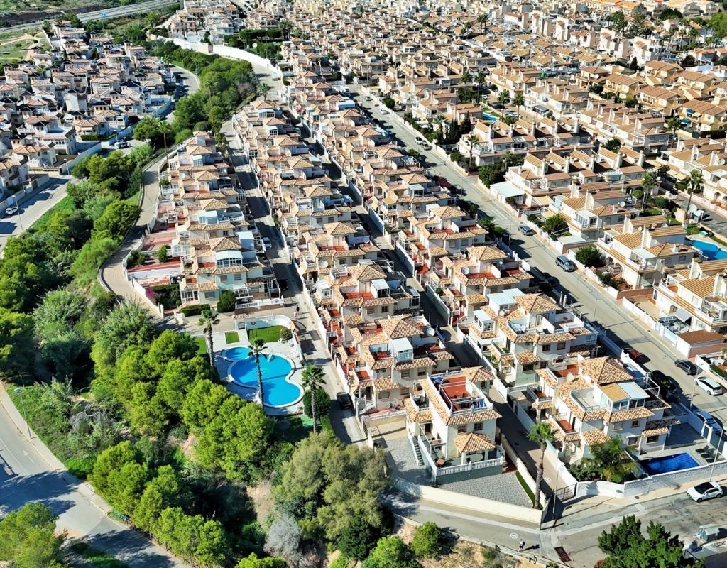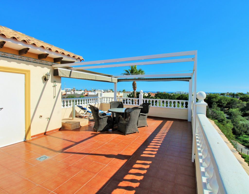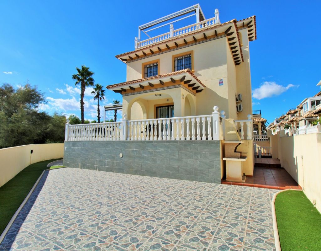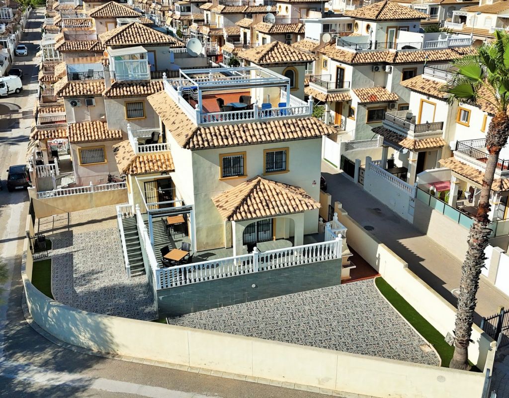 Excepcional oportunidad de adquirir una de las únicas tres villas independientes en la codiciada comunidad residencial San Jose I en Playa Flamenca. Ubicada en una parcela de esquina soleada, esta espaciosa villa de 4 dormitorios y 3 baños goza de una posición privilegiada, a solo unos pasos de la piscina comunitaria y a poca distancia a pie del centro comercial Zenia Boulevard, así como de una gran variedad de bares, restaurantes y supermercados. La vivienda ofrece una impresionante cantidad de espacio exterior, que incluye jardín embaldosado, entrada para coche, terraza elevada delantera, balcón con vistas a la piscina y un gran solárium privado en la azotea con vistas al mar y a la piscina, perfecto para relajarse o disfrutar al aire libre. En el interior, la planta baja dispone de un luminoso salón-comedor, una amplia cocina independiente con acceso a la terraza, un dormitorio doble y un baño con ducha a ras de suelo. En la planta superior hay tres dormitorios dobles con armarios empotrados y un baño familiar. El dormitorio principal cuenta con baño en suite y acceso a un balcón privado con vistas a la piscina. Desde las escaleras interiores se accede al amplio solárium, equipado con toldo retráctil y bonitas vistas al mar y alrededores. Destaca un gran sótano con dos habitaciones adicionales y acceso independiente, con gran potencial para crear un apartamento independiente, alojamiento para invitados o una sala de juegos o aficiones. Se vende amueblada, con electrodomésticos y aire acondicionado. Los propietarios en Villas de San Jose I disfrutan de piscina comunitaria y jardines bien cuidados. Ubicada en una zona privilegiada de Orihuela Costa, a poca distancia de Zenia Boulevard, Via Park I y a 20 minutos a pie de las playas de Cala Mosca y Cala Estaca, esta vivienda ofrece un excelente valor, espacio y versatilidad. Se recomienda visitar pronto para apreciar todo el potencial y la ubicación de esta villa única.