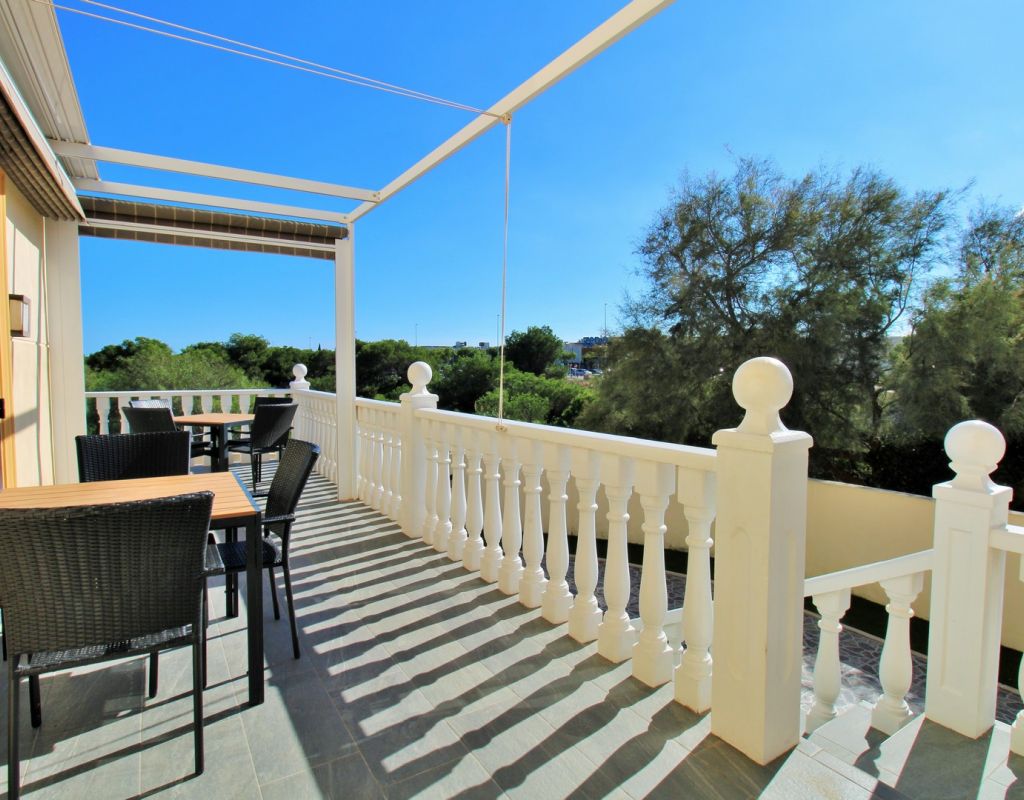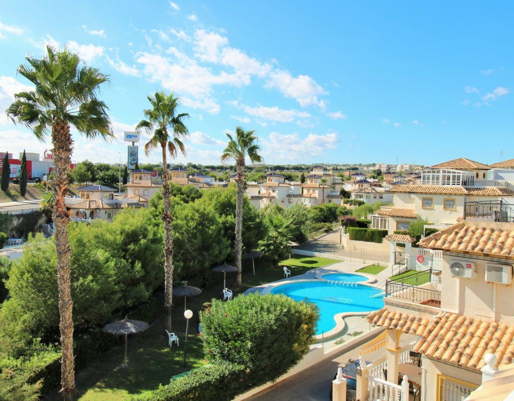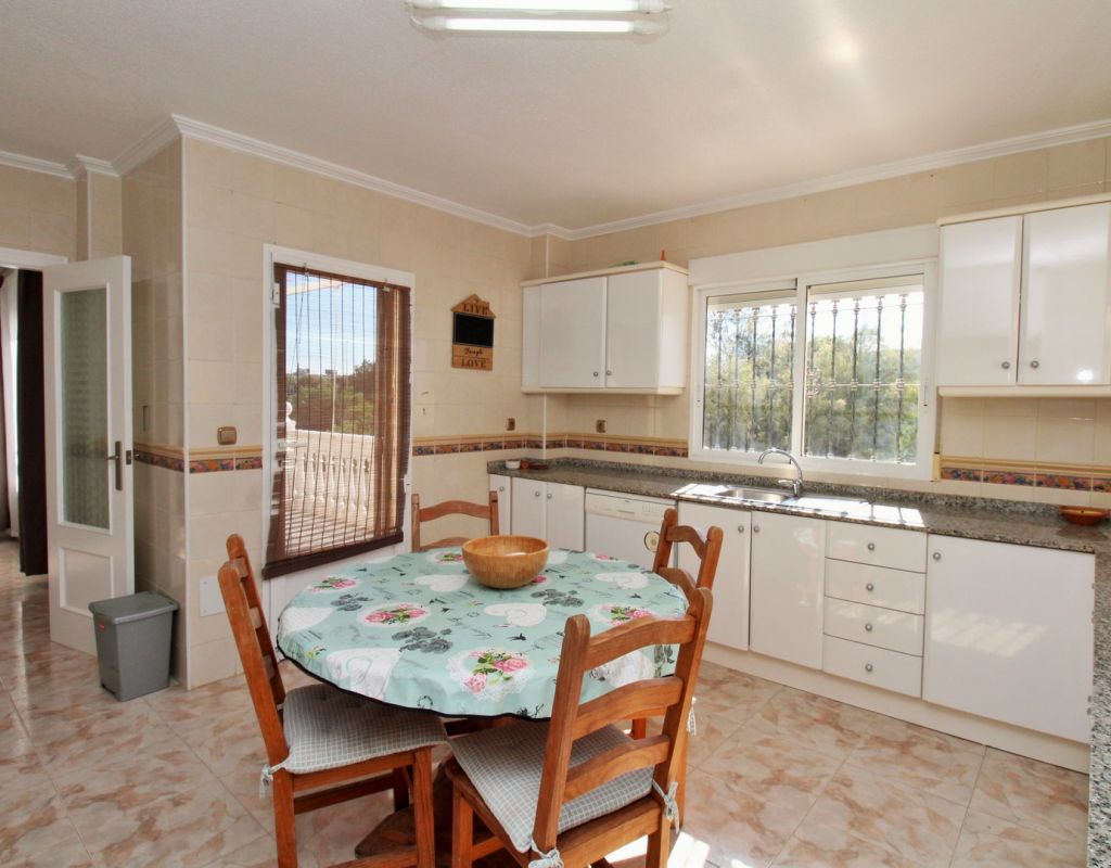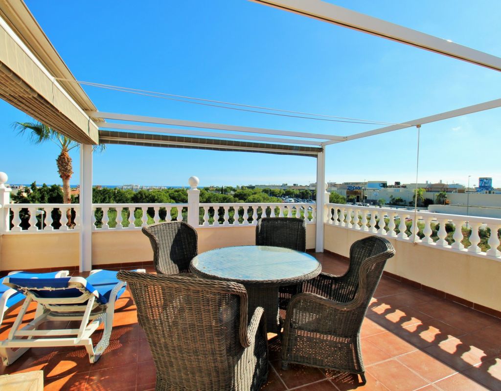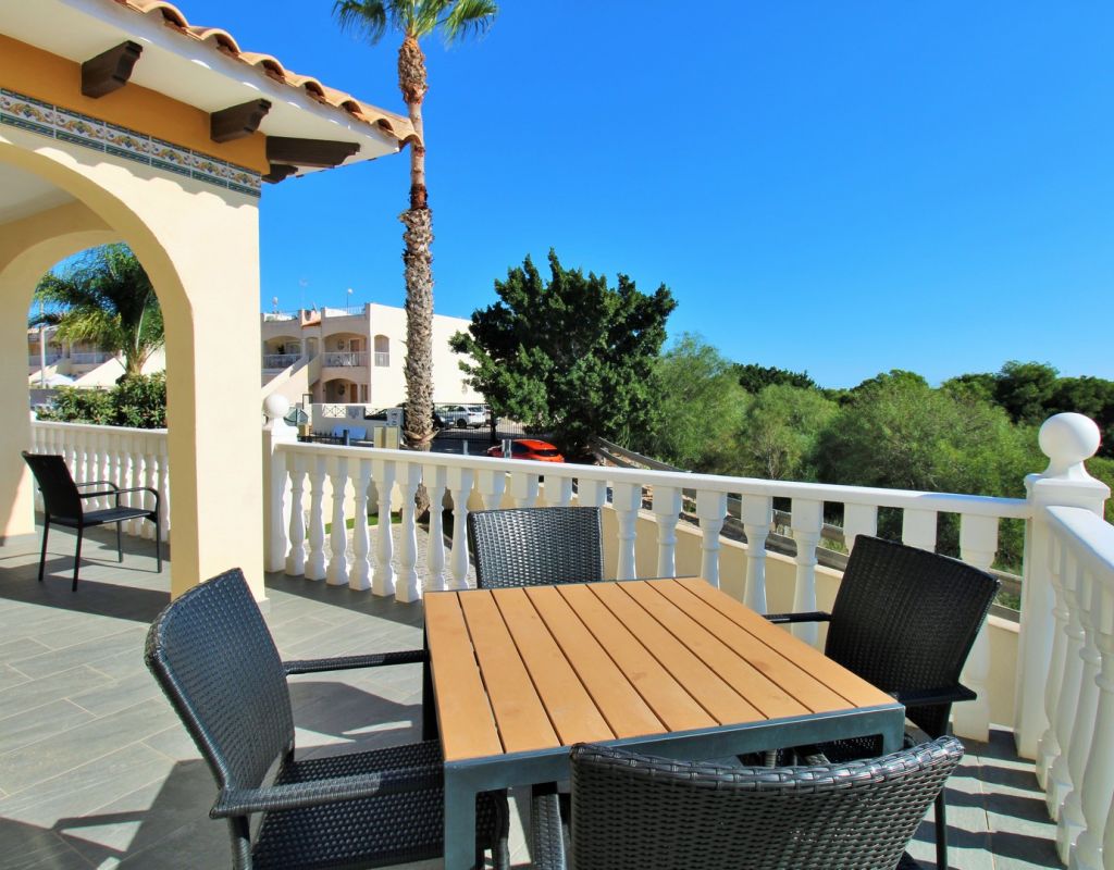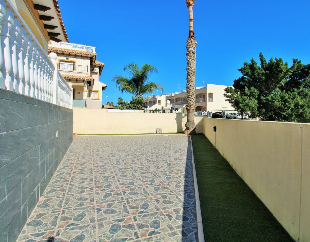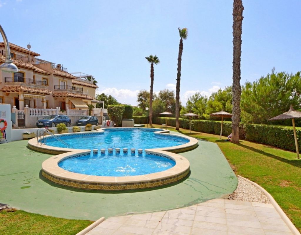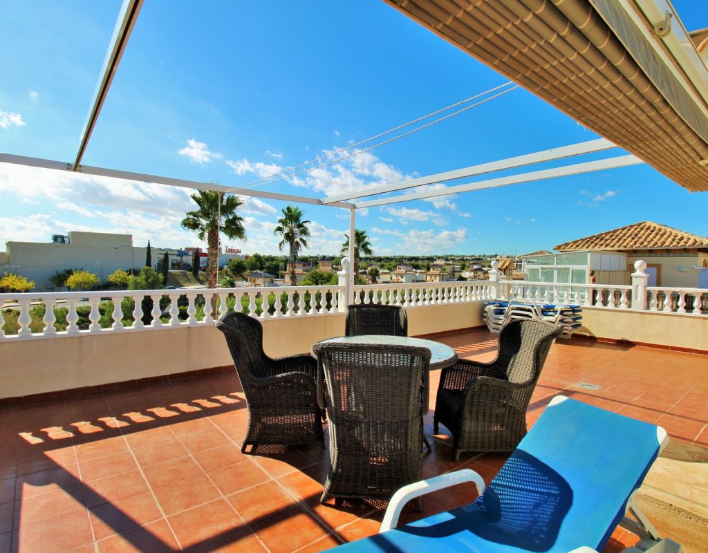 Excepcional oportunidad de adquirir una de las únicas tres villas independientes en la codiciada comunidad residencial San Jose I en Playa Flamenca. Ubicada en una parcela de esquina soleada, esta espaciosa villa de 4 dormitorios y 3 baños goza de una posición privilegiada, a solo unos pasos de la piscina comunitaria y a poca distancia a pie del centro comercial Zenia Boulevard, así como de una gran variedad de bares, restaurantes y supermercados. La vivienda ofrece una impresionante cantidad de espacio exterior, que incluye jardín embaldosado, entrada para coche, terraza elevada delantera, balcón con vistas a la piscina y un gran solárium privado en la azotea con vistas al mar y a la piscina, perfecto para relajarse o disfrutar al aire libre. En el interior, la planta baja dispone de un luminoso salón-comedor, una amplia cocina independiente con acceso a la terraza, un dormitorio doble y un baño con ducha a ras de suelo. En la planta superior hay tres dormitorios dobles con armarios empotrados y un baño familiar. El dormitorio principal cuenta con baño en suite y acceso a un balcón privado con vistas a la piscina. Desde las escaleras interiores se accede al amplio solárium, equipado con toldo retráctil y bonitas vistas al mar y alrededores. Destaca un gran sótano con dos habitaciones adicionales y acceso independiente, con gran potencial para crear un apartamento independiente, alojamiento para invitados o una sala de juegos o aficiones. Se vende amueblada, con electrodomésticos y aire acondicionado. Los propietarios en Villas de San Jose I disfrutan de piscina comunitaria y jardines bien cuidados. Ubicada en una zona privilegiada de Orihuela Costa, a poca distancia de Zenia Boulevard, Via Park I y a 20 minutos a pie de las playas de Cala Mosca y Cala Estaca, esta vivienda ofrece un excelente valor, espacio y versatilidad. Se recomienda visitar pronto para apreciar todo el potencial y la ubicación de esta villa única.