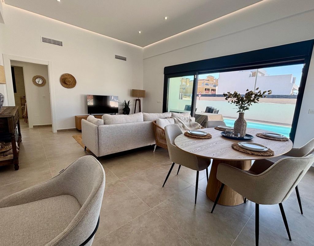 Modernas villas de nueva construcción en venta en Rafal: Costa Blanca Vivir con estilo y comodidad Villas contemporáneas en un encantador pueblo español Descubra estas excepcionales villas de nueva construcción situadas a las afueras de Rafal, un pueblo tradicional y pintoresco en el corazón de la Costa Blanca. Rafal ofrece un estilo de vida tranquilo rodeado de huertos, tiendas locales, cafeterías y barrios acogedores, al tiempo que proporciona un excelente acceso a los principales servicios. La localidad se encuentra a solo 30 km de Alicante y su aeropuerto internacional, y a poca distancia en coche de las hermosas playas del Mediterráneo y de los mejores campos de golf. Villas de primera calidad diseñadas para la vida moderna Cada villa está situada en una generosa parcela de más de 370 m², lo que ofrece un amplio espacio exterior, privacidad y comodidad. Estas viviendas de una sola planta cuentan con 3 amplios dormitorios y 2 modernos cuartos de baño, perfectamente diseñados tanto para la vida familiar como para las vacaciones. La amplia zona exterior incluye una piscina privada de 7 x 3,5 m, más de 100 m² de terraza abierta y un porche cubierto de 15 m² ideal para relajarse a la sombra. Los compradores también tienen la opción de añadir un solárium en la azotea y un trastero por un coste adicional, creando aún más espacio para disfrutar del clima mediterráneo y de las vistas panorámicas. Construcción de alta calidad y eficiencia energética Estas villas están construidas con materiales de primera calidad y características avanzadas de ahorro energético. Entre las características más destacadas se incluyen Ventanas de Schüco para un máximo aislamiento y durabilidad. Persianas motorizadas. Paneles solares fotovoltaicos para reducir el consumo de energía. Sistema de riego automático para el jardín. Puerta de acceso motorizada para vehículos. Suelos radiantes en los baños. Cada detalle está diseñado para proporcionar comodidad, eficiencia y un acabado contemporáneo y elegante. Ubicación ideal cerca de playas, campos de golf y servicios La ubicación estratégica de Rafal permite un fácil acceso a los principales puntos de interés Playas de Guardamar del Segura a 9 km Campos de golf La Finca y Vistabella a 10 km Ciudad de Orihuela a 7 km Aeropuerto Internacional de Alicante a 30 km Torrevieja a 20 km La propia localidad cuenta con supermercados, restaurantes, colegios, servicios médicos e instalaciones deportivas, lo que la convierte en un destino residencial perfecto durante todo el año. Disfrute de la tranquilidad, el sol y la vida mediterránea Estas villas de nueva construcción en Rafal ofrecen una oportunidad excepcional para disfrutar de un estilo de vida tranquilo con todas las comodidades modernas, una piscina privada y una excelente conectividad con lo mejor de la Costa Blanca a un precio inmejorable. Póngase en contacto con nosotros hoy mismo para asegurarse su nueva villa en Rafal y empezar a vivir la vida mediterránea que se merece.