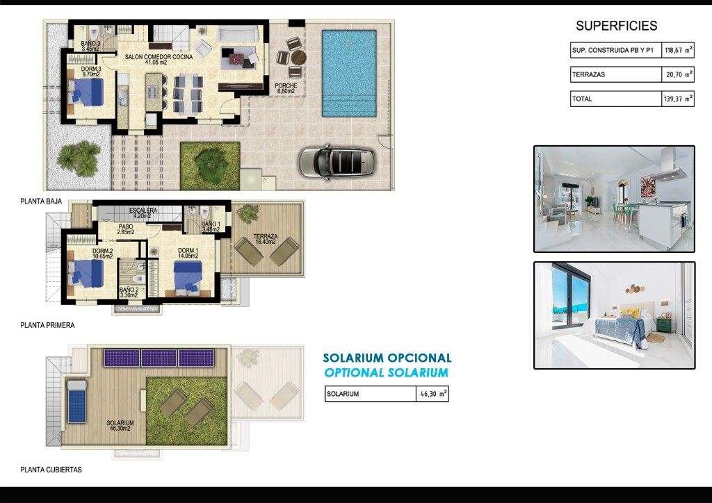 LA VENTA DE NUEVA PROMOCIÓN VILLAS EN EL CENTRO DE VISTA BELLA GOLF, COSTA BLANCAOfrecemos a la venta de villas independientes de 3 dormitorios, 3 baños en una nueva promoción de viviendas con piscina, situadas en el centro de Vista Bella, Costa Blanca. Las villas se benefician de jardines con entrada privada, solárium con terraza, aparte el salón comedor y cocina abierta. La propia urbanización cuenta con zonas verdes muy bien cuidadas y la piscina comunitaria de un tamaño muy generoso. Todas las villas de la urbanización tienen plaza de aparcamiento, y construidos con los materiales de alta calidad y tecnologías.La Vega Baja del Segura es una comarca situada en el extremo sur de la provincia de Alicante, en el límite con la Región de Murcia. Su capital, además de su ciudad más importante históricamente, es la ciudad de Orihuela.El relieve de la comarca es esencialmente la vega del valle fluvial del río Segura, donde podremos ver desde los Cotos del Segura, hasta su desembocadura, llamada la Gola del Segura. Por otra parte, tenemos la Costa Blanca, repleta de playas perfectamente habilitadas y las zonas montañosas del interior con cultivos de secano como el Parque Natural de las Lagunas de La Mata y Torrevieja.