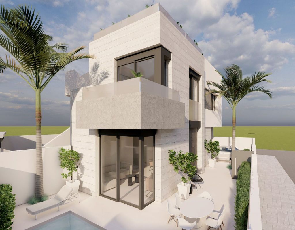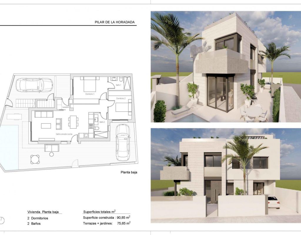 Exclusivos bungalows de nueva construcción con piscina privada en Pilar de la Horadada Vida moderna en una ubicación privilegiada de la Costa Blanca Descubra una exclusiva promoción de solo dos bungalows de primera calidad situados en el corazón de Pilar de la Horadada, una encantadora localidad costera de la Costa Blanca conocida por sus playas de arena fina, su ambiente tranquilo y su estilo de vida mediterráneo. El complejo residencial está situado a solo 2,5 km de la playa y a poca distancia a pie de supermercados, tiendas, restaurantes y servicios esenciales para el día a día. Con excelentes conexiones por carretera y el aeropuerto de Alicante a solo 45 km, esta ubicación ofrece el equilibrio perfecto entre tranquilidad, comodidad y accesibilidad. Dos viviendas únicas diseñadas para el confort El proyecto cuenta con dos elegantes viviendas de 2 dormitorios y 2 baños, diseñadas con acabados de alta calidad y distribuciones modernas. Uno de los baños es en suite, lo que proporciona mayor privacidad y comodidad. Cada propiedad ofrece su propia experiencia distintiva de vida al aire libre para adaptarse a diferentes preferencias de estilo de vida. Bungalow en planta baja con amplio jardín y piscina privada La unidad de la planta baja incluye un generoso jardín de 75 m2 ideal para comer al aire libre, tomar el sol y disfrutar del ocio. Se incluye una piscina privada, junto con un aparcamiento privado dentro de la parcela. Las grandes ventanas y los espacios abiertos crean un ambiente luminoso y acogedor en toda la casa. Bungalow ático con solárium y piscina privados La residencia de la planta superior ofrece una plaza de aparcamiento vallada en la planta baja y acceso a través de una escalera exterior. Cuenta con una amplia terraza y un solárium privado en la azotea con su propia piscina, creando un refugio exclusivo para disfrutar del clima mediterráneo y de las vistas abiertas. Estilo de vida en Pilar de la Horadada Este municipio costero es conocido por su ambiente tranquilo y relajado, sus hermosas playas, como Mil Palmeras, y su amplia oferta de actividades al aire libre. El buceo, el submarinismo, los paseos por la costa y el ciclismo forman parte del estilo de vida cotidiano que disfrutan tanto los residentes como los visitantes. Los amantes de la naturaleza apreciarán la proximidad de las salinas de San Pedro, situadas a unos 12 km, que ofrecen paisajes pintorescos y fauna silvestre. Distancias a puntos de interés clave Playa: 2,5 km Salinas de San Pedro: 12 km Lo Romero Golf: 6 km Aeropuerto de Alicante: 45 km Aeropuerto de Murcia: 40 km Torrevieja: 20 km Asegúrese hoy mismo su vivienda exclusiva Aproveche la oportunidad de adquirir una propiedad única con excepcionales espacios al aire libre en una de las zonas más deseadas de la Costa Blanca. Póngase en contacto con nosotros hoy mismo para concertar una visita y reservar su nueva vivienda en Pilar de la Horadada.