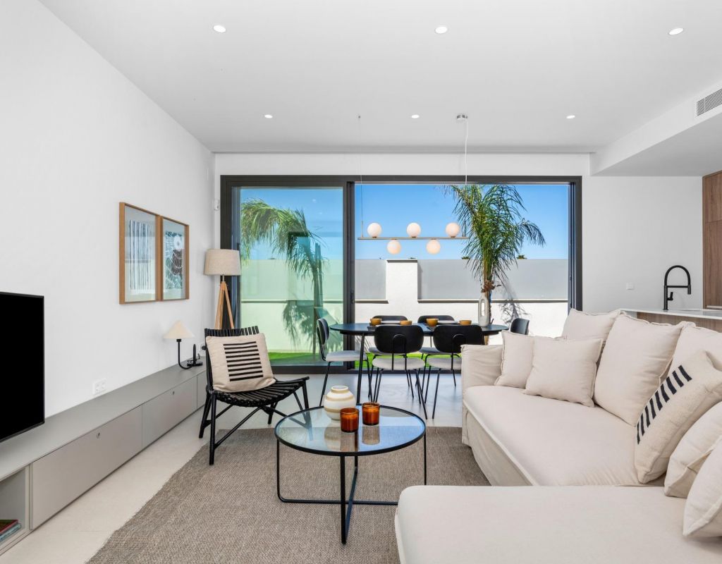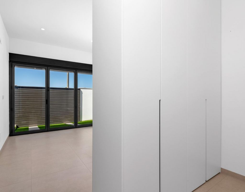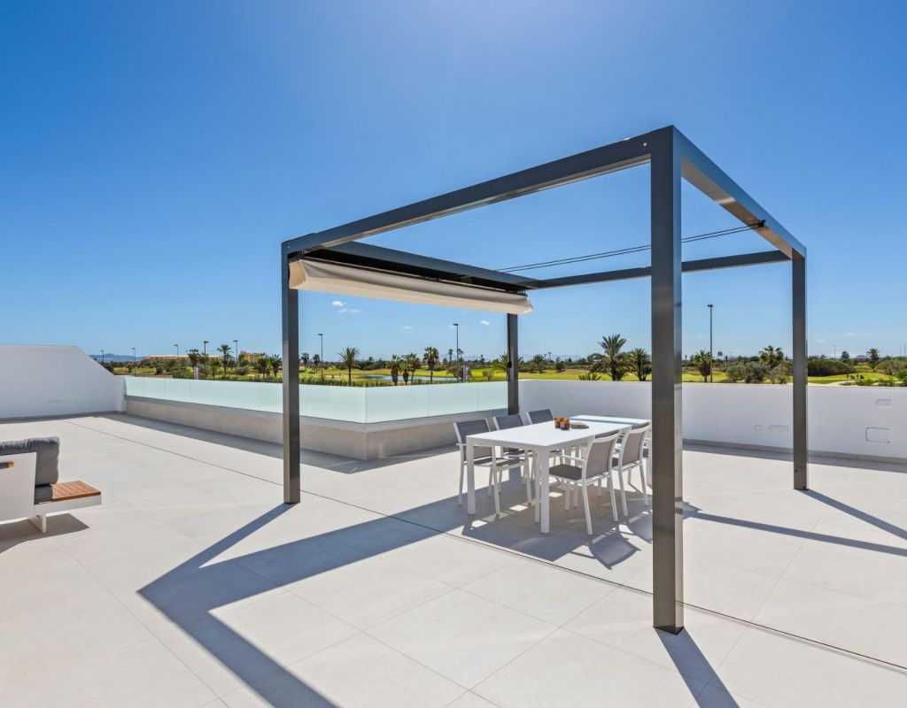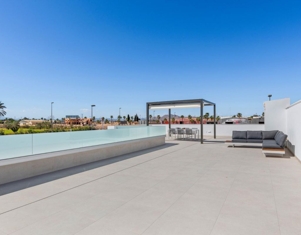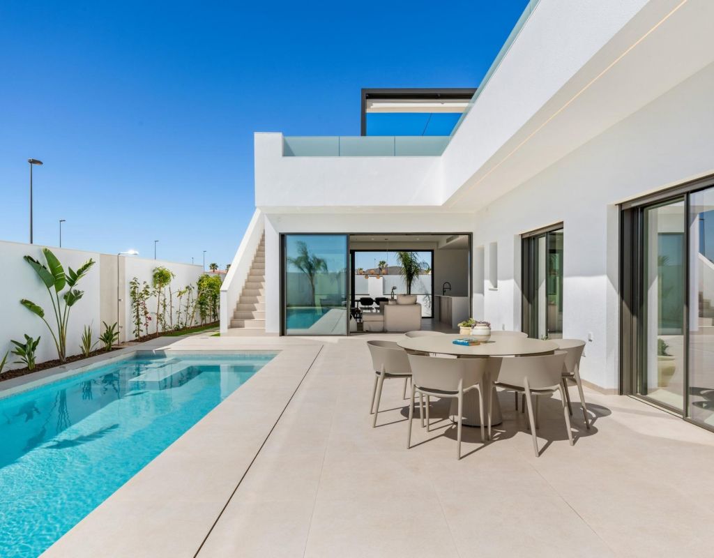 Villas de nueva construcción cerca de Serena Golf en Los Alcázares Villas modernas en una ubicación privilegiada junto a la costa y al campo de golf Este exclusivo proyecto residencial de nueva construcción ofrece villas modernas situadas en Los Alcázares, a poca distancia del prestigioso Serena Golf y a solo 1,2 km de las playas de arena del Mar Menor. Situadas en una de las zonas más atractivas de la Región de Murcia, estas viviendas combinan un diseño contemporáneo, comodidad y una excelente ubicación cerca del mar, del golf y de todos los servicios diarios. Los Alcázares es una localidad costera bien establecida, conocida por su estilo de vida relajado, su largo paseo marítimo, los deportes acuáticos y su clima templado durante todo el año. Diseño de una sola planta con espacios exteriores privados La promoción cuenta con elegantes villas de 3 dormitorios y 2 baños, disponibles en dos tamaños diferentes, de aproximadamente 106 m² y 130 m². El modelo más grande también incluye un aseo adicional para invitados. Todas las villas están diseñadas en una sola planta, lo que ofrece una vida práctica y cómoda. La cocina, el comedor y la sala de estar de planta abierta conectan directamente con una terraza y un jardín privado con piscina, creando un espacio ideal para la vida interior y exterior. Cada propiedad incluye también un solárium privado y una plaza de aparcamiento en la parcela. Acabados de alta calidad y equipamiento moderno Estas villas están construidas con materiales de alta calidad y equipadas con características modernas. Las cocinas, totalmente equipadas, están disponibles en acabado blanco brillante o madera e incluyen encimeras de cuarzo, fregadero de acero inoxidable, placa de inducción con extractor integrado, horno, microondas, lavadora, frigorífico integrado y lavavajillas. Los baños están equipados con muebles, espejos, iluminación y calentadores eléctricos de toallas. Otras características adicionales son las persianas eléctricas en los dormitorios, la iluminación LED en toda la propiedad y un completo sistema de aire acondicionado por conductos de Fujitsu. Piscina privada y confort energéticamente eficiente Cada villa incluye una piscina privada con acabado de azulejos cerámicos azules, escalones integrados e iluminación LED blanca. La piscina está preparada con preinstalación para una bomba de calor. La combinación de un control climático eficiente, una construcción moderna y un diseño bien pensado garantiza el confort durante todo el año. Excelente conectividad y distancias clave Las villas se encuentran a poca distancia a pie del centro de Los Alcázares y muy cerca de Serena Golf. La playa está a aproximadamente 1,2 km. La ciudad de Cartagena está a unos 20 km y ofrece una rica oferta cultural y gastronómica. El aeropuerto internacional de Murcia-Corvera está a unos 22 km y el de Alicante, a unos 90 km. También hay varios campos de golf y puertos deportivos en las cercanías, lo que hace que esta ubicación sea ideal tanto para vivir como para pasar las vacaciones. Su hogar ideal junto al mar y al golf Si busca una villa moderna de nueva construcción cerca de la playa y del golf en Los Alcázares, póngase en contacto con nosotros hoy mismo para obtener más información o concertar una visita privada.