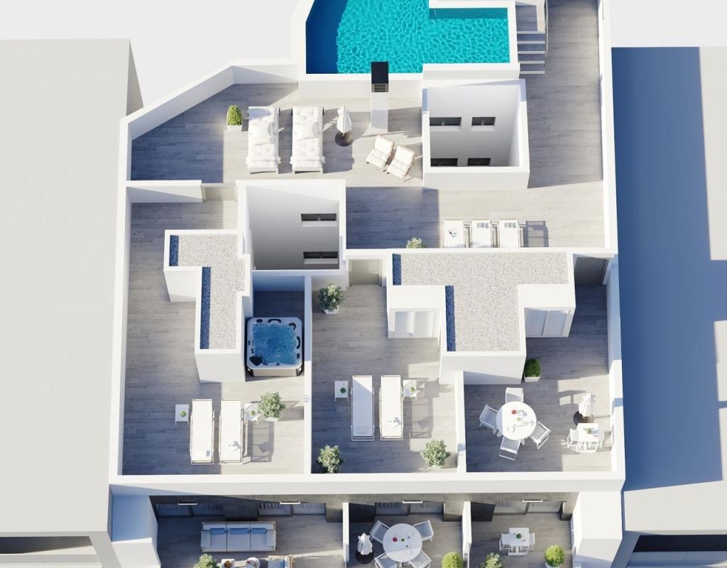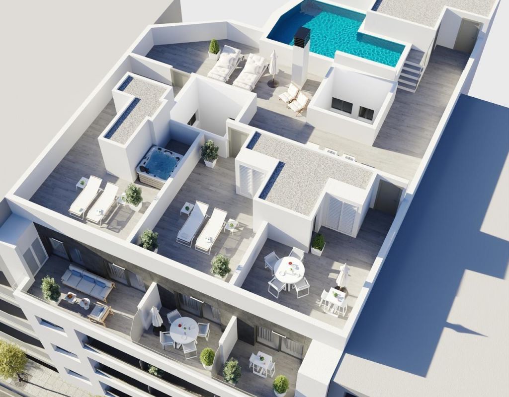 Apartamentos de nueva construcción en Torrevieja A solo 400 m de la Playa del Cura Ubicación privilegiada en el corazón de Torrevieja Descubra estos apartamentos y áticos a estrenar en una de las zonas más cotizadas de Torrevieja, a solo 400 m de la Playa del Cura y a 150 m del paseo marítimo. Situado en el centro de la ciudad, este animado barrio ofrece todos los servicios esenciales a poca distancia, incluyendo supermercados, tiendas, restaurantes, cafeterías y transporte público. Torrevieja es una conocida ciudad costera de la Costa Blanca, famosa por su clima mediterráneo templado, su animado ambiente y su estilo de vida junto al mar durante todo el año. Apartamentos modernos con distribuciones espaciosas Esta exclusiva promoción nueva consta de solo 12 apartamentos y áticos de 2 o 3 dormitorios, diseñados para ofrecer comodidad, funcionalidad y estilo contemporáneo. Los apartamentos de las plantas intermedias cuentan con amplias terrazas, mientras que los áticos disfrutan de un solárium privado adicional, ideal para tomar el sol o comer al aire libre. Todas las viviendas incluyen una cocina abierta conectada con el salón-comedor, lo que crea interiores luminosos y acogedores. Los dormitorios cuentan con armarios empotrados y los baños están totalmente equipados con muebles, espejos y mamparas de ducha. Hay plazas de aparcamiento subterráneo y trasteros opcionales disponibles con un coste adicional. Acabados de calidad y características de eficiencia energética Los apartamentos están construidos con materiales de alta calidad y un fuerte enfoque en la eficiencia energética. La carpintería exterior de aluminio incluye tecnología de rotura de puente térmico y doble acristalamiento para el aislamiento térmico y acústico. Las persianas motorizadas añaden comodidad y seguridad. Cada vivienda cuenta con preinstalación de aire acondicionado y calefacción por conductos, puertas de entrada reforzadas y puertas interiores lacadas en blanco. El agua caliente se produce mediante un sistema aerotérmico, lo que reduce el consumo de energía y mejora la sostenibilidad. Solárium en la azotea con piscina comunitaria Los residentes pueden disfrutar de un solárium exclusivo en la azotea con piscina comunitaria, accesible por ascensor o escaleras. Esta zona privada es perfecta para relajarse, tomar el sol y disfrutar de las vistas panorámicas de la ciudad. Ofrece un refugio tranquilo sobre las animadas calles de Torrevieja y añade un valor significativo a la promoción. Estilo de vida y alrededores de Torrevieja Torrevieja es conocida por su extenso litoral, sus playas de arena y sus emblemáticas salinas. El Parque Natural de las Lagunas de La Mata y Torrevieja se encuentra a unos 5 km y ofrece rutas de senderismo y paisajes únicos. Varios campos de golf, como Villamartin Golf y Las Colinas Golf, se encuentran a entre 12 y 18 km. El puerto deportivo y el puerto de Torrevieja están a aproximadamente 1 km. El aeropuerto de Alicante está a unos 45 km y el aeropuerto internacional de Murcia a unos 65 km, ambos con excelentes conexiones europeas. Su hogar en la costa le espera No pierda esta oportunidad de adquirir un moderno apartamento de nueva construcción cerca de la playa en Torrevieja. Póngase en contacto con nosotros hoy mismo para obtener más información o concertar una visita privada.