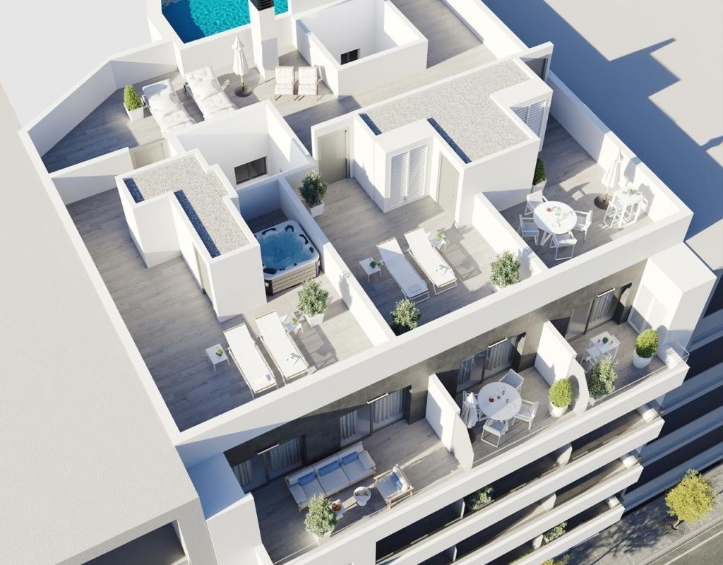 Apartamentos de nueva construcción en Torrevieja A solo 400 m de la Playa del Cura Ubicación privilegiada en el corazón de Torrevieja Descubra estos apartamentos y áticos a estrenar en una de las zonas más cotizadas de Torrevieja, a solo 400 m de la Playa del Cura y a 150 m del paseo marítimo. Situado en el centro de la ciudad, este animado barrio ofrece todos los servicios esenciales a poca distancia, incluyendo supermercados, tiendas, restaurantes, cafeterías y transporte público. Torrevieja es una conocida ciudad costera de la Costa Blanca, famosa por su clima mediterráneo templado, su animado ambiente y su estilo de vida junto al mar durante todo el año. Apartamentos modernos con distribuciones espaciosas Esta exclusiva promoción nueva consta de solo 12 apartamentos y áticos de 2 o 3 dormitorios, diseñados para ofrecer comodidad, funcionalidad y estilo contemporáneo. Los apartamentos de las plantas intermedias cuentan con amplias terrazas, mientras que los áticos disfrutan de un solárium privado adicional, ideal para tomar el sol o comer al aire libre. Todas las viviendas incluyen una cocina abierta conectada con el salón-comedor, lo que crea interiores luminosos y acogedores. Los dormitorios cuentan con armarios empotrados y los baños están totalmente equipados con muebles, espejos y mamparas de ducha. Hay plazas de aparcamiento subterráneo y trasteros opcionales disponibles con un coste adicional. Acabados de calidad y características de eficiencia energética Los apartamentos están construidos con materiales de alta calidad y un fuerte enfoque en la eficiencia energética. La carpintería exterior de aluminio incluye tecnología de rotura de puente térmico y doble acristalamiento para el aislamiento térmico y acústico. Las persianas motorizadas añaden comodidad y seguridad. Cada vivienda cuenta con preinstalación de aire acondicionado y calefacción por conductos, puertas de entrada reforzadas y puertas interiores lacadas en blanco. El agua caliente se produce mediante un sistema aerotérmico, lo que reduce el consumo de energía y mejora la sostenibilidad. Solárium en la azotea con piscina comunitaria Los residentes pueden disfrutar de un solárium exclusivo en la azotea con piscina comunitaria, accesible por ascensor o escaleras. Esta zona privada es perfecta para relajarse, tomar el sol y disfrutar de las vistas panorámicas de la ciudad. Ofrece un refugio tranquilo sobre las animadas calles de Torrevieja y añade un valor significativo a la promoción. Estilo de vida y alrededores de Torrevieja Torrevieja es conocida por su extenso litoral, sus playas de arena y sus emblemáticas salinas. El Parque Natural de las Lagunas de La Mata y Torrevieja se encuentra a unos 5 km y ofrece rutas de senderismo y paisajes únicos. Varios campos de golf, como Villamartin Golf y Las Colinas Golf, se encuentran a entre 12 y 18 km. El puerto deportivo y el puerto de Torrevieja están a aproximadamente 1 km. El aeropuerto de Alicante está a unos 45 km y el aeropuerto internacional de Murcia a unos 65 km, ambos con excelentes conexiones europeas. Su hogar en la costa le espera No pierda esta oportunidad de adquirir un moderno apartamento de nueva construcción cerca de la playa en Torrevieja. Póngase en contacto con nosotros hoy mismo para obtener más información o concertar una visita privada.