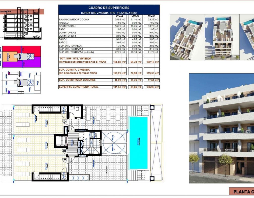Apartamentos de nueva construcción en Torrevieja A solo 600 m de la Playa del Cura Ubicación privilegiada en el corazón de Torrevieja Descubra estos apartamentos y áticos a estrenar en una de las zonas más cotizadas de Torrevieja, a solo 600 m de la Playa del Cura y a 300 m del paseo marítimo. Situado en el centro de la ciudad, este animado barrio ofrece todos los servicios esenciales a poca distancia, incluyendo supermercados, tiendas, restaurantes, cafeterías y transporte público. Torrevieja es una conocida ciudad costera de la Costa Blanca, famosa por su clima mediterráneo templado, su animado ambiente y su estilo de vida junto al mar durante todo el año. Apartamentos modernos con distribuciones espaciosas Esta exclusiva promoción nueva consta de solo 12 apartamentos y áticos de 1 o 3 dormitorios, diseñados para ofrecer comodidad, funcionalidad y estilo contemporáneo. Los apartamentos de las plantas intermedias cuentan con amplias terrazas, mientras que los áticos disfrutan de un solárium privado adicional, ideal para tomar el sol o comer al aire libre. Todas las viviendas incluyen una cocina abierta conectada con el salón-comedor, lo que crea interiores luminosos y acogedores. Los dormitorios cuentan con armarios empotrados y los baños están totalmente equipados con muebles, espejos y mamparas de ducha. Hay plazas de aparcamiento opcionales disponibles con un coste adicional. Acabados de calidad y características de eficiencia energética Los apartamentos están construidos con materiales de alta calidad y un fuerte enfoque en la eficiencia energética. La carpintería exterior de aluminio incluye tecnología de rotura de puente térmico y doble acristalamiento para el aislamiento térmico y acústico. Las persianas motorizadas añaden comodidad y seguridad. Cada vivienda cuenta con preinstalación de aire acondicionado y calefacción por conductos, puertas de entrada reforzadas y puertas interiores lacadas en blanco. El agua caliente se produce mediante un sistema aerotérmico, lo que reduce el consumo de energía y mejora la sostenibilidad. Solárium en la azotea con piscina comunitaria Los residentes pueden disfrutar de un solárium exclusivo en la azotea con piscina comunitaria, accesible por ascensor o escaleras. Esta zona privada es perfecta para relajarse, tomar el sol y disfrutar de las vistas panorámicas de la ciudad. Ofrece un refugio tranquilo sobre las animadas calles de Torrevieja y añade un valor significativo a la promoción. Estilo de vida y alrededores de Torrevieja Torrevieja es conocida por su extenso litoral, sus playas de arena y sus emblemáticas salinas. El Parque Natural de las Lagunas de La Mata y Torrevieja se encuentra a unos 5 km y ofrece rutas de senderismo y paisajes únicos. Varios campos de golf, como Villamartin Golf y Las Colinas Golf, se encuentran a entre 12 y 18 km. El puerto deportivo y el puerto de Torrevieja están a aproximadamente 1 km. El aeropuerto de Alicante está a unos 45 km y el aeropuerto internacional de Murcia a unos 65 km, ambos con excelentes conexiones europeas. Su hogar en la costa le espera No pierda esta oportunidad de adquirir un moderno apartamento de nueva construcción cerca de la playa en Torrevieja. Póngase en contacto con nosotros hoy mismo para obtener más información o concertar una visita privada.