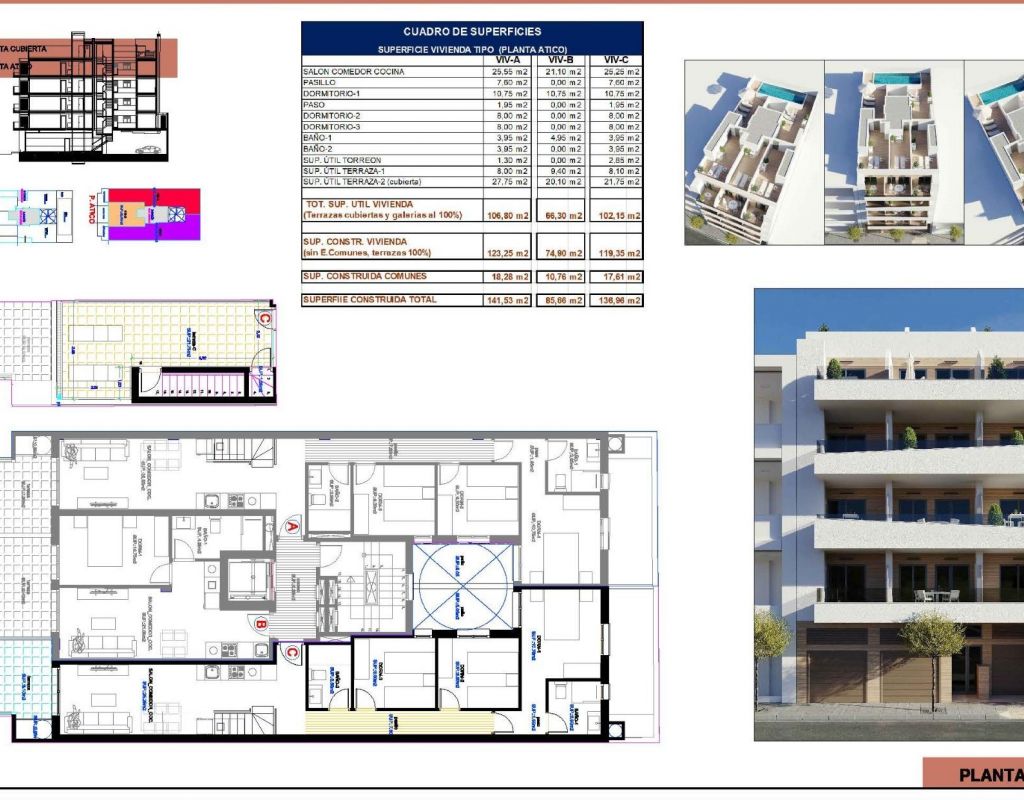 Apartamentos de nueva construcción en Torrevieja A solo 600 m de la Playa del Cura Ubicación privilegiada en el corazón de Torrevieja Descubra estos apartamentos y áticos a estrenar en una de las zonas más cotizadas de Torrevieja, a solo 600 m de la Playa del Cura y a 300 m del paseo marítimo. Situado en el centro de la ciudad, este animado barrio ofrece todos los servicios esenciales a poca distancia, incluyendo supermercados, tiendas, restaurantes, cafeterías y transporte público. Torrevieja es una conocida ciudad costera de la Costa Blanca, famosa por su clima mediterráneo templado, su animado ambiente y su estilo de vida junto al mar durante todo el año. Apartamentos modernos con distribuciones espaciosas Esta exclusiva promoción nueva consta de solo 12 apartamentos y áticos de 1 o 3 dormitorios, diseñados para ofrecer comodidad, funcionalidad y estilo contemporáneo. Los apartamentos de las plantas intermedias cuentan con amplias terrazas, mientras que los áticos disfrutan de un solárium privado adicional, ideal para tomar el sol o comer al aire libre. Todas las viviendas incluyen una cocina abierta conectada con el salón-comedor, lo que crea interiores luminosos y acogedores. Los dormitorios cuentan con armarios empotrados y los baños están totalmente equipados con muebles, espejos y mamparas de ducha. Hay plazas de aparcamiento opcionales disponibles con un coste adicional. Acabados de calidad y características de eficiencia energética Los apartamentos están construidos con materiales de alta calidad y un fuerte enfoque en la eficiencia energética. La carpintería exterior de aluminio incluye tecnología de rotura de puente térmico y doble acristalamiento para el aislamiento térmico y acústico. Las persianas motorizadas añaden comodidad y seguridad. Cada vivienda cuenta con preinstalación de aire acondicionado y calefacción por conductos, puertas de entrada reforzadas y puertas interiores lacadas en blanco. El agua caliente se produce mediante un sistema aerotérmico, lo que reduce el consumo de energía y mejora la sostenibilidad. Solárium en la azotea con piscina comunitaria Los residentes pueden disfrutar de un solárium exclusivo en la azotea con piscina comunitaria, accesible por ascensor o escaleras. Esta zona privada es perfecta para relajarse, tomar el sol y disfrutar de las vistas panorámicas de la ciudad. Ofrece un refugio tranquilo sobre las animadas calles de Torrevieja y añade un valor significativo a la promoción. Estilo de vida y alrededores de Torrevieja Torrevieja es conocida por su extenso litoral, sus playas de arena y sus emblemáticas salinas. El Parque Natural de las Lagunas de La Mata y Torrevieja se encuentra a unos 5 km y ofrece rutas de senderismo y paisajes únicos. Varios campos de golf, como Villamartin Golf y Las Colinas Golf, se encuentran a entre 12 y 18 km. El puerto deportivo y el puerto de Torrevieja están a aproximadamente 1 km. El aeropuerto de Alicante está a unos 45 km y el aeropuerto internacional de Murcia a unos 65 km, ambos con excelentes conexiones europeas. Su hogar en la costa le espera No pierda esta oportunidad de adquirir un moderno apartamento de nueva construcción cerca de la playa en Torrevieja. Póngase en contacto con nosotros hoy mismo para obtener más información o concertar una visita privada.
