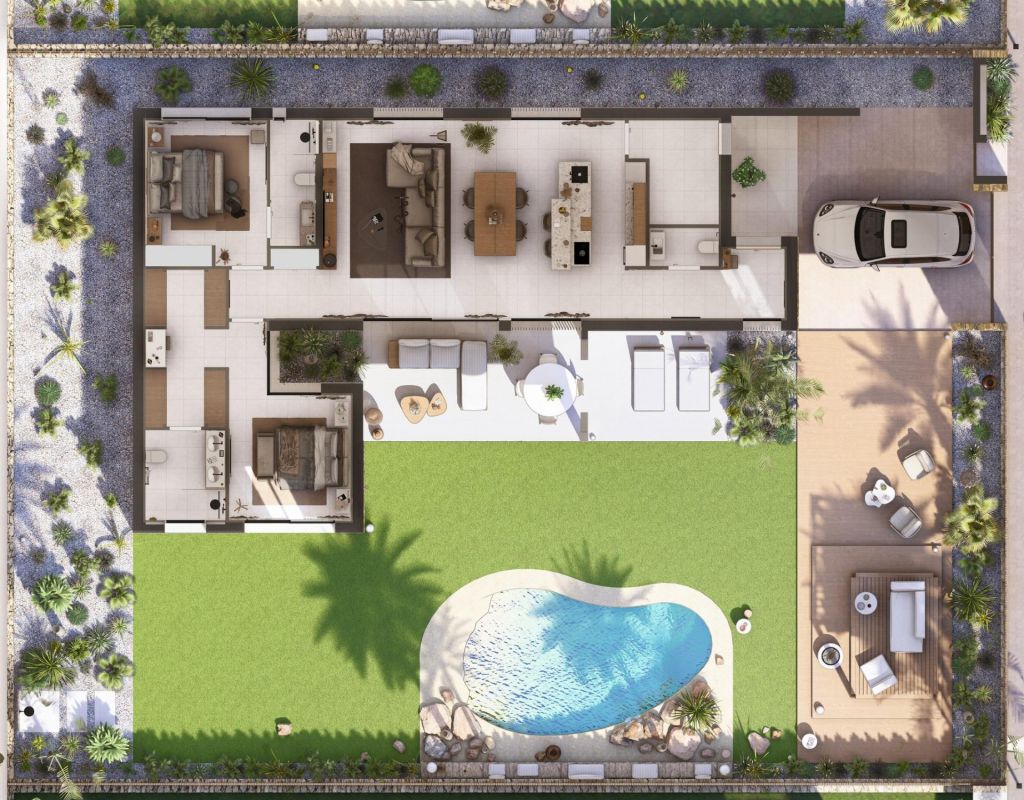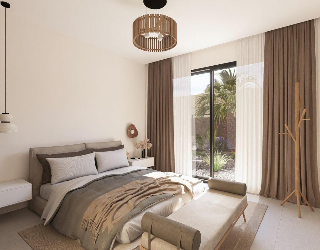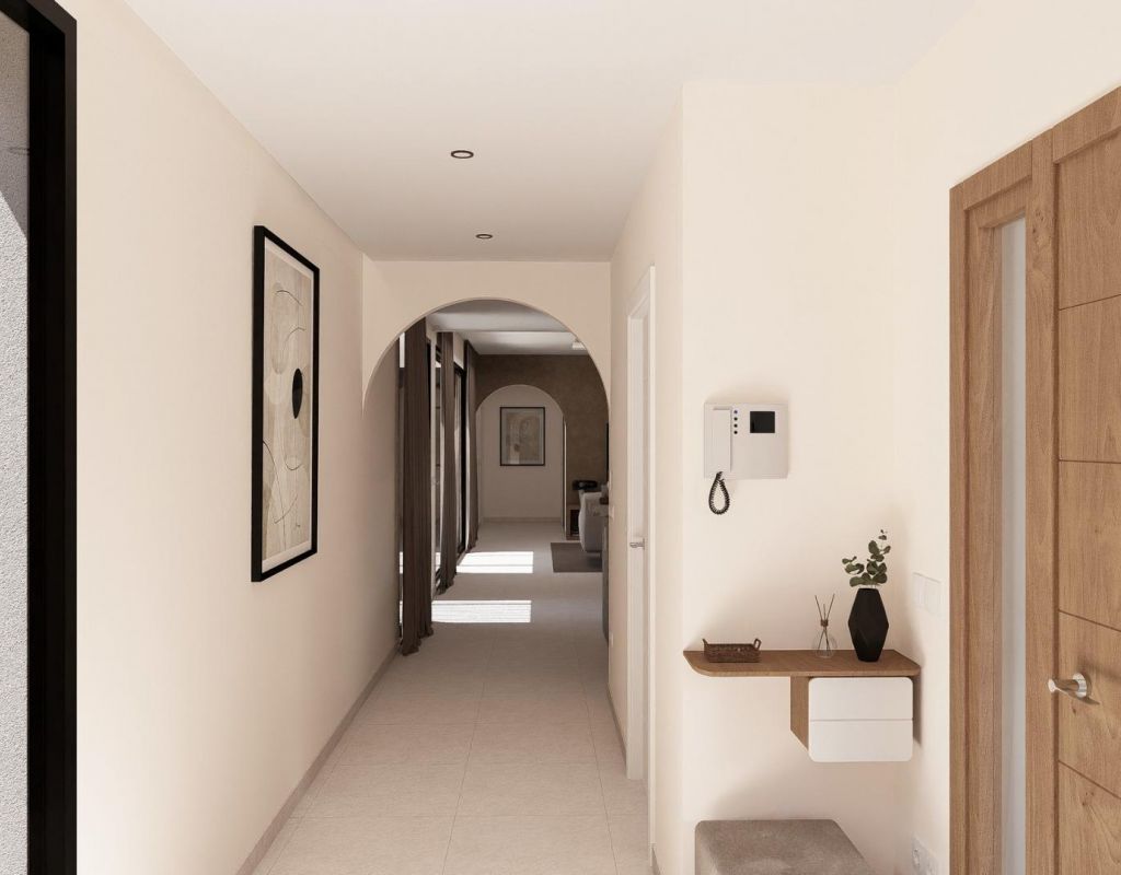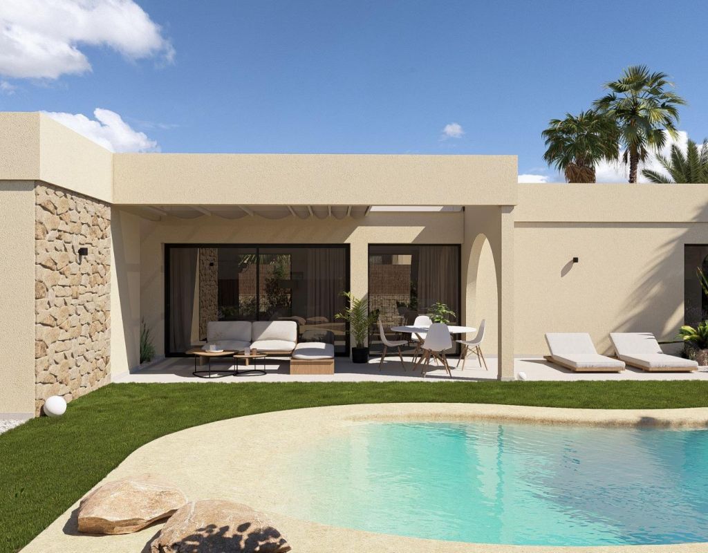 Villas contemporáneas de una sola planta en Altaona Golf Resort Murcia Ubicación privilegiada en un complejo de golf cerca de la ciudad de Murcia Descubra esta exclusiva colección de villas independientes de nueva construcción situadas en el prestigioso complejo Altaona Golf Resort en Murcia. Ubicada en un entorno seguro y tranquilo, rodeada de naturaleza y de un campo de golf de 18 hoyos, esta comunidad residencial ofrece el equilibrio perfecto entre tranquilidad y accesibilidad. Altaona Golf se encuentra a solo 15 km del centro de Murcia, donde encontrará centros comerciales, restaurantes, colegios y servicios médicos, mientras que las playas de la Costa Cálida están a solo 20 km. El aeropuerto de Murcia-Corvera está convenientemente situado a 15 km del complejo, lo que lo convierte en un lugar ideal tanto para vivir de forma permanente como para pasar las vacaciones. Diseño moderno de una sola planta con jardín y piscina privados Estas elegantes villas están diseñadas en una sola planta para ofrecer el máximo confort y funcionalidad. Los compradores pueden elegir entre 2, 3 o 4 dormitorios y 2 o 3 baños, además de un aseo para invitados. Cada vivienda cuenta con una cocina y una sala de estar diáfanas que conectan a la perfección con la terraza exterior y el jardín privado con piscina. La parcela incluye una plaza de aparcamiento privada, lo que garantiza la comodidad y la privacidad. Viviendas energéticamente eficientes con características de alta calidad Todas las villas cuentan con un certificado energético de clase A, lo que garantiza una excelente eficiencia energética y bajos costes de funcionamiento. Las propiedades incluyen aire acondicionado por conductos con bomba de calor en toda la casa, excepto en los baños, y calefacción eléctrica por suelo radiante en el salón y los baños con termostatos independientes por zonas. Un sistema de ventilación mecánica renueva el aire de las cocinas, los baños, el lavadero y el aseo de invitados, mejorando el confort interior. La cocina está equipada con campana extractora y placa de inducción eléctrica. La iluminación LED está incluida en el salón, el pasillo y las zonas exteriores, mientras que el resto de habitaciones están preparadas para que el propietario personalice la iluminación. Los dormitorios están equipados con puntos de carga USB para mayor comodidad. Tecnología domótica y comunidad segura Cada villa incluye un sistema de videoportero, domótica con dos interruptores inteligentes y acceso motorizado para vehículos a la comunidad cerrada. El jardín privado se entrega ajardinado con un sistema de riego por goteo y una atractiva piscina privada, ideal para disfrutar del clima mediterráneo durante todo el año. Distancias a puntos de interés clave Campo de golf Altaona 0,1 km Centro de la ciudad de Murcia 15 km Playas de Los Alcázares y Mar Menor 20 km Aeropuerto de Murcia Corvera 15 km Centros comerciales y servicios 10 km Hacienda Riquelme Golf Resort 12 km Su nuevo estilo de vida en Altaona Golf le espera Disfrute del golf, la naturaleza, la seguridad y el confort moderno en uno de los complejos turísticos más atractivos de la región de Murcia. Póngase en contacto con nosotros hoy mismo para recibir más información o concertar una visita a estas hermosas villas de nueva construcción.