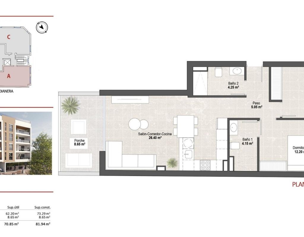 Apartamentos de nueva construcción con licencia turística cerca de la playa en Lo Pagán, San Pedro del Pinatar Vida costera moderna con gran potencial de alquiler Esta exclusiva promoción de 12 modernos apartamentos con licencia turística se encuentra en Lo Pagán, una popular zona costera de San Pedro del Pinatar, a solo 1 km de la playa. Situado a orillas del Mar Menor, este proyecto ofrece una oportunidad única para disfrutar del estilo de vida mediterráneo y beneficiarse al mismo tiempo de un excelente potencial de alquiler vacacional en una zona muy demandada. Lo Pagán es conocida por su ambiente relajado, sus baños de barro naturales, su paseo marítimo repleto de restaurantes y cafeterías, y su fácil acceso tanto al Mar Menor como al mar Mediterráneo. Es un destino consolidado para los amantes de la playa, los entusiastas de los deportes acuáticos y las familias que buscan aguas tranquilas y poco profundas y sol durante todo el año. Elección de apartamentos de 1 y 2 dormitorios El proyecto ofrece apartamentos de 1 dormitorio y 1 baño o de 2 dormitorios y 2 baños, uno de ellos en suite. Cada propiedad cuenta con una terraza privada de aproximadamente 9 m2 y una luminosa distribución diáfana en la que la cocina totalmente equipada con electrodomésticos se conecta a la perfección con la zona de estar. Todos los apartamentos incluyen un trastero privado en la azotea. Algunas unidades incluyen una plaza de aparcamiento y hay plazas de aparcamiento adicionales disponibles como opción. Acabados de alta calidad y comodidad moderna Estas viviendas se entregan totalmente equipadas con materiales y acabados de calidad diseñados para ofrecer comodidad y durabilidad: Aire acondicionado por conductos totalmente instalado Puerta de entrada blindada Persianas eléctricas en el salón y los dormitorios Sistema aerotérmico para agua caliente Iluminación LED Baños con muebles, mamparas de ducha y toalleros eléctricos Gres porcelánico de PORCELANOSA Cocinas equipadas con electrodomésticos modernos Zonas comunes en la azotea con piscina, gimnasio y solárium Uno de los aspectos más destacados de esta promoción es la zona común de la azotea, a la que se puede acceder fácilmente en ascensor. Los residentes y sus invitados pueden disfrutar de una piscina, un gimnasio totalmente equipado y un amplio solárium con césped artificial y tumbonas, todo ello con vistas abiertas a la zona costera circundante. Excelente ubicación cerca de playas, puertos deportivos y servicios Los apartamentos se encuentran a poca distancia de tiendas, restaurantes y servicios diarios, lo que los hace ideales tanto para uso personal como para alquiler vacacional. Distancias a puntos de interés clave Playa de Lo Pagán 1 km Puerto deportivo de San Pedro 1,5 km Centro comercial Dos Mares 2 km Lo Romero Golf 10 km Aeropuerto internacional de Murcia 35 km Aeropuerto de Alicante 80 km Una inversión inteligente junto al mar Tanto si busca una vivienda vacacional, una inversión para alquilar o ambas cosas, estos apartamentos con licencia turística en Lo Pagán ofrecen una combinación inmejorable de ubicación, calidad y potencial de alquiler. Póngase en contacto con nosotros hoy mismo para recibir más información o concertar una visita a estos excepcionales apartamentos junto al mar.