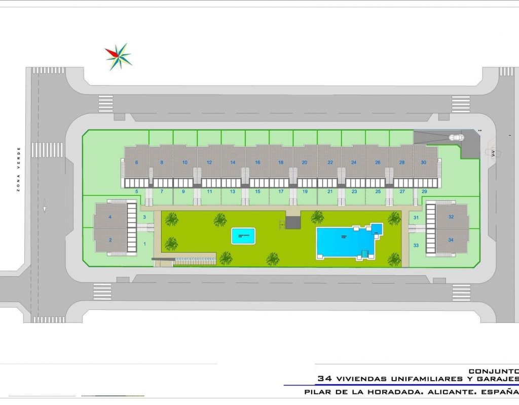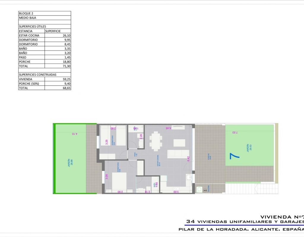 Bungalows de nueva construcción con jardín o solárium cerca de la playa en Pilar de la Horadada Modernas viviendas mediterráneas diseñadas para el confort Descubra este exclusivo complejo residencial de nueva construcción en Pilar de la Horadada, que ofrece bungalows contemporáneos situados a menos de 2 km de la playa. Diseñadas para combinar confort, estilo y funcionalidad, estas viviendas son ideales para vivir todo el año, pasar las vacaciones o como una inteligente inversión en la Costa Blanca. La promoción ofrece la posibilidad de elegir entre bungalows en planta baja con jardín privado y bungalows en la planta superior con solárium privado en la azotea. Cada propiedad está cuidadosamente diseñada para maximizar la vida al aire libre y aprovechar al máximo el clima mediterráneo. Amplias propiedades de 2 dormitorios con acabados de alta calidad Cada bungalow cuenta con 2 dormitorios y 2 baños, uno de ellos en suite, además de una plaza de aparcamiento privada en el garaje subterráneo. Las viviendas están construidas con materiales de calidad y acabados modernos que garantizan la eficiencia energética y la durabilidad. Las características principales incluyen: Preinstalación de aire acondicionado por conductos Carpintería exterior de aluminio con doble acristalamiento y persianas motorizadas Puerta de entrada de seguridad para mayor tranquilidad Sistema aerotérmico para una producción eficiente de agua caliente Armarios empotrados en todos los dormitorios Baños totalmente equipados con muebles y mamparas de ducha Estas especificaciones proporcionan una vivienda cómoda y práctica, adecuada para todas las estaciones. Comunidad privada con piscina y jardines paisajísticos El complejo residencial es privado y seguro, con hermosos jardines comunitarios y una gran piscina comunitaria. Esto crea un ambiente agradable y relajante donde los residentes pueden descansar y disfrutar del excelente clima. Situado a las afueras del centro de la ciudad, la urbanización permite a los residentes ir andando a supermercados, restaurantes, bares, colegios y servicios esenciales sin necesidad de utilizar el coche. Excelente ubicación cerca de playas y servicios Pilar de la Horadada es una encantadora localidad española situada en el extremo sur de la Costa Blanca, conocida por su animado ambiente, sus tiendas locales, sus plazas tradicionales y su acogedora comunidad. Las playas de arena de Torre de la Horadada y Mil Palmeras están a solo 2 km y ofrecen arena fina y dorada, un pintoresco paseo marítimo y un puerto deportivo. La zona también es ideal para practicar ciclismo, senderismo y deportes al aire libre. Distancias a puntos de interés clave Lo Romero Golf 5 km La Zenia Boulevard 15 km Aeropuerto de Murcia Corvera 40 km Aeropuerto de Alicante 55 km Puerto deportivo de Torre de la Horadada 3 km Reserve hoy mismo su nueva vivienda No pierda esta oportunidad de adquirir un bungalow a estrenar cerca de la playa en una de las zonas más cotizadas de la Costa Blanca. Póngase en contacto con nosotros hoy mismo para obtener más información y concertar una visita.
