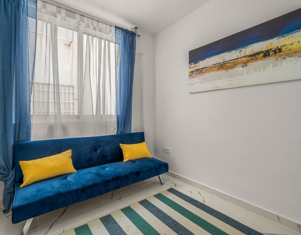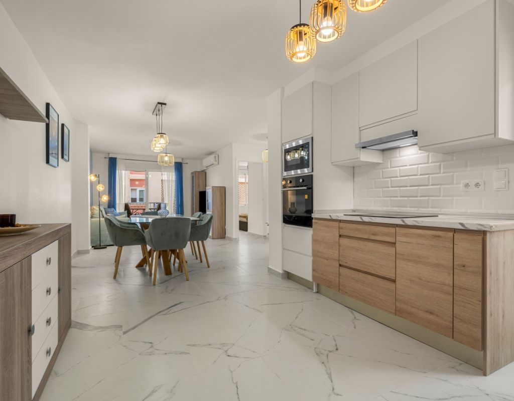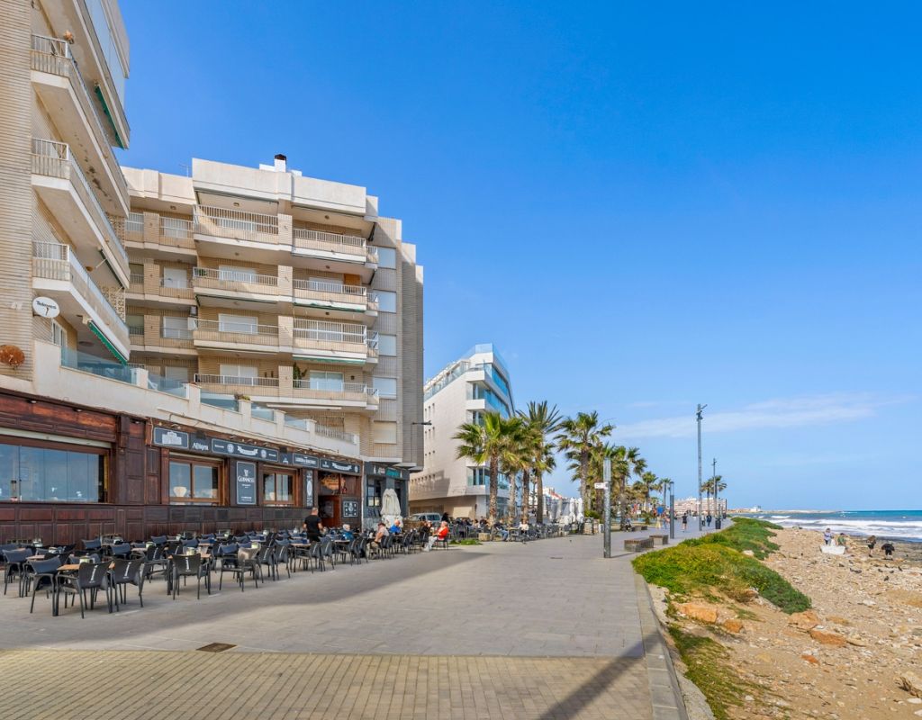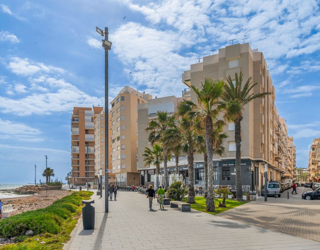 Magnífico piso de 75 m² completamente reformado, listo para entrar a vivir. La vivienda cuenta con 3 amplias habitaciones, una de ellas en suite, y un baño adicional, ambos equipados con ducha. Dispone de una moderna cocina totalmente equipada, con acceso a un práctico patio interior donde se ubica la zona de lavandería. El salón-comedor se integra con la cocina en un espacio abierto, luminoso y diáfano, ideal para disfrutar en familia o con amigos. Todas las habitaciones están equipadas con ventiladores de techo y aire acondicionado, garantizando confort durante todo el año. El apartamento ofrece vistas laterales al mar y se encuentra en una ubicación privilegiada, en la Playa del Cura (Torrevieja), a pocos pasos del mar y del paseo marítimo, rodeado de zonas de ocio, restaurantes y todos los servicios. Se vende completamente amueblado e incluye plaza de garaje.
