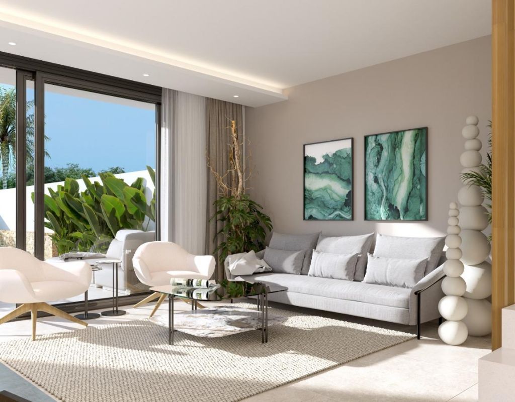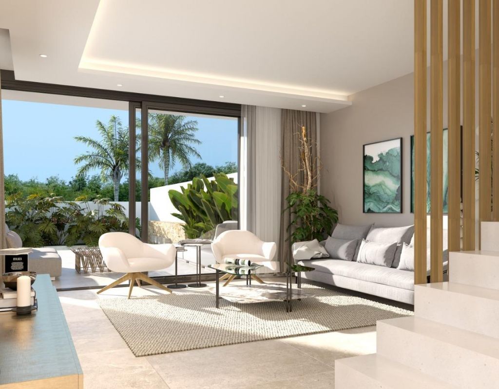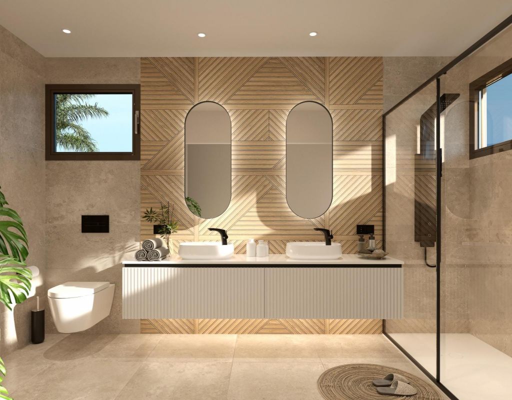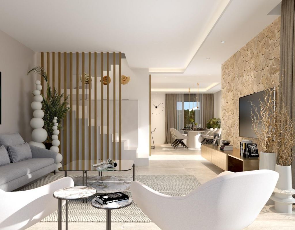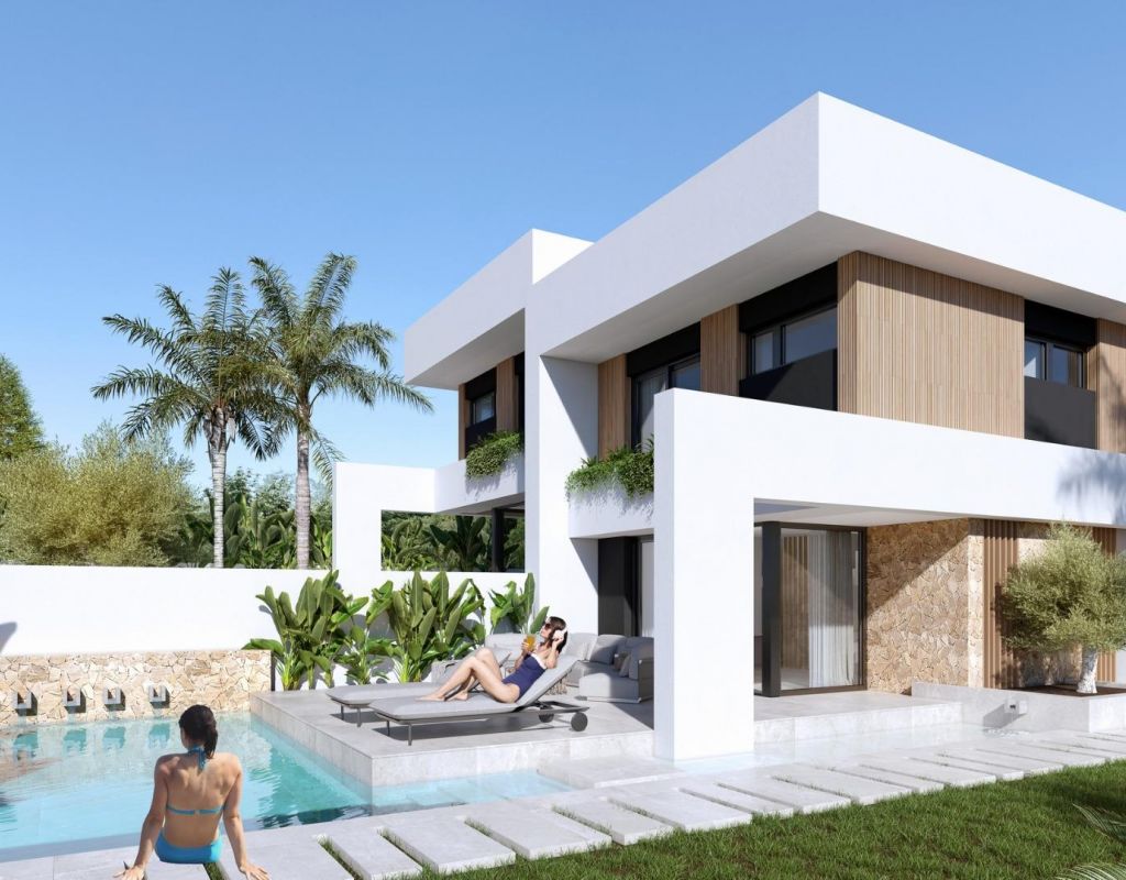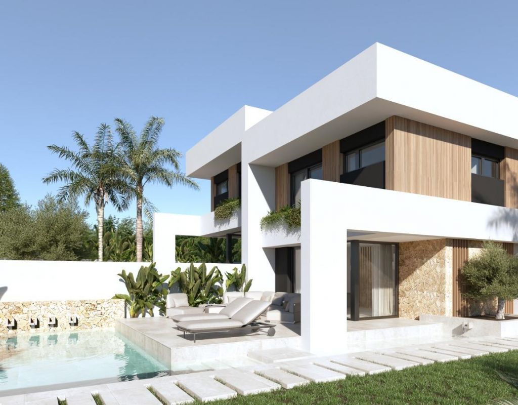 Modernas villas adosadas con piscina privada en Las Filipinas-Orihuela Costa Exclusivas villas de nueva construcción en una ubicación privilegiada de la Costa Blanca Descubra esta promoción boutique de ocho modernas villas adosadas situadas en Las Filipinas, Orihuela Costa, una de las zonas residenciales más codiciadas del sur de la Costa Blanca. Este barrio bien consolidado ofrece un excelente acceso a los servicios cotidianos, como supermercados, restaurantes, farmacias e instalaciones de ocio, todo ello a poca distancia. Con una ubicación ideal entre algunos de los mejores campos de golf de la zona, como Villamartin Golf, Campoamor Golf, Las Ramblas Golf y Las Colinas Golf, estas villas ofrecen un estilo de vida excepcional para los amantes del golf y los compradores internacionales. Las hermosas playas de Orihuela Costa se encuentran a solo 6 km, lo que convierte a esta zona en un lugar ideal tanto para residencias permanentes como para casas de vacaciones. Diseño contemporáneo con distribuciones amplias Cada villa está construida en una parcela privada de aproximadamente 300 m² y ofrece unos 140 m² de superficie habitable moderna distribuida en dos plantas. Las propiedades cuentan con tres dormitorios dobles, dos cuartos de baño completos con lavabos dobles, incluido uno en suite, y un aseo adicional para invitados. La planta baja cuenta con una luminosa y elegante sala de estar con una pared decorativa acabada en piedra natural, lo que crea un ambiente cálido y elegante. Los grandes ventanales dan acceso directo a la terraza exterior y a la piscina privada, que incluye elementos decorativos de agua. En la parte trasera de la propiedad, una cocina italiana de diseño con isla central e iluminación LED se abre a un amplio comedor con acceso al jardín y a la zona de aparcamiento privado. Elegantes dormitorios y vida al aire libre La primera planta incluye dos dormitorios de invitados con armarios empotrados y un cuarto de baño familiar. El dormitorio principal destaca por su sofisticado diseño, con un cabecero de roble que va del suelo al techo, detalles en espejo y un lujoso cuarto de baño en suite, además de vistas a la zona de la piscina. También existe la opción de añadir un solárium en la azotea o un semisótano, lo que ofrece espacio adicional y posibilidades de personalización. Características de alta calidad y comodidad moderna Estas villas están construidas con materiales de alta calidad y la última tecnología para garantizar la comodidad y la eficiencia. Las características incluyen preinstalación para aire acondicionado por conductos, sistema aerotérmico para agua caliente, calefacción por suelo radiante en los baños y persianas eléctricas. Otras especificaciones incluyen un sistema de alarma, videoportero y puerta de acceso automatizada para vehículos, lo que garantiza tanto la comodidad como la seguridad. Ubicación privilegiada cerca de playas y campos de golf Las Filipinas ofrece una ubicación estratégica con excelentes conexiones. Las playas de Orihuela Costa se encuentran a unos 6 km, mientras que el Aeropuerto Internacional de Murcia está a 50 km y el de Alicante a 55 km. Varios campos de golf de primer nivel se encuentran en un radio de entre 2 y 5 km. Oportunidad de inversión ideal en la Costa Blanca Estas modernas villas ofrecen una combinación perfecta de diseño, ubicación y estilo de vida, lo que las convierte en una excelente inversión o segunda residencia en la Costa Blanca. Póngase en contacto con nosotros hoy mismo para obtener más información o concertar una visita y asegurarse su nueva villa en Orihuela Costa.