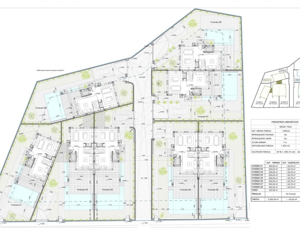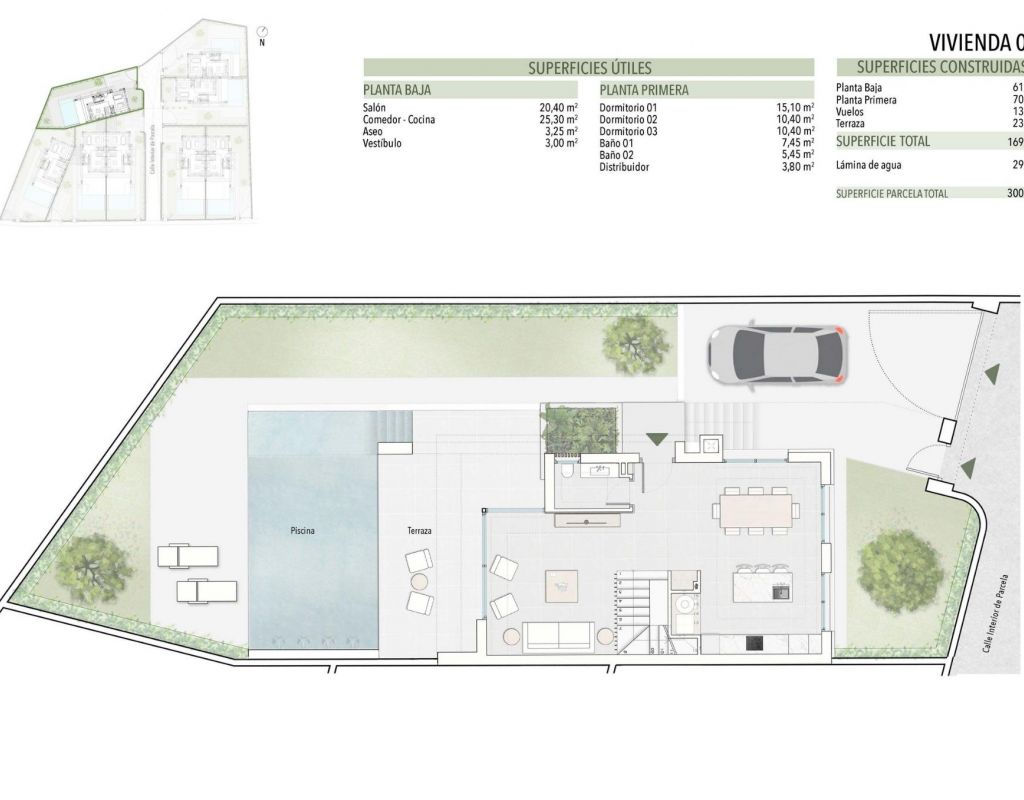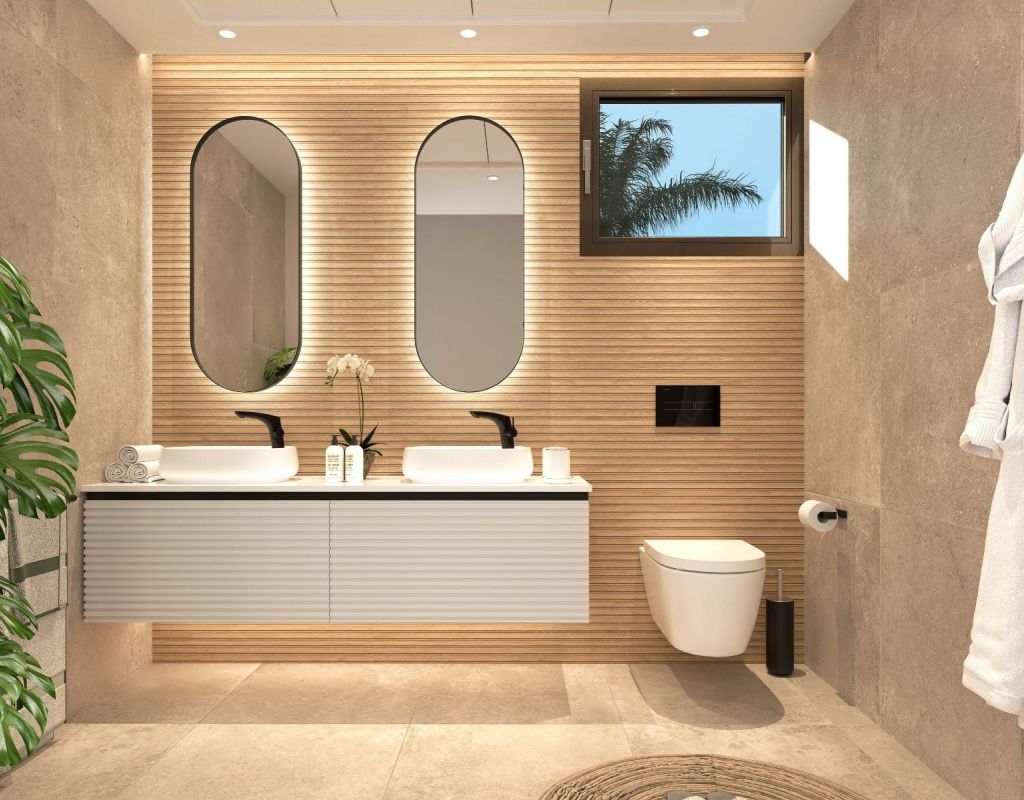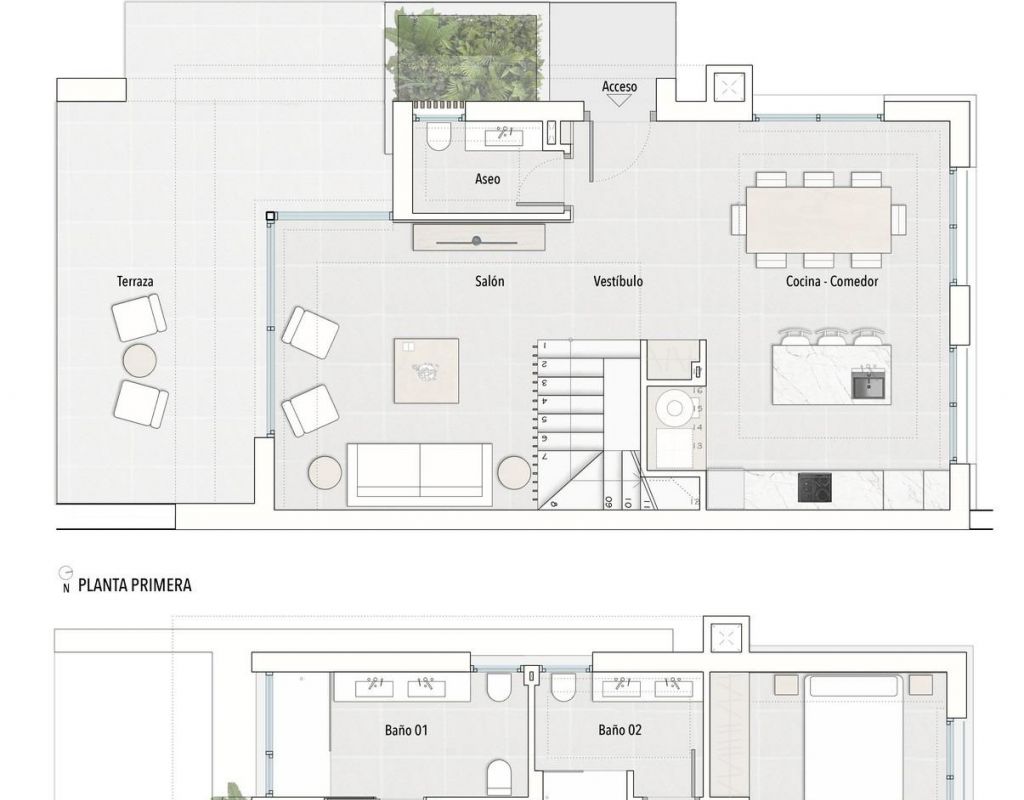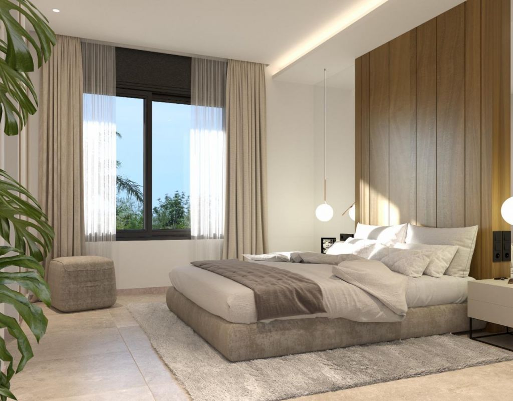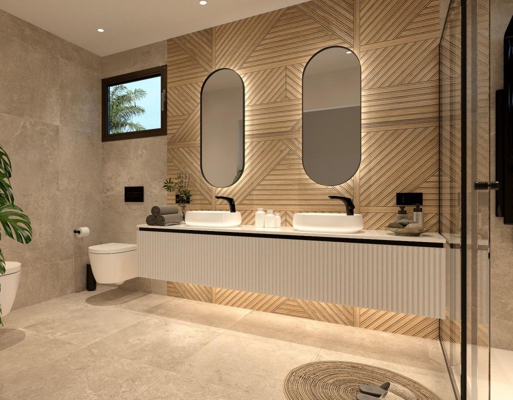 Modernas villas adosadas con piscina privada en Las Filipinas-Orihuela Costa Exclusivas villas de nueva construcción en una ubicación privilegiada de la Costa Blanca Descubra esta promoción boutique de ocho modernas villas adosadas situadas en Las Filipinas, Orihuela Costa, una de las zonas residenciales más codiciadas del sur de la Costa Blanca. Este barrio bien consolidado ofrece un excelente acceso a los servicios cotidianos, como supermercados, restaurantes, farmacias e instalaciones de ocio, todo ello a poca distancia. Con una ubicación ideal entre algunos de los mejores campos de golf de la zona, como Villamartin Golf, Campoamor Golf, Las Ramblas Golf y Las Colinas Golf, estas villas ofrecen un estilo de vida excepcional para los amantes del golf y los compradores internacionales. Las hermosas playas de Orihuela Costa se encuentran a solo 6 km, lo que convierte a esta zona en un lugar ideal tanto para residencias permanentes como para casas de vacaciones. Diseño contemporáneo con distribuciones amplias Cada villa está construida en una parcela privada de aproximadamente 300 m² y ofrece unos 140 m² de superficie habitable moderna distribuida en dos plantas. Las propiedades cuentan con tres dormitorios dobles, dos cuartos de baño completos con lavabos dobles, incluido uno en suite, y un aseo adicional para invitados. La planta baja cuenta con una luminosa y elegante sala de estar con una pared decorativa acabada en piedra natural, lo que crea un ambiente cálido y elegante. Los grandes ventanales dan acceso directo a la terraza exterior y a la piscina privada, que incluye elementos decorativos de agua. En la parte trasera de la propiedad, una cocina italiana de diseño con isla central e iluminación LED se abre a un amplio comedor con acceso al jardín y a la zona de aparcamiento privado. Elegantes dormitorios y vida al aire libre La primera planta incluye dos dormitorios de invitados con armarios empotrados y un cuarto de baño familiar. El dormitorio principal destaca por su sofisticado diseño, con un cabecero de roble que va del suelo al techo, detalles en espejo y un lujoso cuarto de baño en suite, además de vistas a la zona de la piscina. También existe la opción de añadir un solárium en la azotea o un semisótano, lo que ofrece espacio adicional y posibilidades de personalización. Características de alta calidad y comodidad moderna Estas villas están construidas con materiales de alta calidad y la última tecnología para garantizar la comodidad y la eficiencia. Las características incluyen preinstalación para aire acondicionado por conductos, sistema aerotérmico para agua caliente, calefacción por suelo radiante en los baños y persianas eléctricas. Otras especificaciones incluyen un sistema de alarma, videoportero y puerta de acceso automatizada para vehículos, lo que garantiza tanto la comodidad como la seguridad. Ubicación privilegiada cerca de playas y campos de golf Las Filipinas ofrece una ubicación estratégica con excelentes conexiones. Las playas de Orihuela Costa se encuentran a unos 6 km, mientras que el Aeropuerto Internacional de Murcia está a 50 km y el de Alicante a 55 km. Varios campos de golf de primer nivel se encuentran en un radio de entre 2 y 5 km. Oportunidad de inversión ideal en la Costa Blanca Estas modernas villas ofrecen una combinación perfecta de diseño, ubicación y estilo de vida, lo que las convierte en una excelente inversión o segunda residencia en la Costa Blanca. Póngase en contacto con nosotros hoy mismo para obtener más información o concertar una visita y asegurarse su nueva villa en Orihuela Costa.