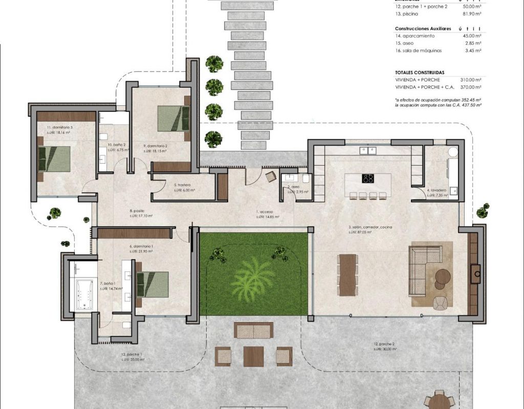Villas de nueva construcción a medida en Pinoso (Alicante): amplias viviendas en un entorno natural Villas de nueva construcción adaptadas a su estilo de vida en Pinoso Descubra una oportunidad única para construir la casa de sus sueños en el tranquilo entorno de Pinoso, situado en el interior de Alicante, en la Costa Blanca. Estas modernas villas independientes están diseñadas bajo un concepto de autoconstrucción, lo que permite a los compradores elegir entre diferentes modelos, distribuciones y parcelas para crear una vivienda totalmente personalizada. Pinoso es un encantador pueblo español conocido por sus viñedos, su cultura tradicional y su estilo de vida relajado. La zona ofrece un equilibrio perfecto entre la naturaleza y las comodidades cotidianas, con tiendas locales, restaurantes y servicios disponibles en las inmediaciones. Es un destino ideal para quienes buscan tranquilidad sin perder el contacto con las ciudades más grandes y la costa. Diseños flexibles de villas con arquitectura moderna Los compradores pueden elegir entre una variedad de modelos de villas que ofrecen 2 o 3 dormitorios y 2 o 3 baños, con opciones de distribuciones de una o dos plantas. Las superficies construidas oscilan entre aproximadamente 100 m² y 260 m², adaptándose a diferentes necesidades de estilo de vida. Cada villa se encuentra en parcelas espaciosas, especialmente en ubicaciones rústicas donde las parcelas parten de los 10 000 m², lo que proporciona privacidad y vistas despejadas al campo circundante. Características de alta calidad y vida energéticamente eficiente Todas las villas están construidas con materiales de alta calidad e incluyen una piscina privada de 8 por 4 metros, cocina totalmente equipada con electrodomésticos y un completo sistema de aire acondicionado con tecnología Airzone. Las viviendas también cuentan con sistemas aerotérmicos para el agua caliente, baños totalmente equipados con espejos y mamparas de ducha, y una calificación energética A para una máxima eficiencia. En el caso de las parcelas rústicas, las propiedades incluyen 24 paneles solares fotovoltaicos, sistemas de purificación de agua cuando sea necesario y soluciones sostenibles para las aguas residuales. Las parcelas urbanas se benefician de la conexión a la red de agua y al alcantarillado. Las zonas exteriores están cuidadosamente acabadas con terrazas pavimentadas, zonas de piscina y un camino perimetral, mientras que las parcelas incluyen 3.000 m² de vallado, acceso para vehículos motorizados y un entorno ajardinado. Selección personalizada de parcelas y proceso de autoconstrucción Hay varias parcelas disponibles en diferentes ubicaciones alrededor de Pinoso, cada una con su propio precio (para este anuncio, se ha considerado una parcela con un coste de 55.000 euros; si se elige una parcela con un precio diferente, el precio final se recalculará en consecuencia). La construcción se lleva a cabo mediante un sistema de autoconstrucción, en el que los pagos se realizan por etapas a medida que avanza el proyecto. El plazo de entrega estimado es de aproximadamente 10 meses a partir de la concesión de la licencia de obras. Excelente ubicación con buenas conexiones Pinoso ofrece una ubicación estratégica en el interior con fácil acceso a destinos clave. El aeropuerto de Alicante está a unos 60 km, mientras que a las playas de la Costa Blanca se llega en unos 65 km. Hay campos de golf en un radio de entre 40 y 50 km, y las ciudades de Elche y Alicante se encuentran a una cómoda distancia en coche. Ideal como inversión o residencia permanente Estas villas construidas a medida ofrecen una excelente oportunidad para crear un hogar a medida en un entorno tranquilo y natural, con comodidades modernas y un gran potencial de inversión. Póngase en contacto con nosotros hoy mismo para obtener más información y empezar a diseñar su nueva villa en Pinoso.