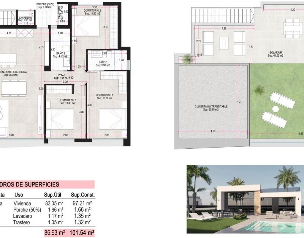 NIEUWBOUW VILLA'S IN CONDADO DE ALHAMA GOLFBAAN Nieuwbouw villacomplex in Condado de Alhama Golf Resort. Villa's met 3 slaapkamers, 2 badkamers, open keuken met woonkamer, inbouwkasten, terras, privésolarium en parkeerplaats in de tuin. Alle villa's hebben een privézwembad van 21 m2. Inbegrepen in de prijs: - toegewezen parkeerplaats in de privétuin. - SOLARIUM met buitentrap. - BADKAMERS: de doucheschermen, wastafels, spiegels en de LED-verlichting in het verlaagde plafond. - KEUKEN: de afzuigkap, de LED-verlichting in het plafond. - Vooraf geïnstalleerde airconditioning. - BUILT-IN CABINETS zijn bekleed. - ELEKTRISCHE ROLLUIKEN. - AEROTHERMIA systeem. - WATERZUIVER installatie. - oplaadpunt voor elektrische en hybride voertuigen. - PRIVÉ ZWEMBAD. Gelegen in het besloten privé golfresort van Condado de Alhama, tussen Alhama de Murcia en Mazarrón. Condado de Alhama Golf Resort is een fantastisch Golf Resort met vele faciliteiten en diensten . Een winkelcentrum, een sportcentrum, een verscheidenheid aan bars en restaurants, supermarkten en meer dan 25 gemeenschappelijke zwembaden en tuinen. Condado de Alhama Golf Resort heeft zijn eigen Jack Nicklaus ontworpen golfbaan en ligt op slechts 15 minuten van de prachtige stranden van Bolnuevo en Mazarron. Mazarron heeft meer dan 35 km kustlijn, waarvan een groot deel ongerept is. Talrijke stranden in de baai van Mazarron zijn bekroond met de Blauwe Vlag voor hun kwaliteit. Condado de Alhama Golf Resort ligt op slechts 20 minuten van de nieuwe internationale luchthaven van Corvera.