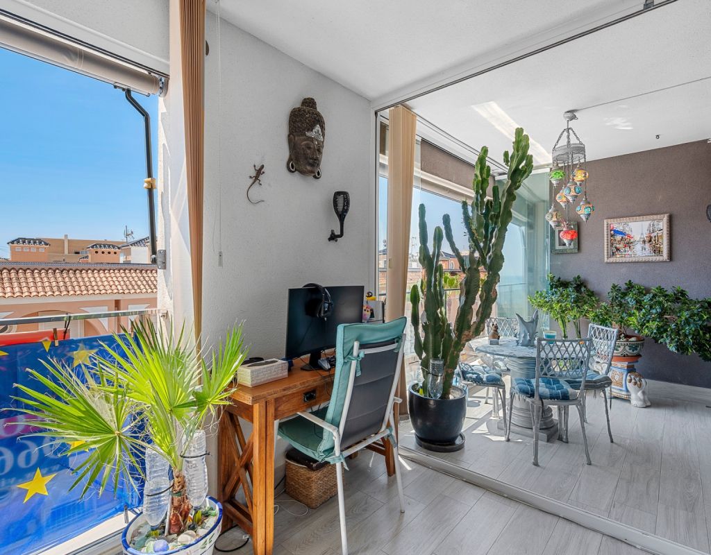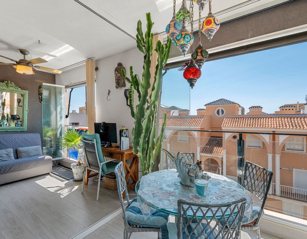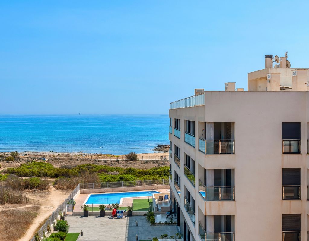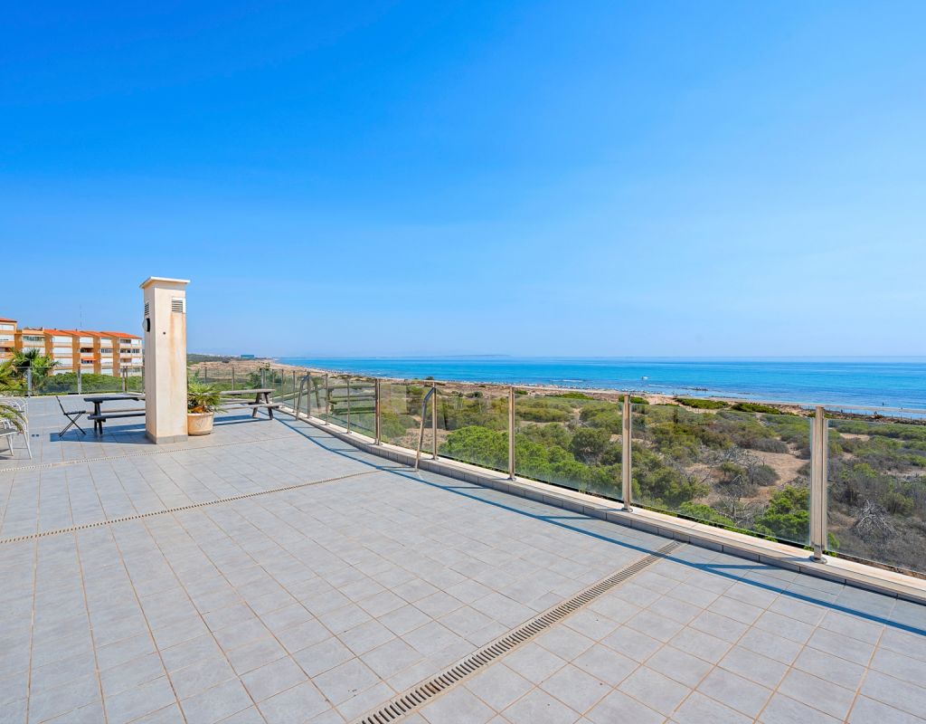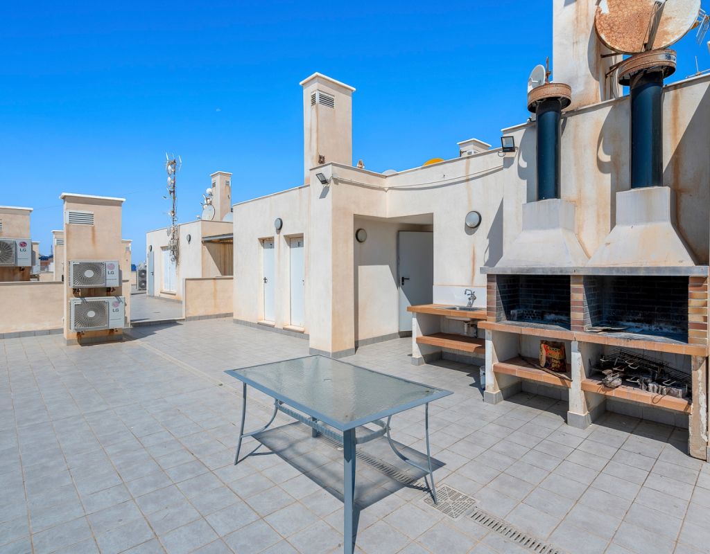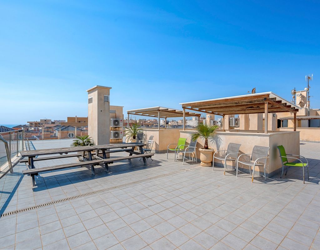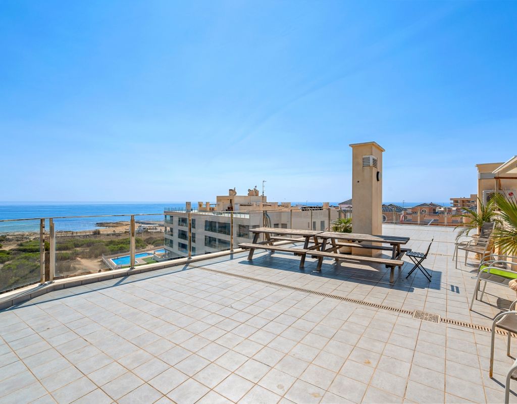 Dit penthouse met één slaapkamer en twee badkamers heeft een comfortabele en functionele indeling, ideaal als permanente woning, vakantieverblijf of investering. De lichte woonkamer heeft toegang tot een doorlopend balkon. De hoofdslaapkamer beschikt eveneens over een eigen balkon, gescheiden door een schuifbare glazen wand die indien gewenst één groot buitenterras kan vormen. De open keuken sluit aan op de eetruimte en entree. De hoofdslaapkamer heeft een en-suite badkamer en er is ook een apart gastenbadkamer. Het complex biedt twee gemeenschappelijke zwembaden en de woning beschikt over een privé garage. Gelegen in La Mata, Torrevieja, dichtbij alle voorzieningen, openbaar vervoer en de stranden van de Costa Blanca.