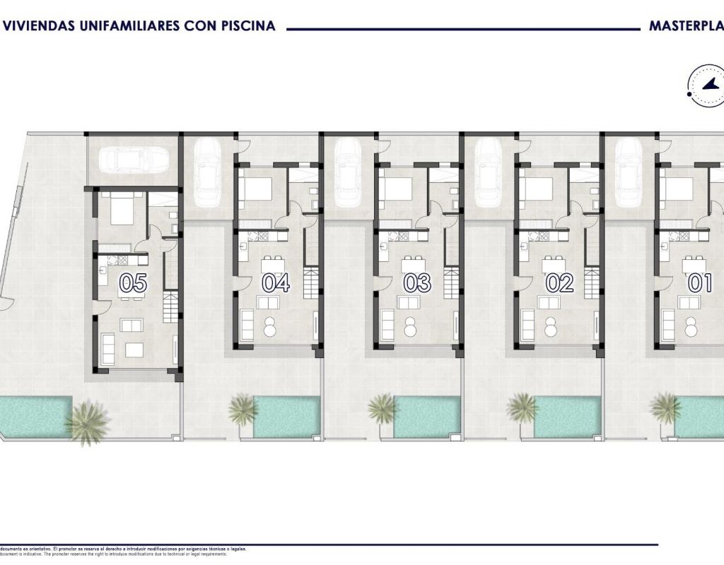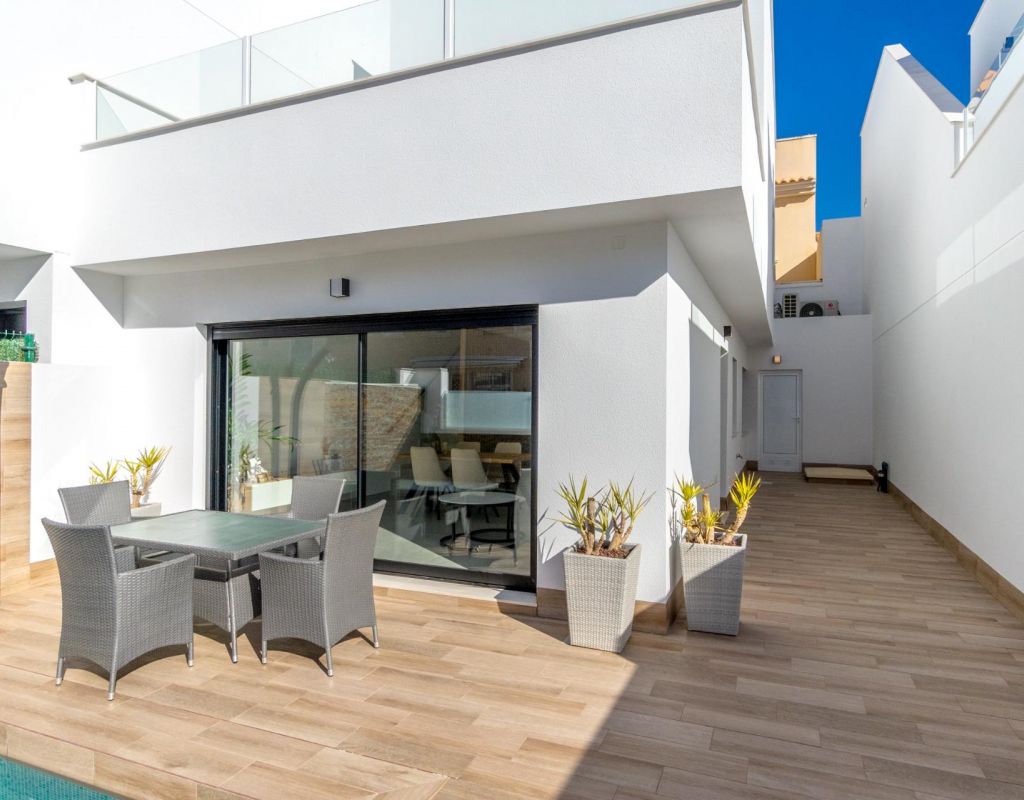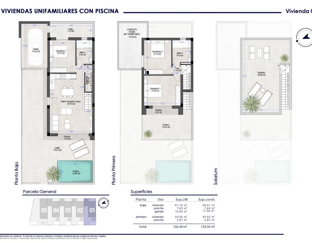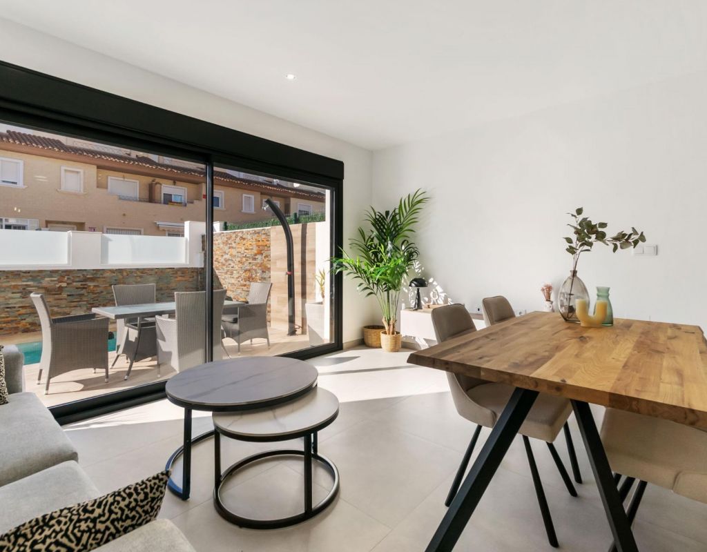 Nieuwbouwwoningen met privézwembad in San Pedro del Pinatar Moderne woningen op een toplocatie Dit exclusieve project van 5 halfvrijstaande villa's is gelegen in San Pedro del Pinatar, een levendige kustplaats aan de Costa Cálida. Deze woningen liggen vlakbij het gemeentelijk sportcentrum, op loopafstand van het stadscentrum en op slechts 3,5 km van de stranden van de Mar Menor en de Middellandse Zee. Ze bieden de perfecte combinatie van comfort, gemak en mediterrane levensstijl. Eigentijds ontwerp en functionele indeling Elke villa heeft twee verdiepingen en is ontworpen met moderne architectuur, waardoor de ruimte en het natuurlijke licht optimaal worden benut. Met 3 slaapkamers en 2 badkamers zijn deze woningen ideaal voor gezinnen, als vakantiehuis of als investering. Begane grond: open keuken die in verbinding staat met de lichte woon- en eetkamer, een slaapkamer, een badkamer, een patio aan de achterzijde en directe toegang tot de privétuin met zwembad. Eerste verdieping: twee extra slaapkamers, een badkamer en een ruim terras met toegang tot het privé-dakterras, perfect om te zonnebaden of gasten te ontvangen. Hoogwaardige afwerking en comfort De villa's worden opgeleverd met hoogwaardige specificaties en doordachte details om een modern leven te garanderen: Volledig ingerichte en uitgeruste keuken met apparatuur Privézwembad en tuin Dakterras om het hele jaar door buiten te leven Zomerkamer inbegrepen Verlichtingspakket voor binnen en buiten Gesloten privégarage San Pedro del Pinatar - Levensstijl en omgeving San Pedro del Pinatar staat bekend om zijn zon het hele jaar door, zandstranden en natuurlijke landschappen, zoals het beroemde natuurpark Salinas y Arenales. De stad biedt alle essentiële voorzieningen, waaronder winkels, supermarkten, restaurants, gezondheidscentra en sportfaciliteiten, waardoor het een uitstekende plek is om te wonen of op vakantie te gaan. Afstanden tot belangrijke bezienswaardigheden: Stranden van de Mar Menor - 3,5 km Winkelcentrum Dos Mares - 5 km Jachthaven Lo Pagán - 4 km Roda Golf - 8 km Luchthaven Murcia (Corvera) - 35 km Luchthaven Alicante € 75 km Verzeker uzelf van uw nieuwe huis aan zee Deze nieuw gebouwde halfvrijstaande villa's in San Pedro del Pinatar combineren een modern ontwerp, hoogwaardige afwerking en een bevoorrechte locatie dicht bij de zee en alle voorzieningen. Neem vandaag nog contact met ons op voor meer informatie of om een bezichtiging te plannen en zet de eerste stap naar uw droomhuis aan de Middellandse Zee.