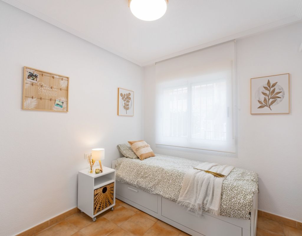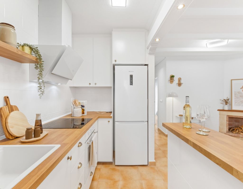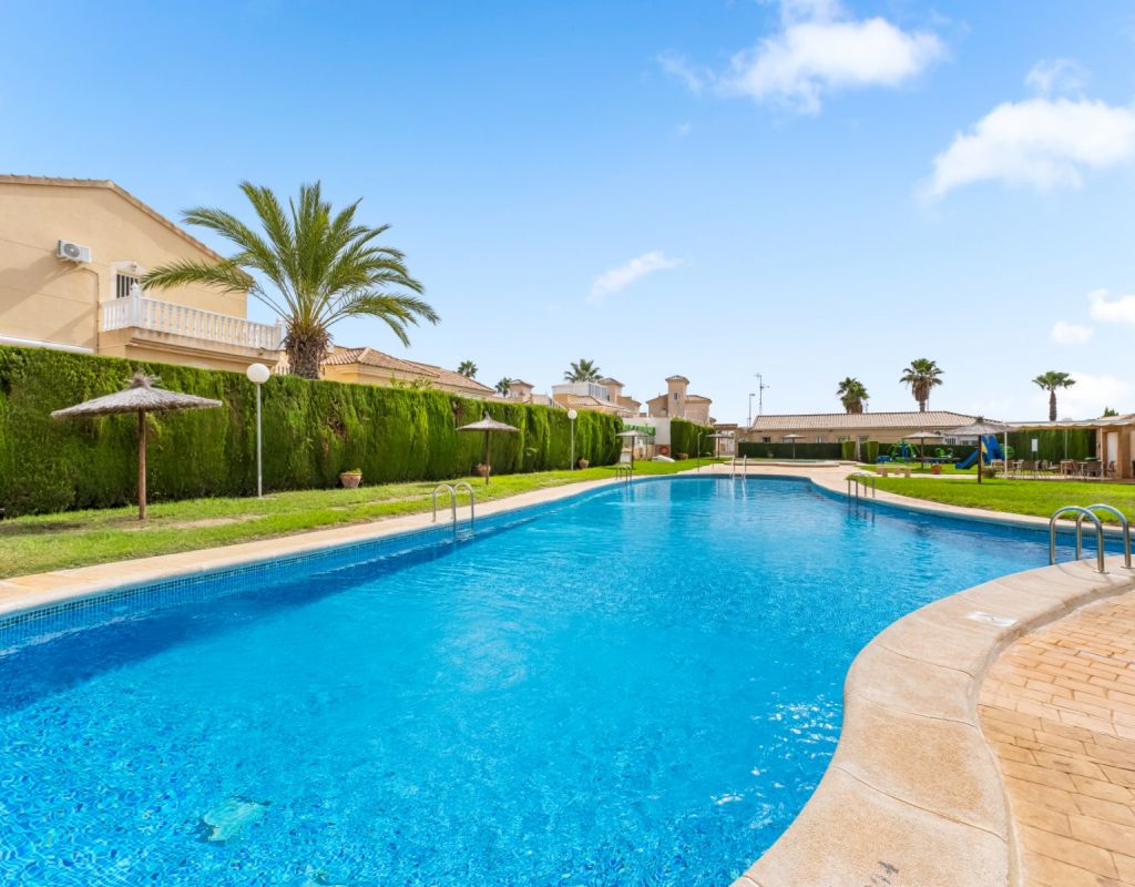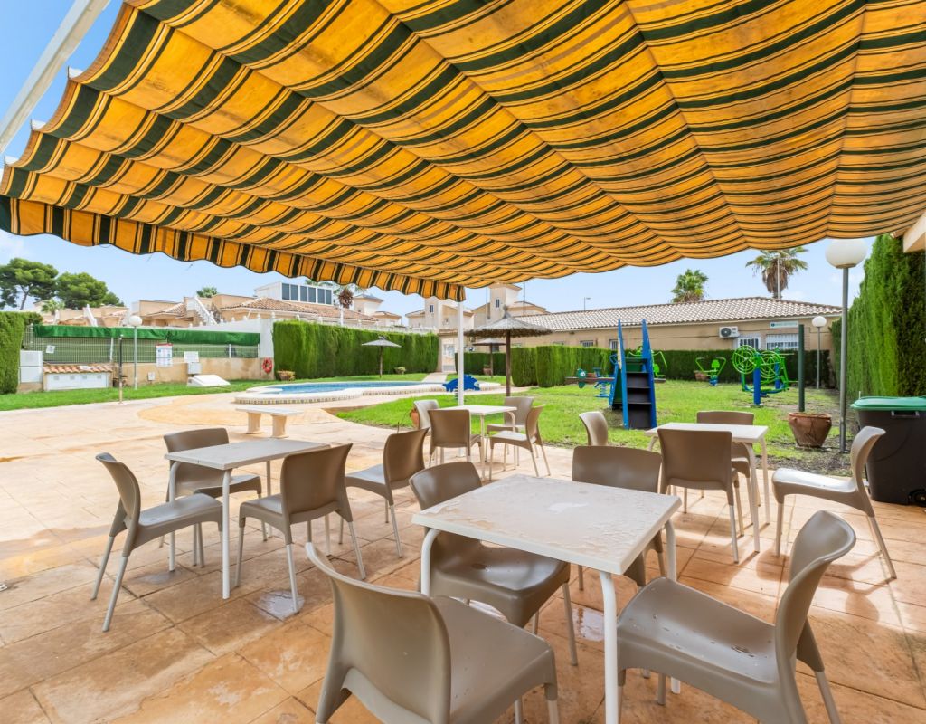 Deze gerenoveerde bungalow met twee slaapkamers en een zuidgerichte ligging in Villamartin is gelegen in een zeer gewilde wijk, op korte afstand van alle voorzieningen, waaronder cafés, restaurants en een supermarkt op slechts 2 minuten rijden. De prachtige stranden liggen op slechts 10 minuten rijden, evenals het winkelcentrum La Zenia Boulevard. Daarnaast zijn er drie fantastische golfbanen binnen 5 tot 10 minuten rijden. De woning beschikt over zowel een voor- als achtertuin, ideaal om buiten te eten en te ontspannen in de zon. Binnen vindt u een lichte en gezellige woon-/eetkamer, een open keuken met een ontbijtbar en een aangrenzende bijkeuken voor extra gemak. Beide slaapkamers zijn voorzien van inbouwkasten en er is een goed uitgeruste familiebadkamer. De woning profiteert ook van een prachtig uitzicht over de gemeenschappelijke tuinen. Een privésolarium met kunstgras biedt een heerlijke zithoek om te genieten van de zon en het mediterrane klimaat. De aantrekkelijke gemeenschap beschikt over uitstekende faciliteiten, waaronder een prachtig gemeenschappelijk zwembad met een grasveld, een speeltuin, een gemeenschappelijke bibliotheek en gemeenschappelijke toiletten. Er is ook parkeergelegenheid buiten de weg.Deze bungalow heeft een perfecte ligging aan de Costa Blanca Zuid en combineert comfort, stijl en een heerlijk ontspannen mediterrane levensstijl.