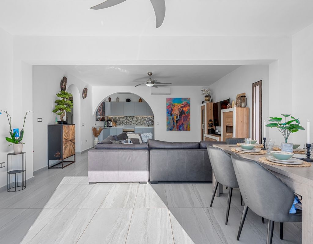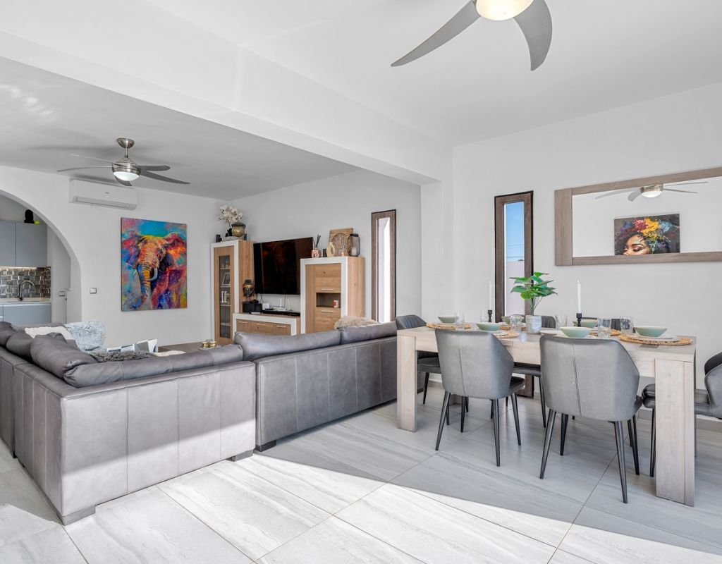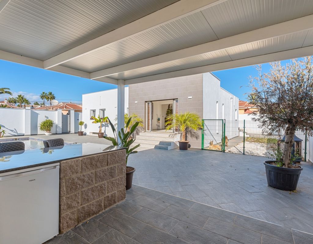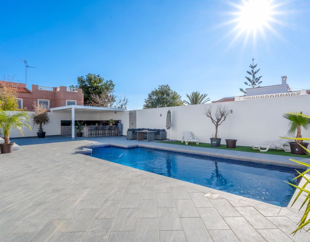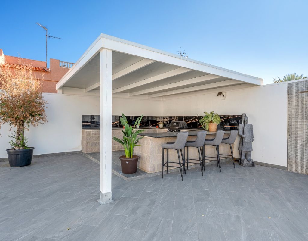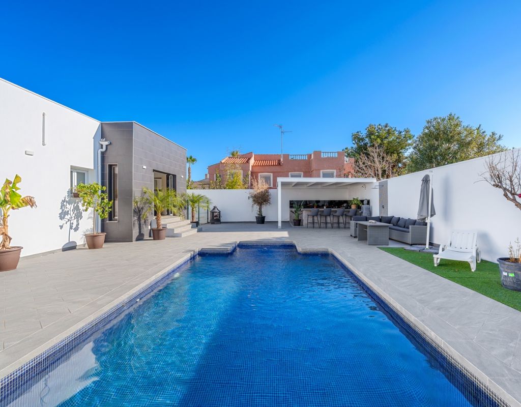 Deze prachtige vrijstaande villa is gelegen op een van de meest bevoorrechte locaties in Ciudad Quesada, vlakbij het stadscentrum, maar toch omgeven door privacy en rust. Met een perceel van 500 m² en een woonoppervlak van 134 m² is de woning verdeeld over twee verdiepingen en biedt ruimte, comfort en talloze mogelijkheden. De begane grond bestaat uit vier slaapkamers, allemaal voorzien van individuele airconditioning, twee complete badkamers, een ruime en lichte woon-/eetkamer en een functionele open keuken die naadloos aansluit op de woonkamer. De benedenverdieping beschikt over een kelder met een complete badkamer en een open ruimte, ideaal voor het creëren van een extra slaapkamer, een gastenverblijf, een recreatieruimte of een andere bestemming die de toekomstige eigenaar naar eigen wens kan aanpassen. De buitenkant is ontworpen om optimaal te profiteren van het uitstekende klimaat van de Costa Blanca dankzij een privézwembad van 8x4 meter en een volledig uitgeruste buitenkeuken, die de perfecte plek is voor maaltijden en bijeenkomsten in de buitenlucht. De zuidwestelijke ligging zorgt voor de hele dag zon en het ruime terrein rondom het huis biedt voldoende ruimte voor een tuin, ontspanningsruimtes of andere projecten die u wilt ontwikkelen. Bovendien biedt het perceel voldoende ruimte om twee auto's te parkeren, wat gemak en veiligheid garandeert. Deze unieke woning combineert een uitstekende locatie, privacy, ruimte en levenskwaliteit, waardoor het ideaal is voor wie het hele jaar door wil genieten van de mediterrane levensstijl of als een geweldige investeringsmogelijkheid in een van de meest gewilde bestemmingen aan de Costa Blanca.