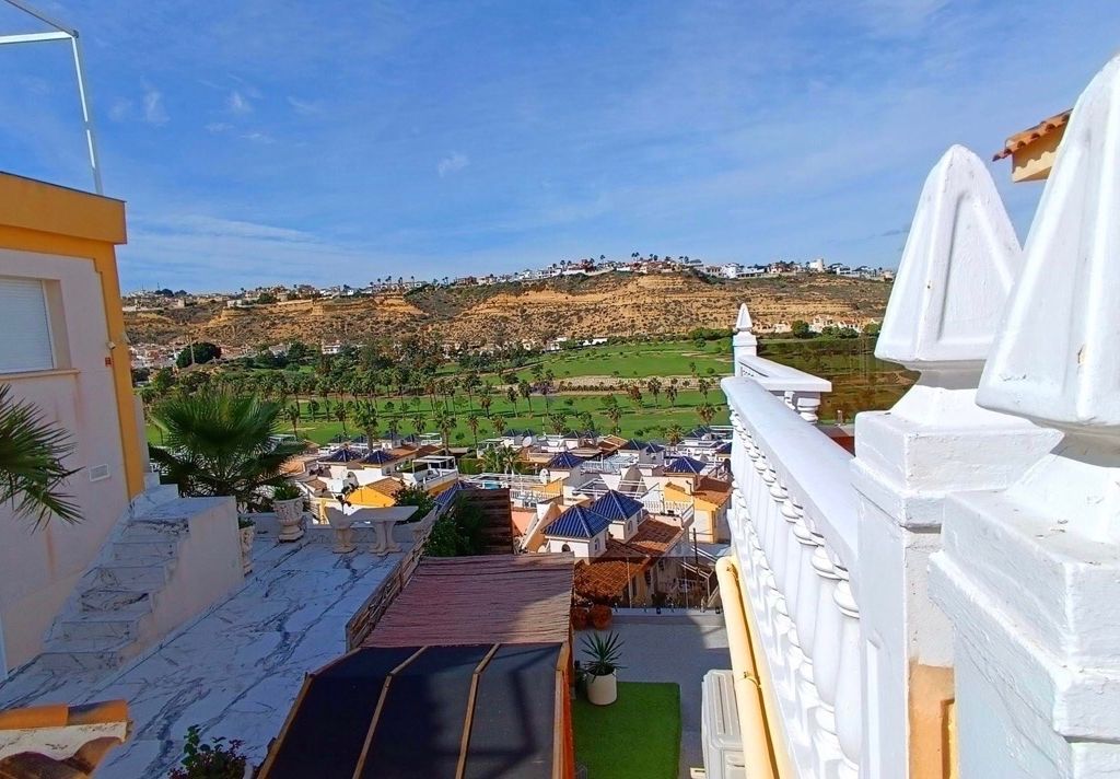 We are delighted to present this exceptional 3-Bedroom, 2-Bathroom Blue Top Villa with a separate underbuild, perfectly positioned overlooking the stunning La Marquesa Golf Course. Located just 100 metres from La Marquesa’s highly popular commercial centre, this beautifully maintained villa offers generous indoor and outdoor living space, breathtaking golf course views, and an enviable location—making it ideal as a permanent family residence, holiday retreat, or investment opportunity. The property is accessed via a private pedestrian gate, opening into a spacious south-east facing garden featuring off-road parking, a brick-built BBQ area, and low-maintenance tiled flooring throughout. This inviting outdoor space is perfect for entertaining or simply relaxing while enjoying the open views across the golf course. From the garden, there is direct access to a separate underbuild, ideal for additional storage, and further enhanced by the convenience of a toilet area. A short flight of steps leads to the main entrance, where you are welcomed into a bright and airy open-plan living and dining area. Off the lounge are two generously sized bedrooms, one benefiting from direct garden access, along with a stylish, recently re-tiled family bathroom positioned between them. Additional features include under-stair storageand a modern, fully fitted kitchen, designed for both practicality and style. The upper level hosts a spacious third bedroom, complete with its own private shower room and access to a large private terrace. From here, you can enjoy spectacular golf course views from both the front and rear of the property, creating a truly tranquil setting. The communal swimming pool is just a short stroll away and offers ample seating and sunbathing areas—perfect for relaxing or socialising. Meanwhile, a variety of bars, restaurants, and a supermarket are all within a two-minute walk, ensuring everyday convenience is right on your doorstep. With its prime location, generous living space, and beautiful surroundings, this fantastic villa represents an outstanding opportunity—whether you are seeking a full-time home or a luxurious holiday escape.