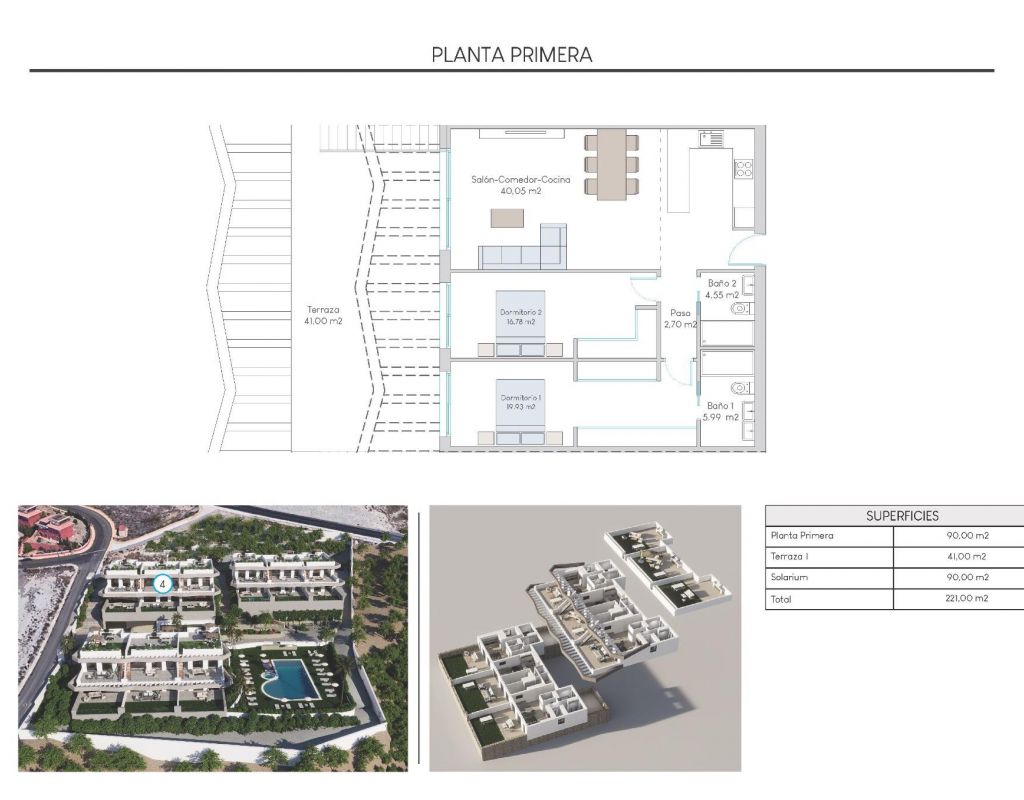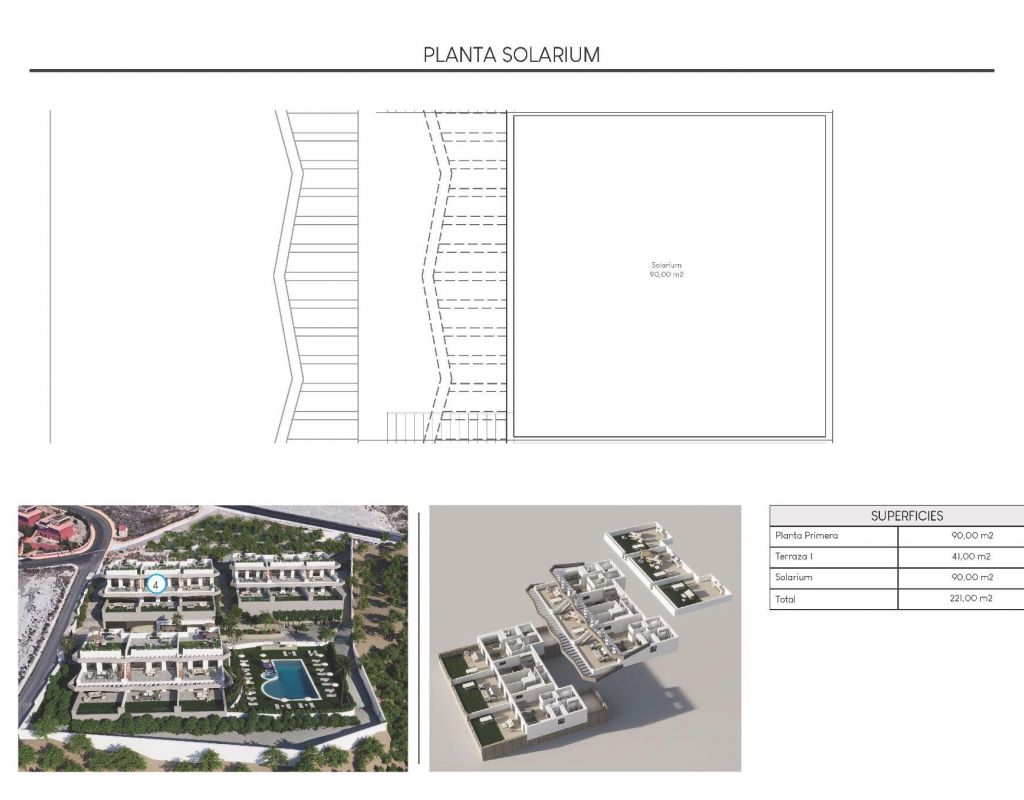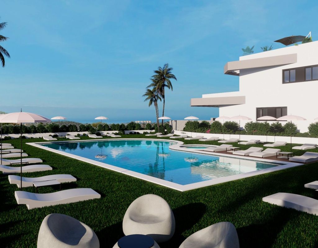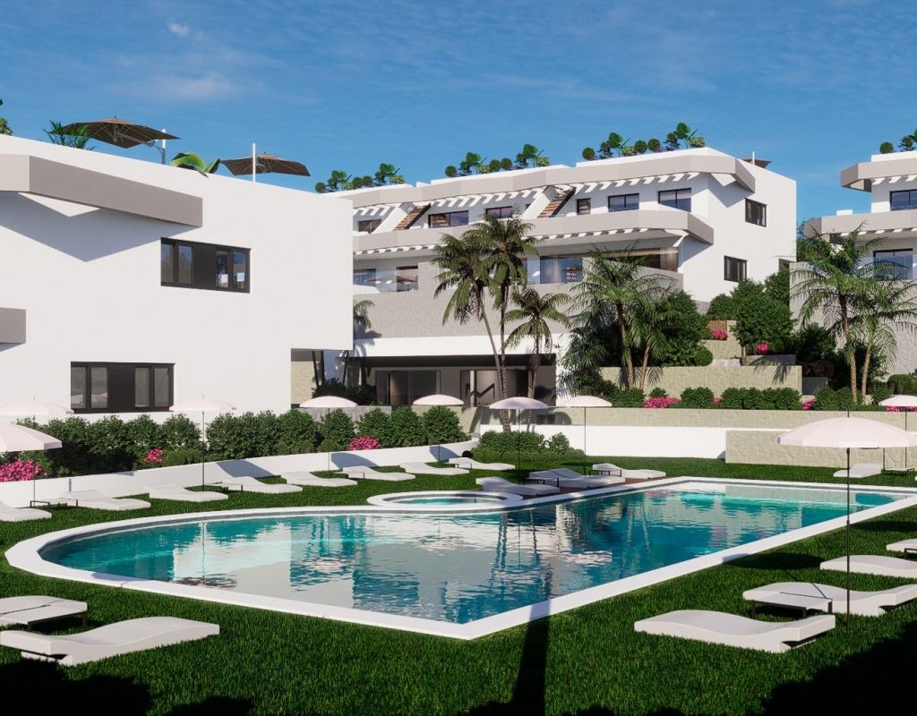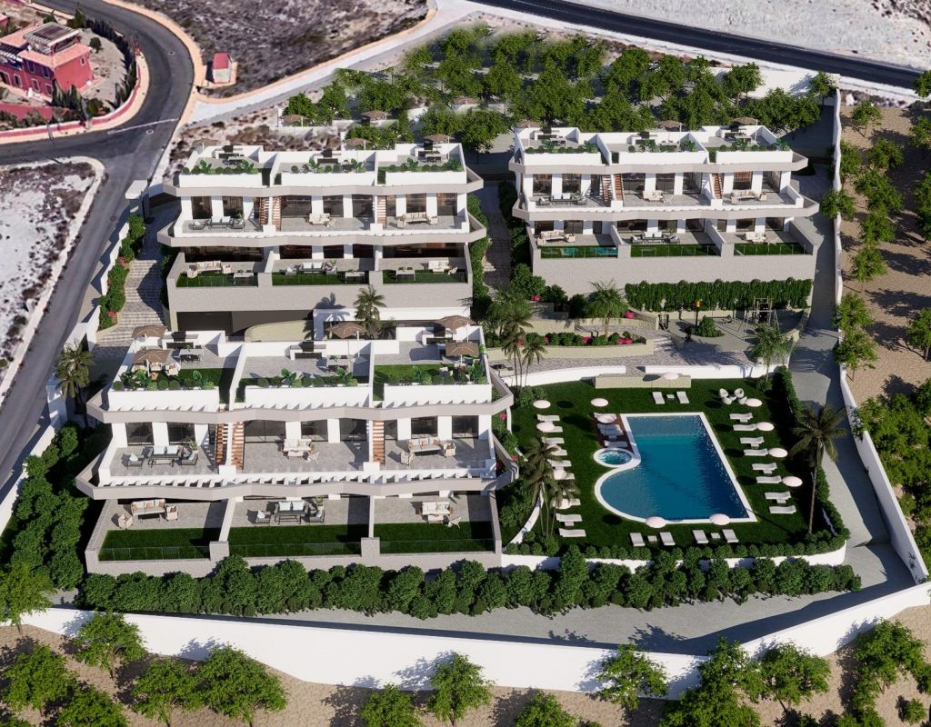 NEW BUILD RESIDENTIAL COMPLEX IN FINESTRAT New Build unique and exclusive high standing residential complex in Balcon de Finestrat. This complex of modern bungalows with 2 and 3 bedrooms, all with 2 bathrooms, open plan kitchen with the living and dining room. Top floor bungalows with private solarium and ground floor bungalows with private garden and possibility of private pool at an extra cost. Properties has loads of natural light and designer island in the kitchen. Lift in all homes. Sustainable construction with energy certificate A. Each property has private parking. Indoor Fitness Gym. Bio-healthy area for sports. Communal swimming pool. Indoor and outdoor LED lighting pack. High quality materials and brands. The properties have access to a large swimming pool and enjoy one of the best locations on the Costa Blanca. It is a great opportunity and privilege to be able to live with this environment of golf and beach, close to all amenities of all services considered one of the best places to invest. Finestrat located in the Marina Baixa region of the Costa Blanca. Benidorm is just a five-minute drive from the properties and offers all the services you would need including shops, bars, restaurants, supermarkets, banks, pharmacies and several private international schools. Close to the beaches of Levante, Poniente and Cala de Finestrat, with more than 6km in length that are among the best in Europe awarded by the European Union with Blue Flags. All leisure services such as the theme parks of Aqua Natura, Terra Mítica, Terra Natura, Aqualandia and Mundomar, Sierra Cortina and Villaitana Golf courses, hiking and climbing in Puig Campana an incomparable natural setting or enjoy of nautical sports. Distance to the sea 4 km, to the airport 26 km and to the golf 1km. Complex located 40 minutes from Alicante airport.