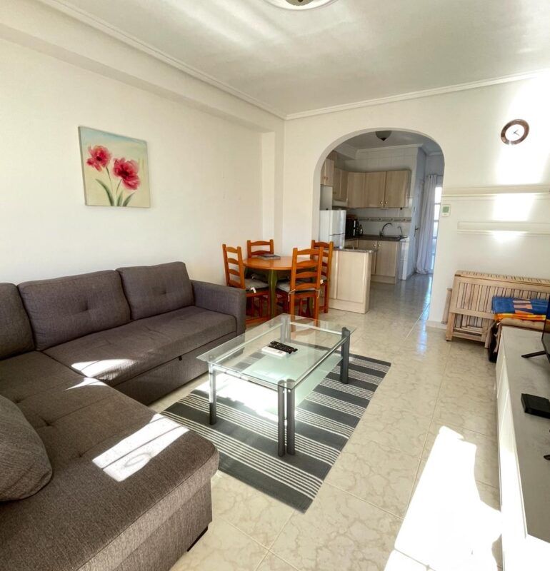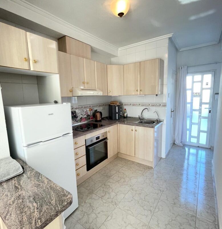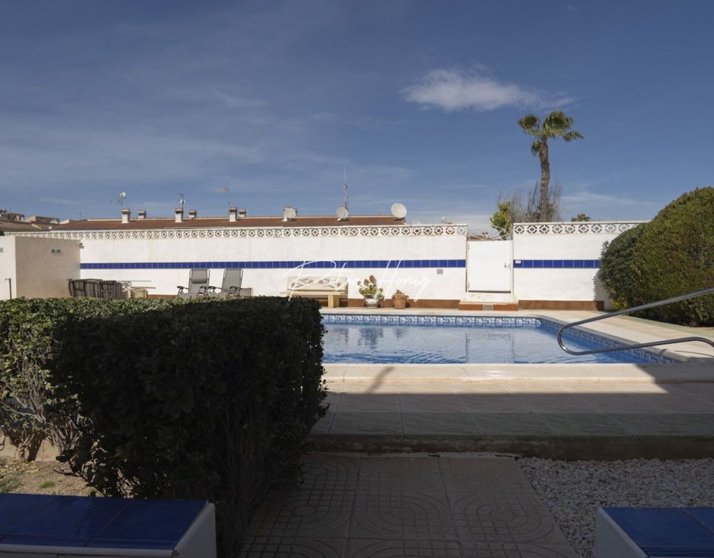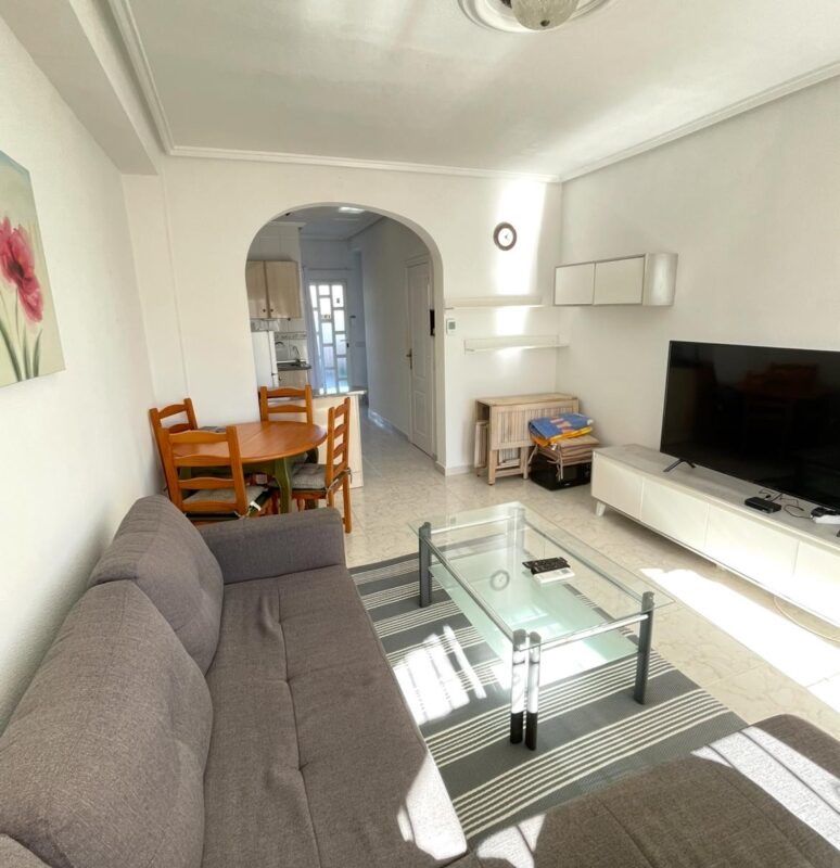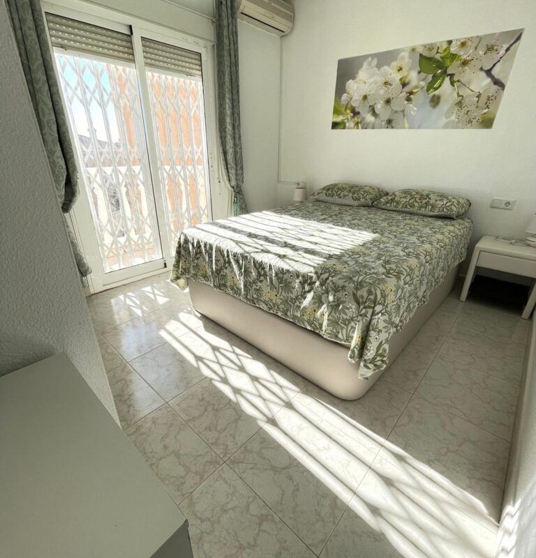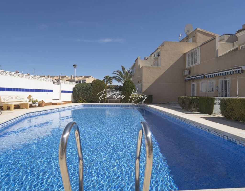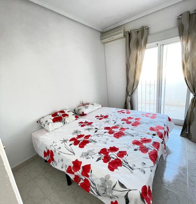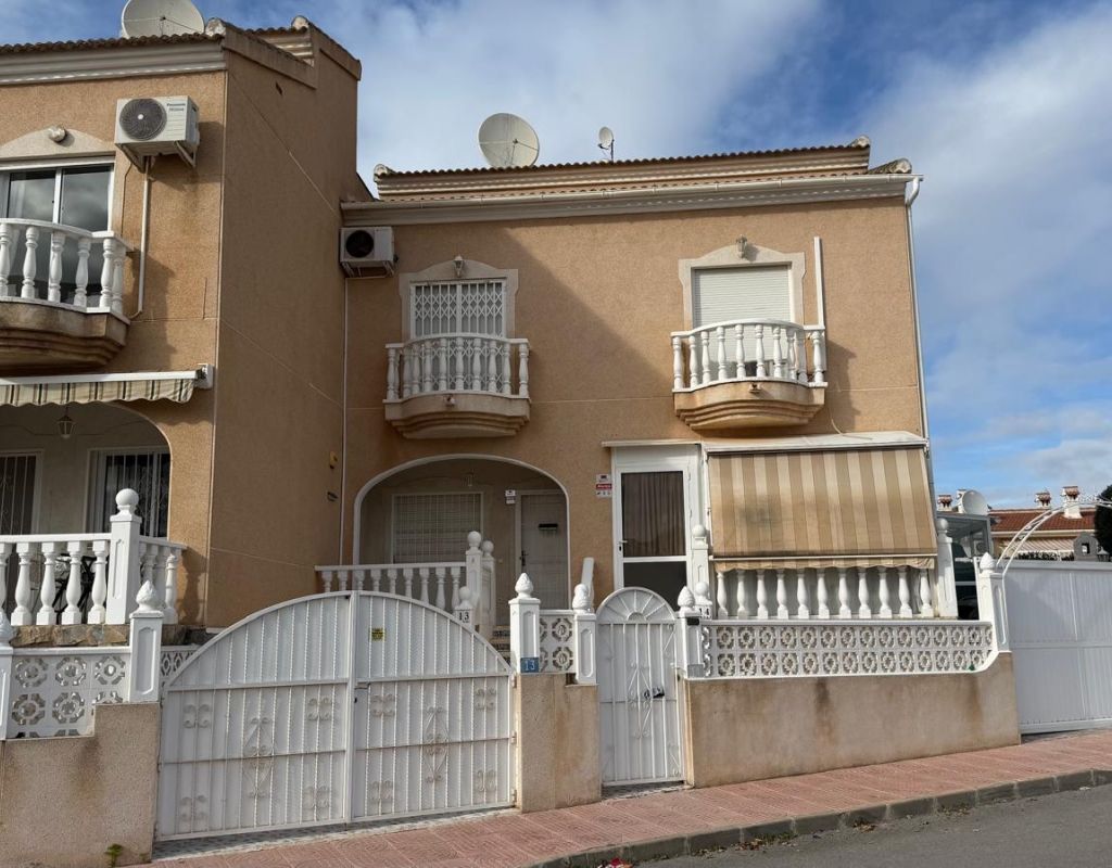 This attractive home forms part of a small, exclusive community and is just a short walk from restaurants, bars, a supermarket, and other everyday amenities. The main high street of Ciudad Quesada, offering a full range of services and facilities, is also within comfortable walking distance. The property benefits from both front and rear tiled gardens, perfectly positioned to enjoy sunshine throughout the day. The front garden provides off-road parking, while the rear garden borders the well-kept communal swimming pool and offers additional pedestrian access to the street. Inside, the ground floor features a bright and welcoming living area with direct access to a terrace—ideal for enjoying morning coffee or breakfast. There is an open-plan kitchen, a useful under-stair storage/utility cupboard, and a convenient ground-floor WC. Upstairs, the first floor offers two spacious double bedrooms, both with fitted wardrobes. The front bedroom enjoys a Juliet balcony with pleasant views towards the lakes, while the rear bedroom opens onto a private terrace with external access to the solarium. A modern family bathroom with a walk-in shower completes this level. The private solarium provides an excellent outdoor space with views over the communal pool and green areas. It also includes a large enclosed room with electricity, ideal for use as a home office, entertainment space, or additional bedroom. The stunning sandy beaches of Guardamar and La Mata, several golf courses, and Alicante Airport (approximately 30 minutes’ drive) are all easily accessible. Additional features include hot and cold air conditioning throughout, brand-new appliances, and furniture available by negotiation.