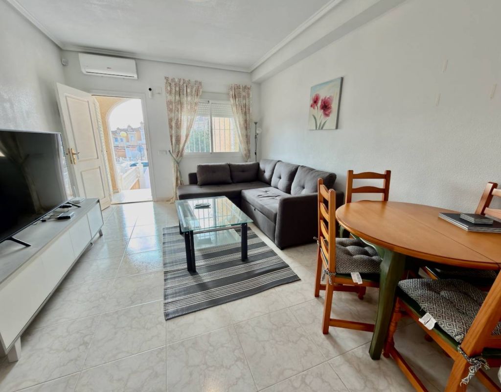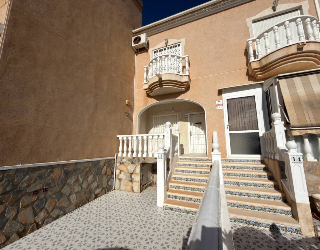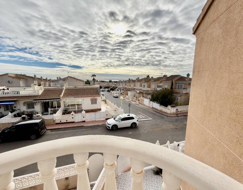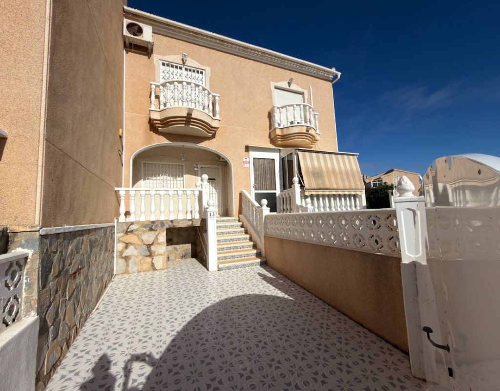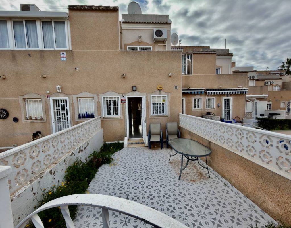 This attractive home forms part of a small, exclusive community and is just a short walk from restaurants, bars, a supermarket, and other everyday amenities. The main high street of Ciudad Quesada, offering a full range of services and facilities, is also within comfortable walking distance. The property benefits from both front and rear tiled gardens, perfectly positioned to enjoy sunshine throughout the day. The front garden provides off-road parking, while the rear garden borders the well-kept communal swimming pool and offers additional pedestrian access to the street. Inside, the ground floor features a bright and welcoming living area with direct access to a terrace—ideal for enjoying morning coffee or breakfast. There is an open-plan kitchen, a useful under-stair storage/utility cupboard, and a convenient ground-floor WC. Upstairs, the first floor offers two spacious double bedrooms, both with fitted wardrobes. The front bedroom enjoys a Juliet balcony with pleasant views towards the lakes, while the rear bedroom opens onto a private terrace with external access to the solarium. A modern family bathroom with a walk-in shower completes this level. The private solarium provides an excellent outdoor space with views over the communal pool and green areas. It also includes a large enclosed room with electricity, ideal for use as a home office, entertainment space, or additional bedroom. The stunning sandy beaches of Guardamar and La Mata, several golf courses, and Alicante Airport (approximately 30 minutes’ drive) are all easily accessible. Additional features include hot and cold air conditioning throughout, brand-new appliances, and furniture available by negotiation.