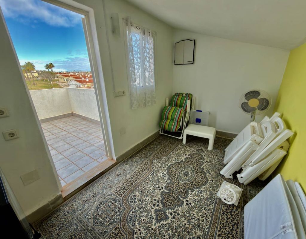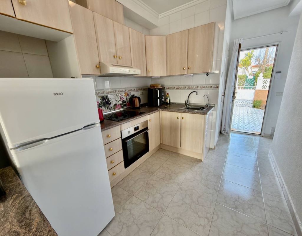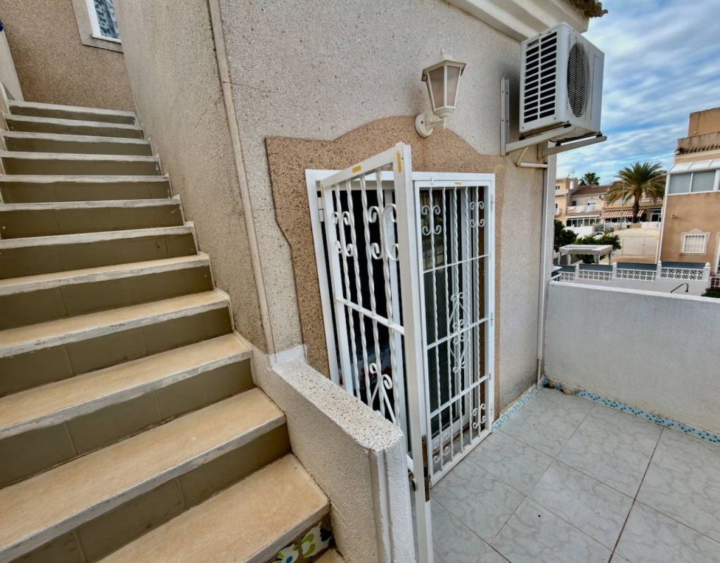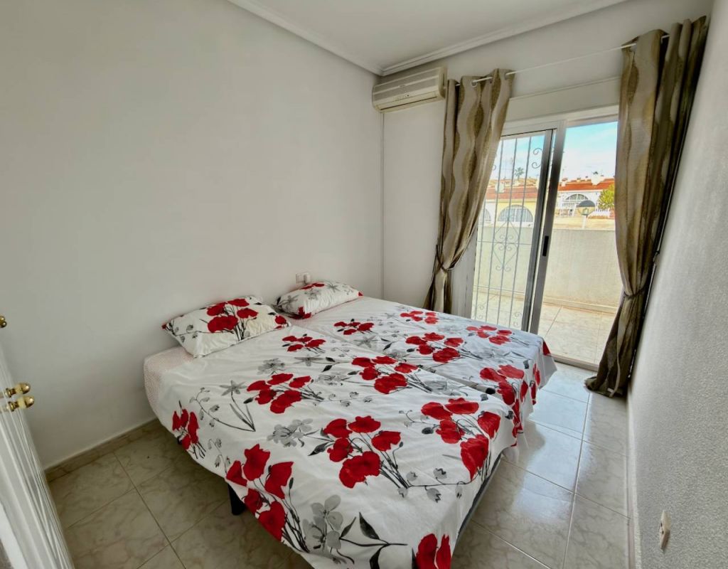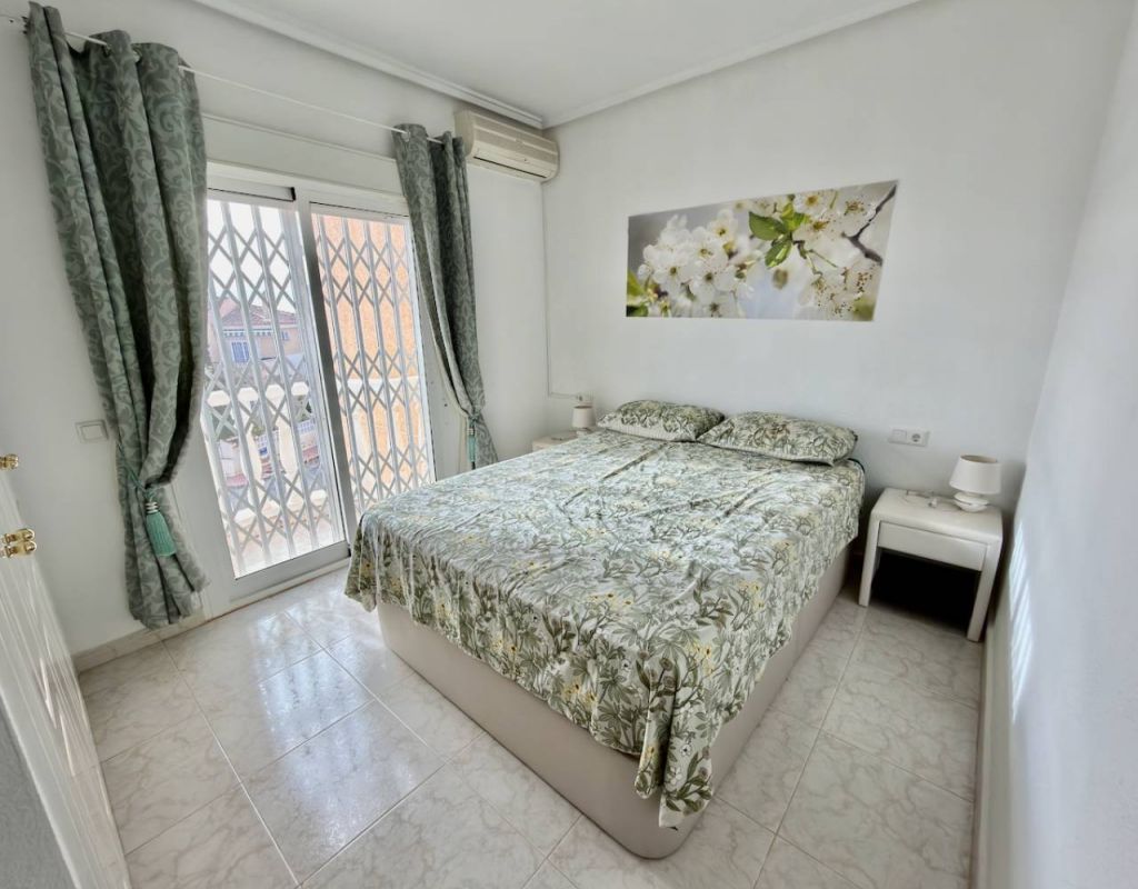 This attractive home forms part of a small, exclusive community and is just a short walk from restaurants, bars, a supermarket, and other everyday amenities. The main high street of Ciudad Quesada, offering a full range of services and facilities, is also within comfortable walking distance. The property benefits from both front and rear tiled gardens, perfectly positioned to enjoy sunshine throughout the day. The front garden provides off-road parking, while the rear garden borders the well-kept communal swimming pool and offers additional pedestrian access to the street. Inside, the ground floor features a bright and welcoming living area with direct access to a terrace—ideal for enjoying morning coffee or breakfast. There is an open-plan kitchen, a useful under-stair storage/utility cupboard, and a convenient ground-floor WC. Upstairs, the first floor offers two spacious double bedrooms, both with fitted wardrobes. The front bedroom enjoys a Juliet balcony with pleasant views towards the lakes, while the rear bedroom opens onto a private terrace with external access to the solarium. A modern family bathroom with a walk-in shower completes this level. The private solarium provides an excellent outdoor space with views over the communal pool and green areas. It also includes a large enclosed room with electricity, ideal for use as a home office, entertainment space, or additional bedroom. The stunning sandy beaches of Guardamar and La Mata, several golf courses, and Alicante Airport (approximately 30 minutes’ drive) are all easily accessible. Additional features include hot and cold air conditioning throughout, brand-new appliances, and furniture available by negotiation.