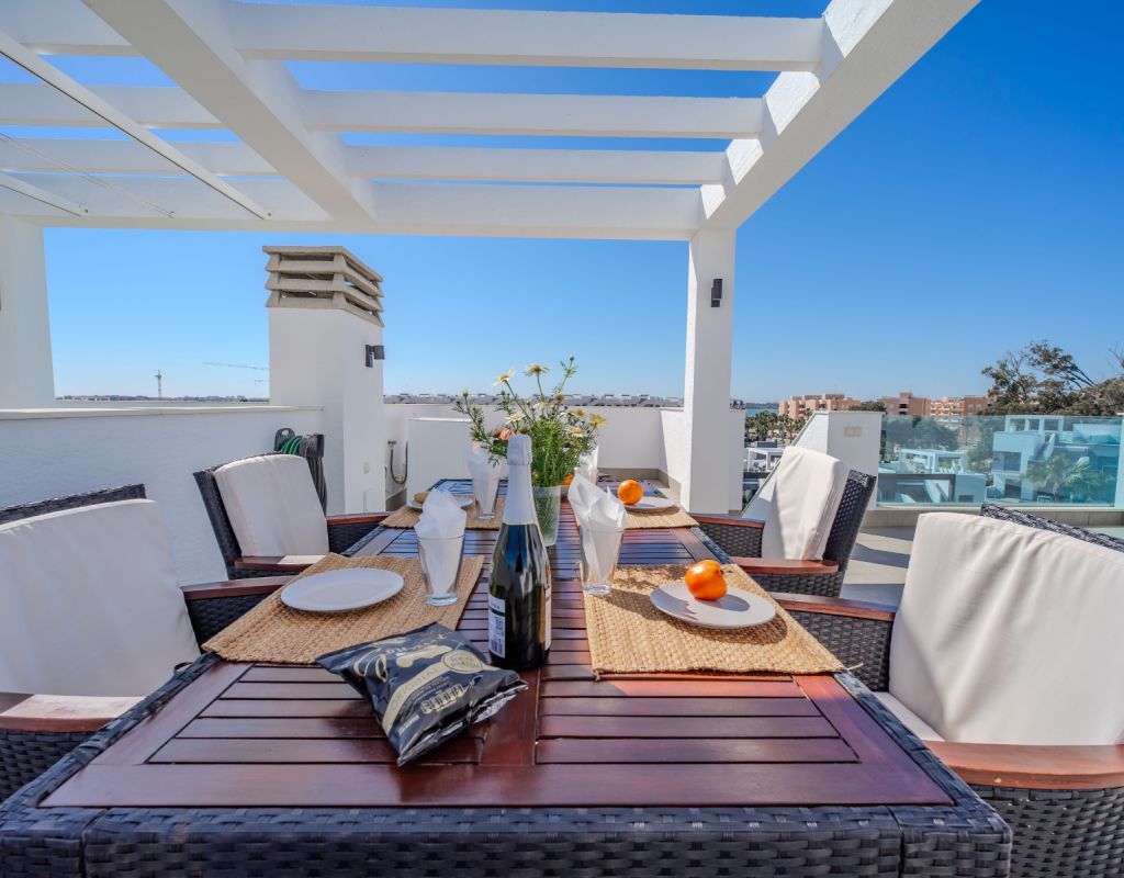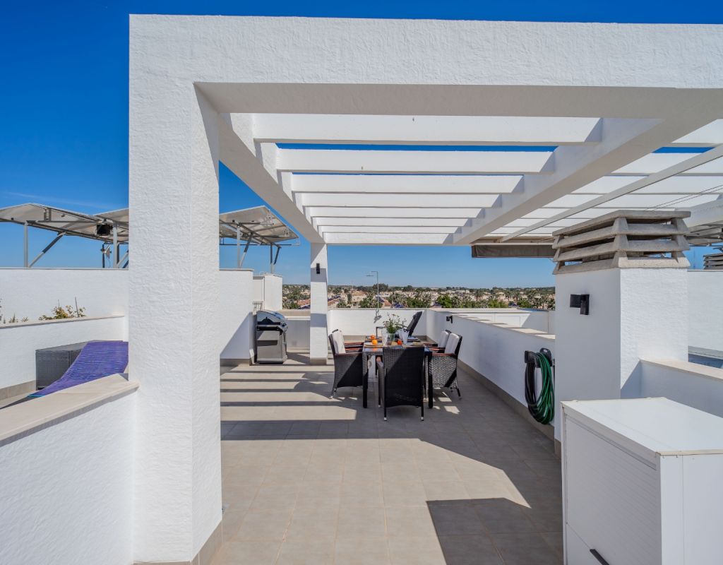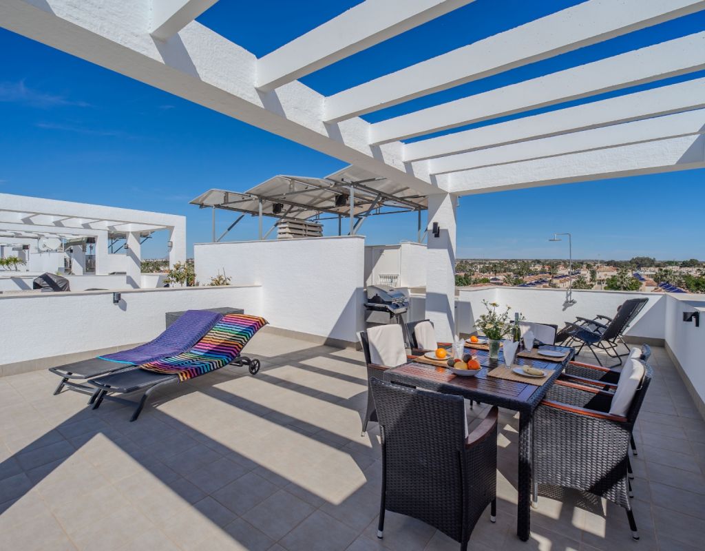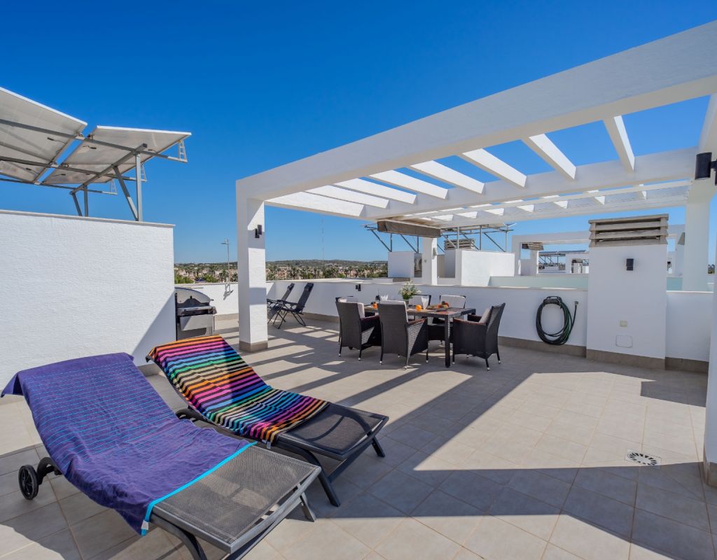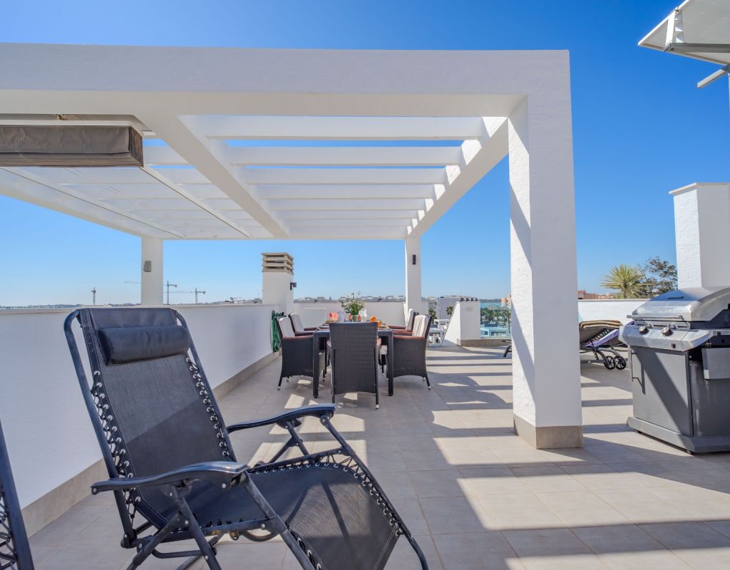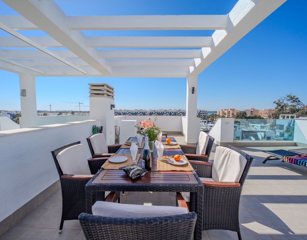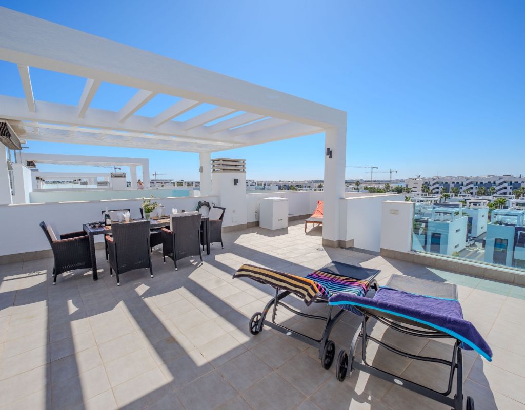 Stunning South-Facing 2-Bedroom Penthouse with Private Solarium & Lake Views in El Raso, Guardamar Presenting this beautifully maintained and exceptionally bright 2-bedroom, 2-bathroom penthouse apartment, ideally located within a sought-after gated community in El Raso, Guardamar del Segura. This modern property offers a spacious and light-filled living area, with large sliding doors leading out to a private balcony—perfect for relaxing or entertaining. From here, an external staircase provides access to a generous private solarium, where you can enjoy breathtaking open views over the nearby lake and surrounding natural landscape. The apartment features two well-proportioned bedrooms, including a master with en-suite bathroom, and a second stylish family bathroom. The contemporary kitchen and open-plan living space are designed for both comfort and functionality, making it an ideal permanent residence, holiday home, or investment opportunity. The property is part of a secure, well-maintained gated community offering excellent amenities, including: Two communal swimming poolsSpa and wellness areaPutting greenChildren’s playgroundLandscaped communal gardens Additional benefits include a dedicated parking space in an underground garage, ensuring convenience and security. Located just a short drive from the beaches of Guardamar, local amenities, restaurants, and natural parks, this penthouse combines modern living with a tranquil and exclusive setting. A fantastic opportunity to own a stylish penthouse with exceptional outdoor space and views.