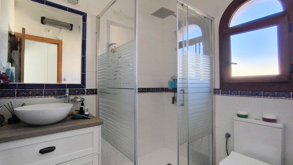 This superb link detached Ibiza-style villa is located in the prestigious La Finca Golf Resort, Algorfa. It enjoys a peaceful setting with beautiful open views and a desirable west-facing orientation. The villa sits on a low-maintenance plot with off-road parking for two cars and a private garage. The garage provides the only link to the neighbouring property, ensuring privacy and space. There is also ample room to add your own private swimming pool if desired. A side terrace catches the morning sun, perfect for breakfast outdoors. The villa’s interior has been thoughtfully modified to create a larger and more open living area. The bright lounge offers plenty of space to relax and entertain. The kitchen is separate and well equipped, with access to the garage. One of the ground-floor bedrooms is currently used as a dining room but can easily revert to a third bedroom. The stylish family shower room has been tastefully modernised. Another double bedroom completes this level. Upstairs, the master bedroom features an en-suite shower room and dressing area. From here, you can step out onto a large sunny terrace that’s ideal for dining, sunbathing, or admiring the countryside and distant sea views. Owners have access to a stunning communal pool area with panoramic views of the surrounding hills, salt lakes and Mediterranean Sea. The villa is sold partly furnished and includes air conditioning and gas central heating throughout. Bars and restaurants are just a five-minute walk away, while Ciudad Quesada is a seven-minute drive. The blue-flag beaches of Guardamar del Segura are only twenty minutes by car. Alicante Airport and Torrevieja’s health centres are both within easy reach.