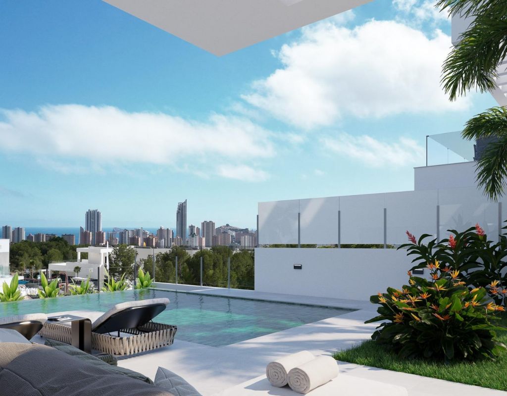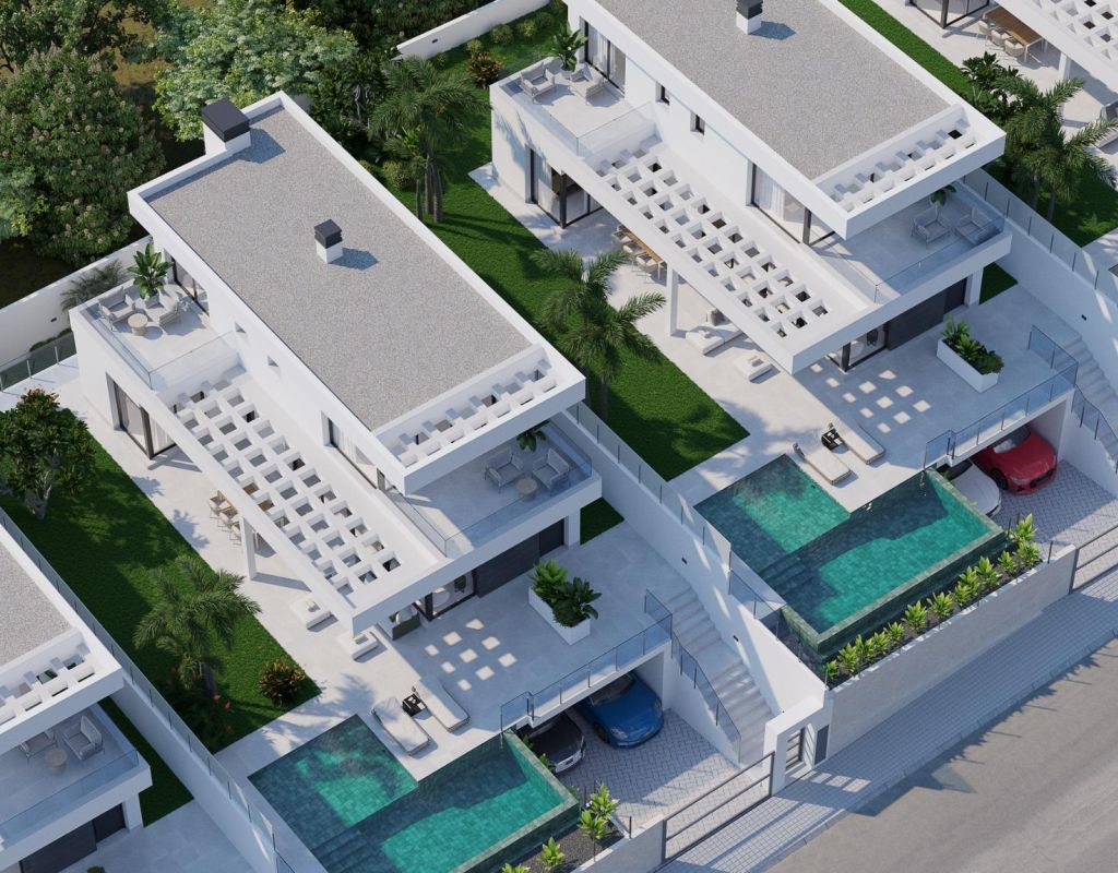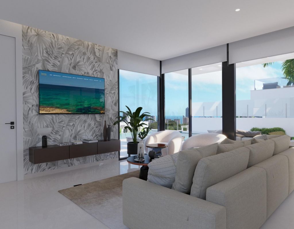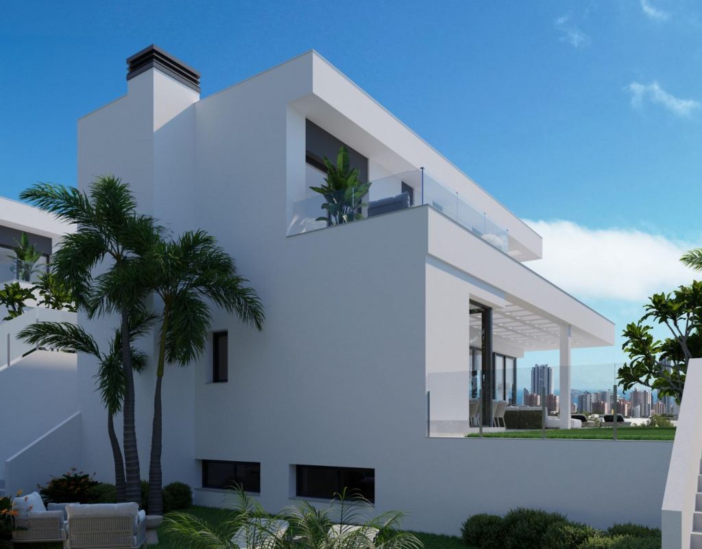 NEW BUILD VILLAS IN FINESTRAT WITH SEA VIEWS New Build Luxury villas in Sierra Cortina, Finestrat. Modern villas with 3 bedrooms and 3 bathrooms, open plan kitchen with lounge area, terrace with magnificent views over Benidorm, private garden with swimming pool, basement, parking and storage room. Villas build with top quality materials. Finestrat located in the Marina Baixa region of the Costa Blanca, close to neighbouring Benidorm and about 40 kilometres from the city of Alicante and the international airport. The village is situated on the mountainside of Puig Campana and offers beautiful views of the mountains, the coast and the Mediterranean Sea. Benidorm is just a five-minute drive from the properties and offers all the services you would need including shops, bars, restaurants, supermarkets, banks, pharmacies and several private international schools.