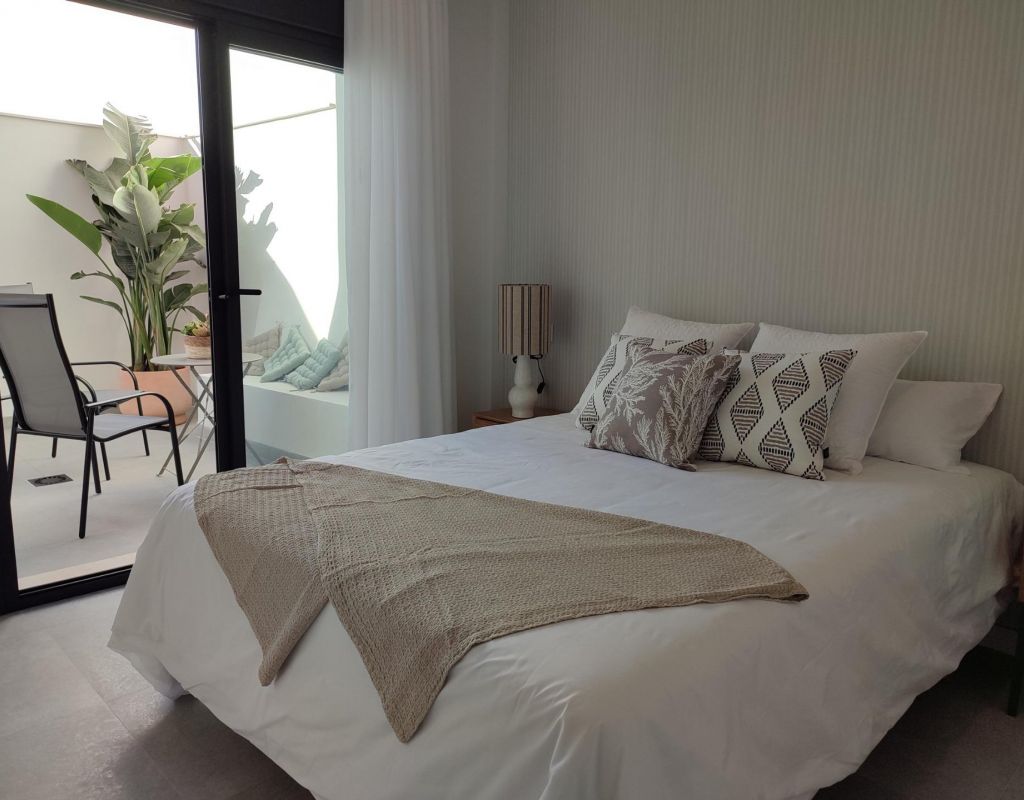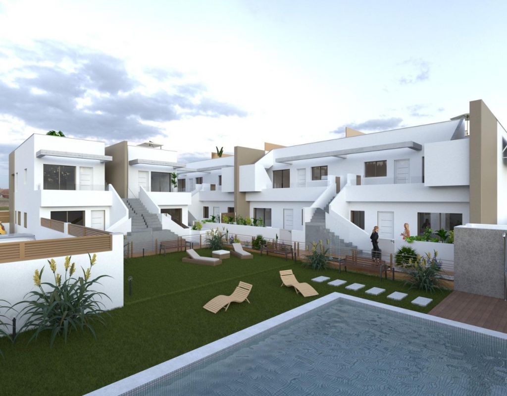NEW BUILD BUNGALOWS IN PILAR DE LA HORADADA New Build developmen located in an unbeatable location, in the centre of Pilar de la Horadada. An area that offers all the necessary services and amenities, such as supermarkets. Additionally, its proximity to the beach makes it an ideal option for your leisure time and Summer getaways. This residential complex is characterised by its 12 bungalow apartments, which offers 1 bedroom and 1 bathroom properties at a very affordable price, 2 bedroom and 2 bathroom properties and also 3 bedroom and 2 bathroom properties, to cover the needs of each client, offering comfort and style. The interiors, elegant and functional, have fully equipped kitchens including electrical appliances. The bathrooms have a vanity unit with washbasin and light. Each property has pre-installation for ducted air conditioning, a magnificent solarium for the upper floors and an attractive communal swimming pool area, making it the perfect place to enjoy and relax. Excellent location, 5 minutes from the sandy beaches and most prestigious 18-hole Lo Romero golf course. Pilar de la Horadada is a typical Spanish village in the most southern part of the Costa Blanca. The large main street has supermarkets, lots of shops, restaurants and bars and some lovely squares. The beautiful beaches of Torre de la Horadada and Mil Palmeras with fine sand promenade is just 5 minutes away. The airports of Corvera (Murcia) and Alicante are respectively 40 and 55 minutes away.